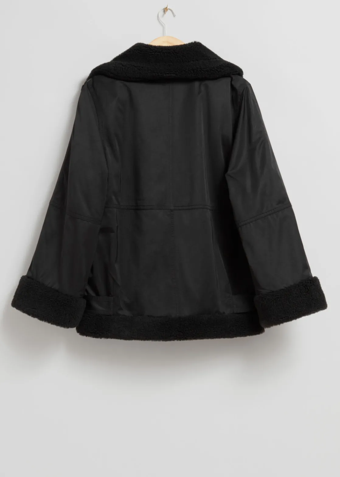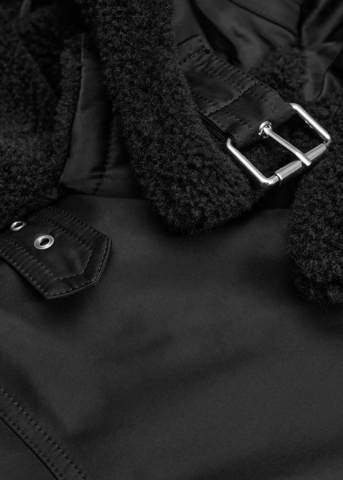 Relaxed aviator jacket featuring a buckle belt and faux shearling trimming at the collar, cuffs and hemline.