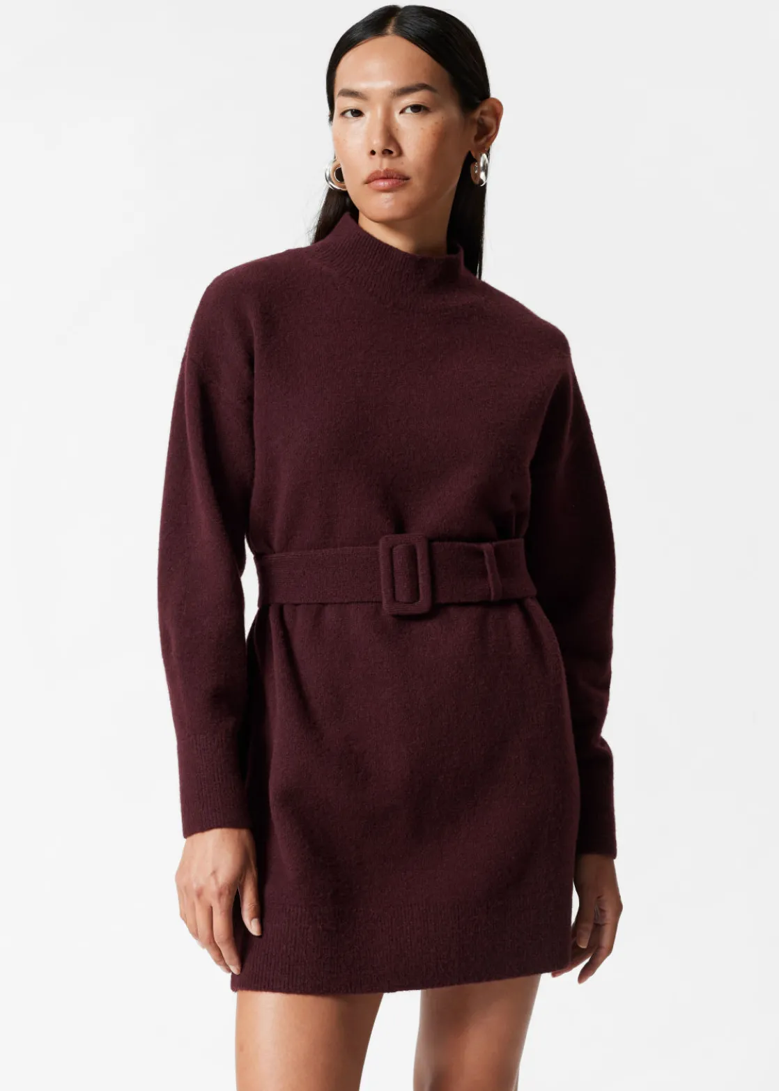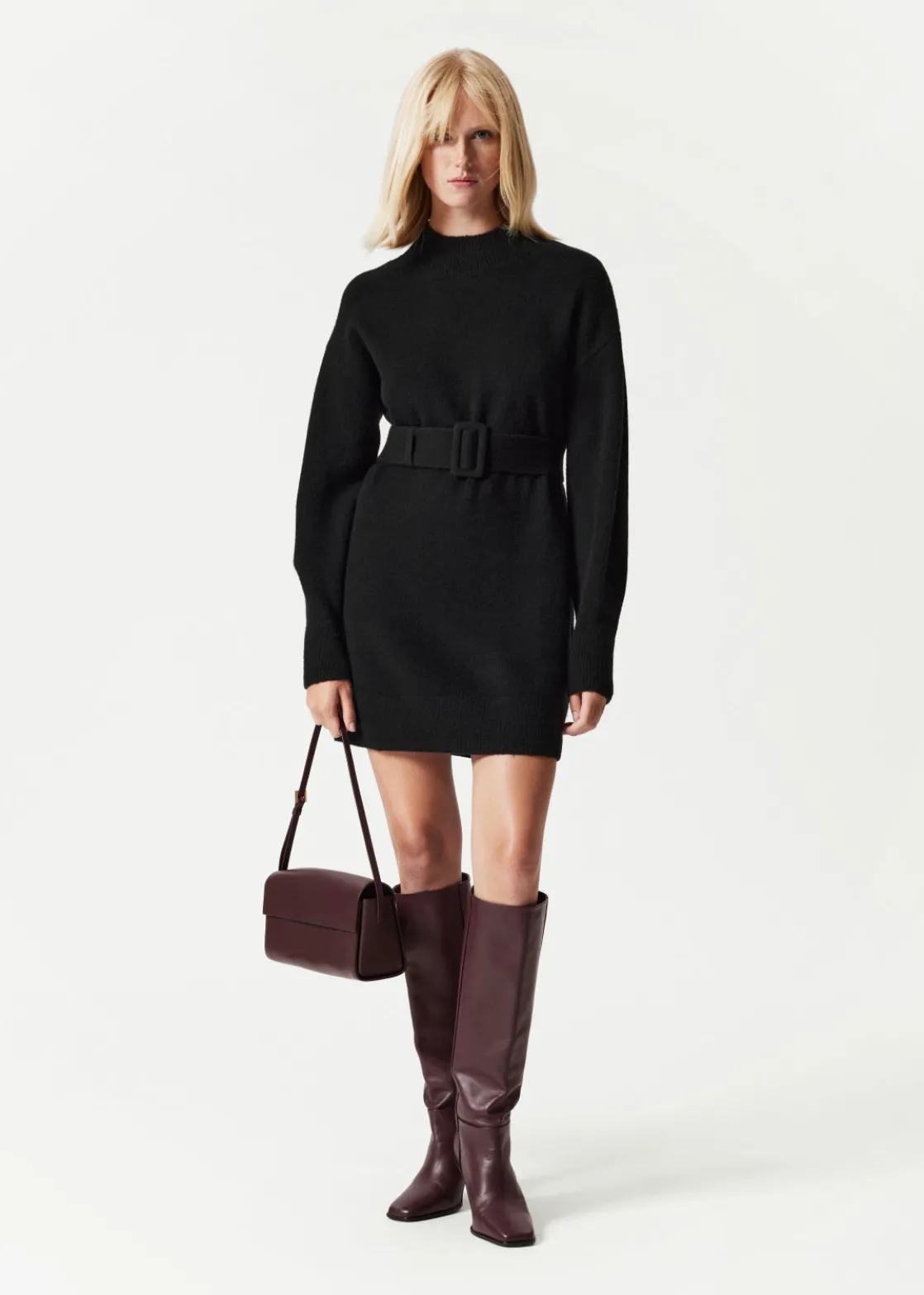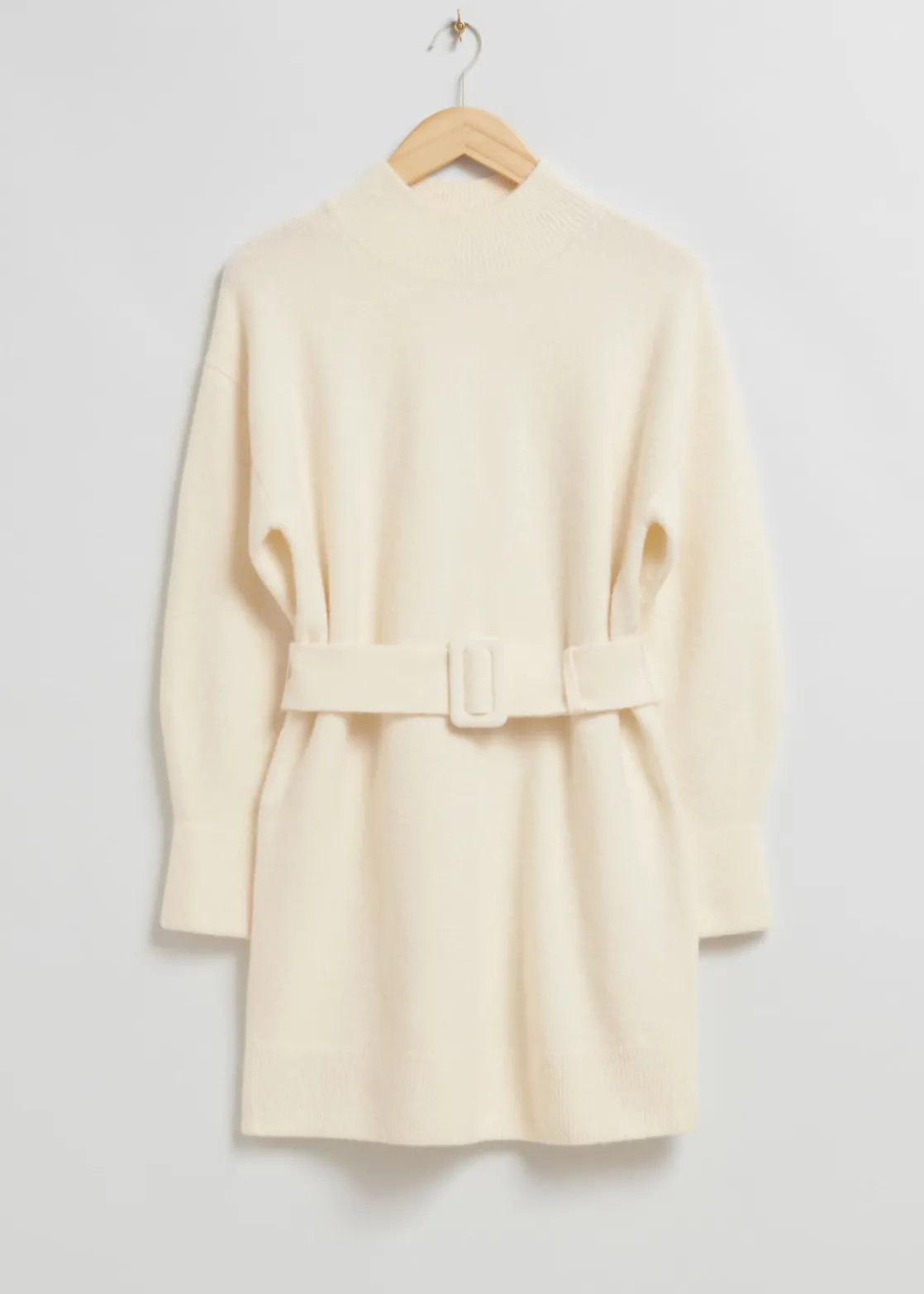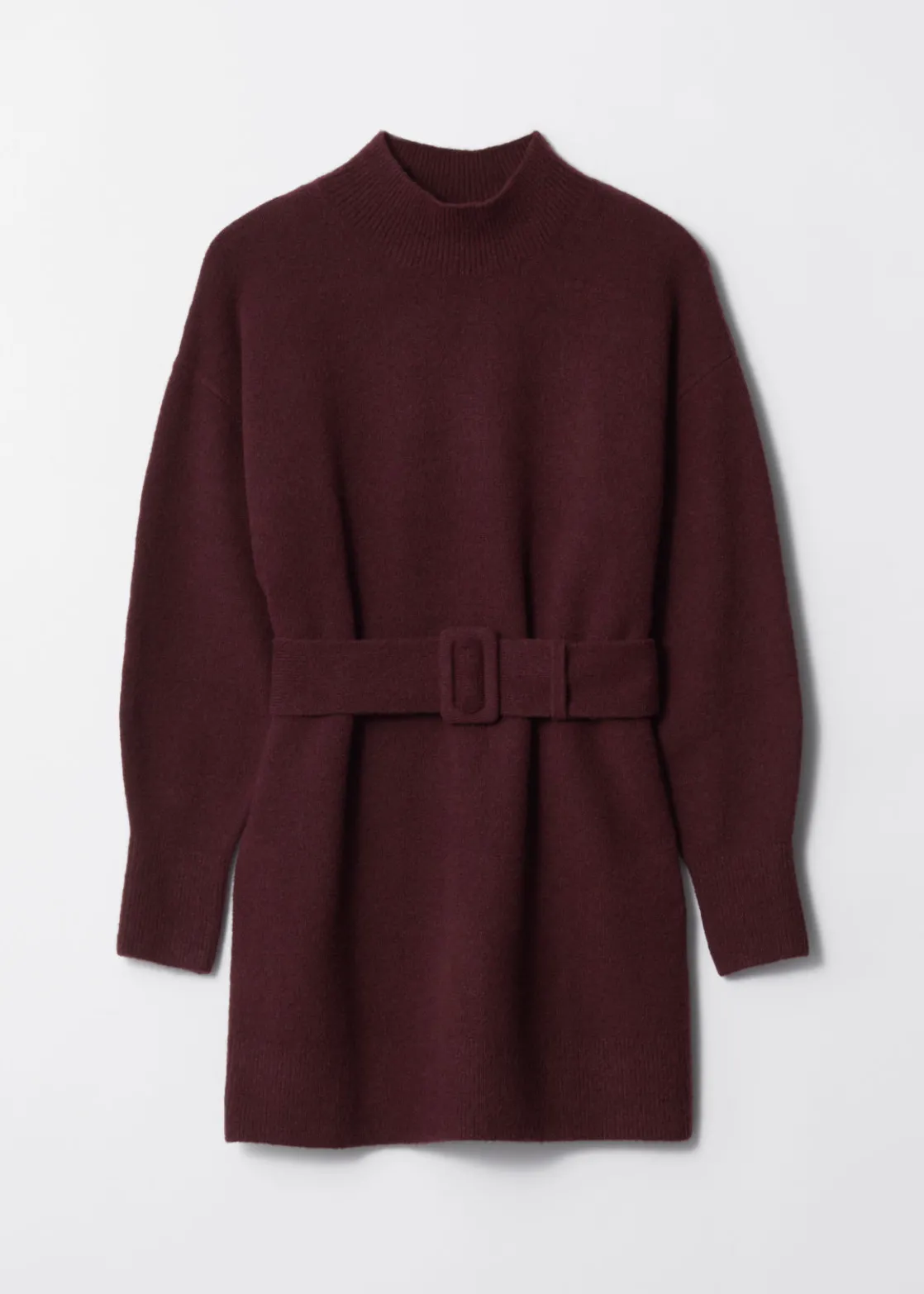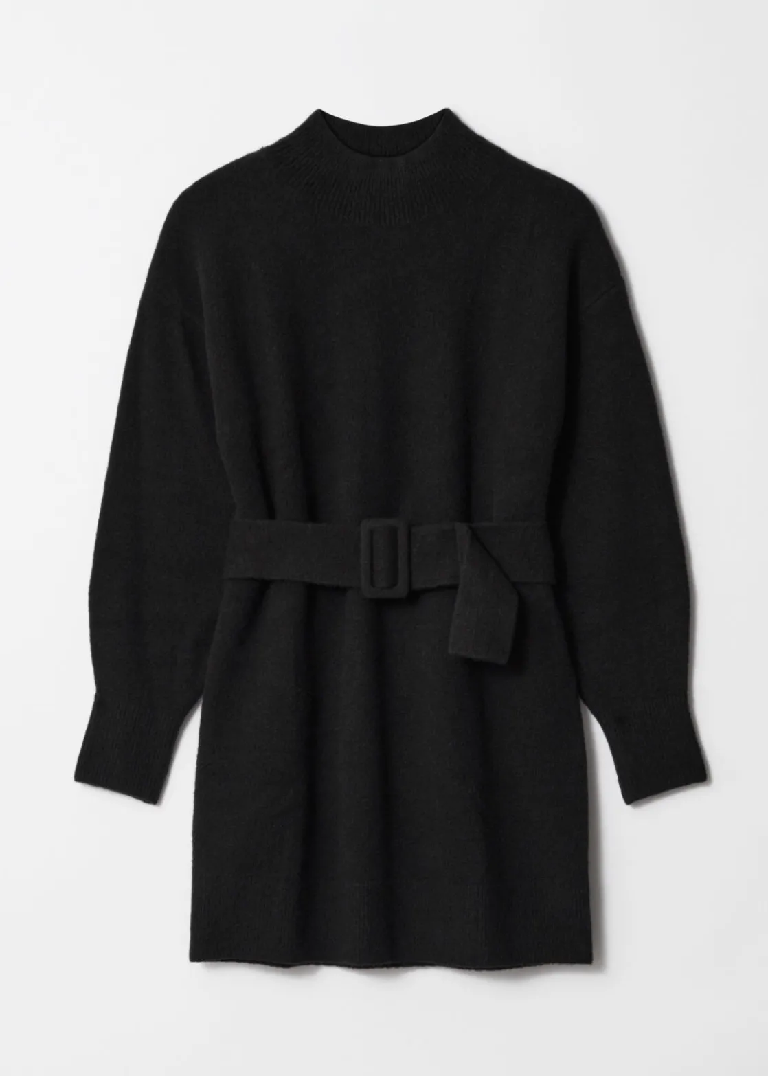 Relaxed mini knit dress featuring a mock neck and a tonal buckle belt.
