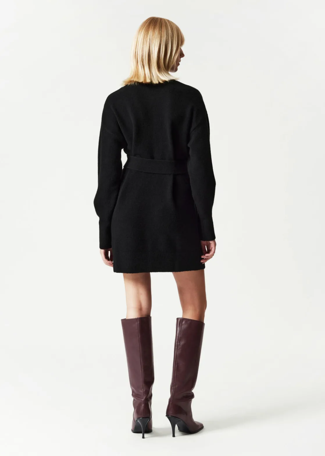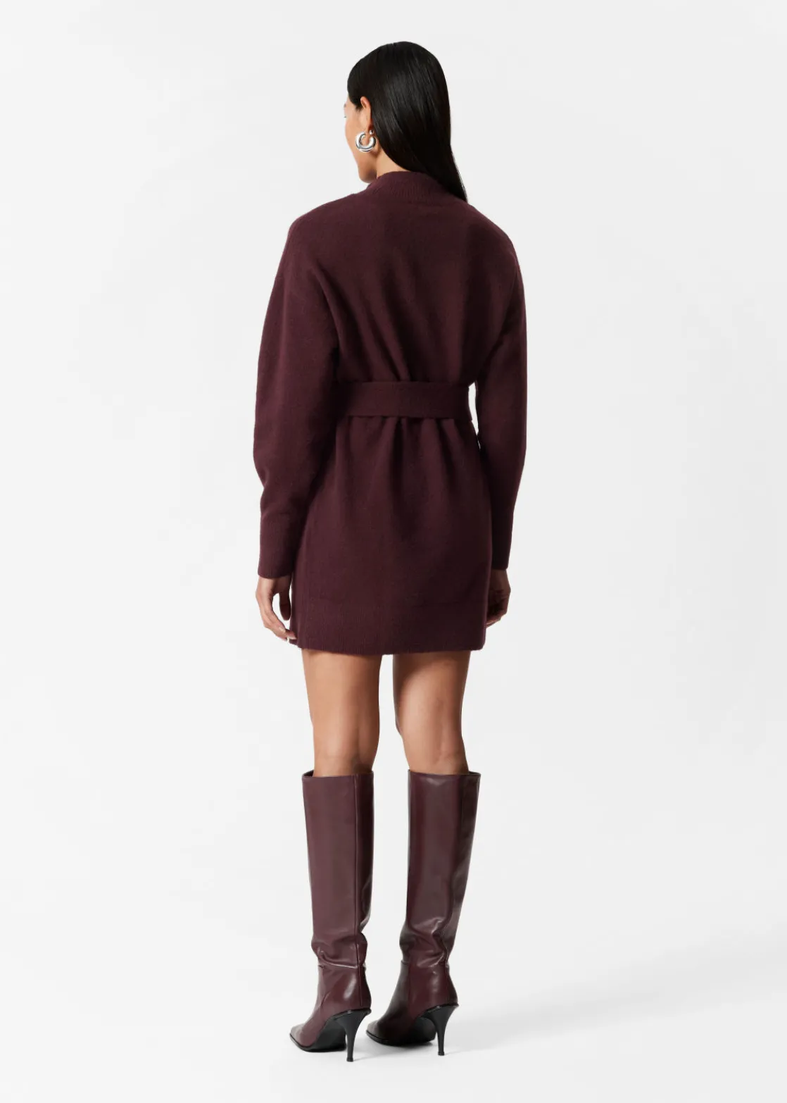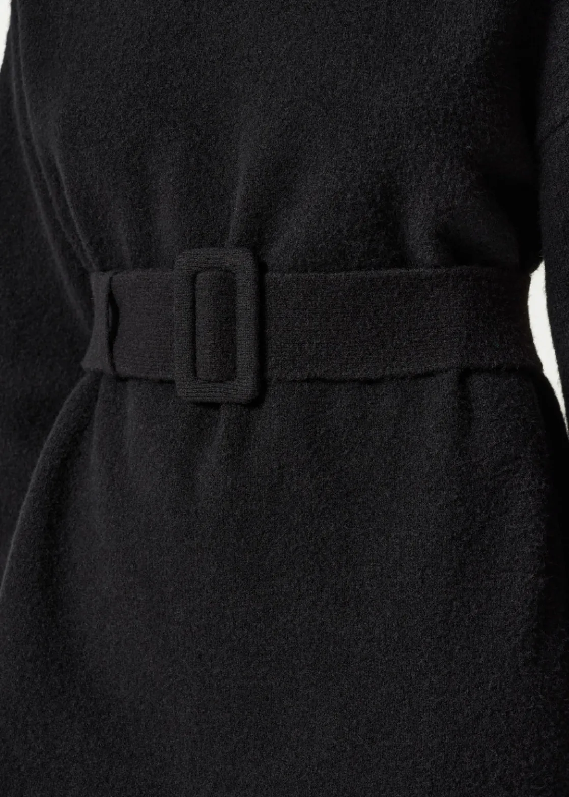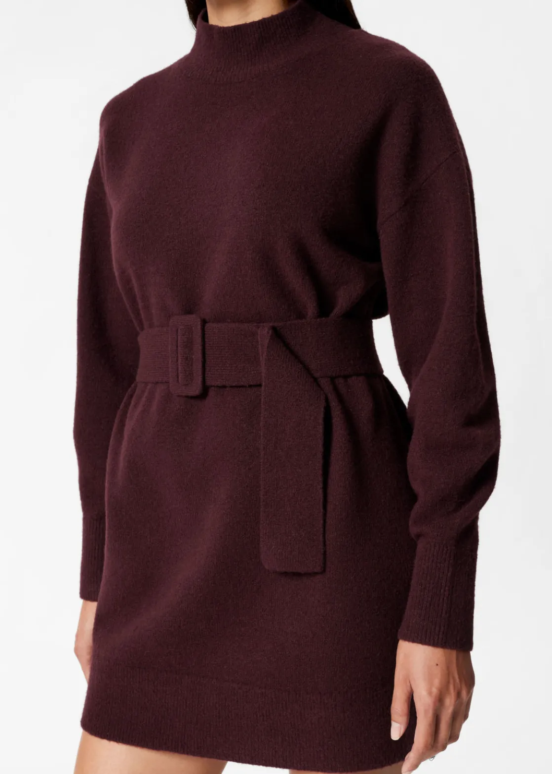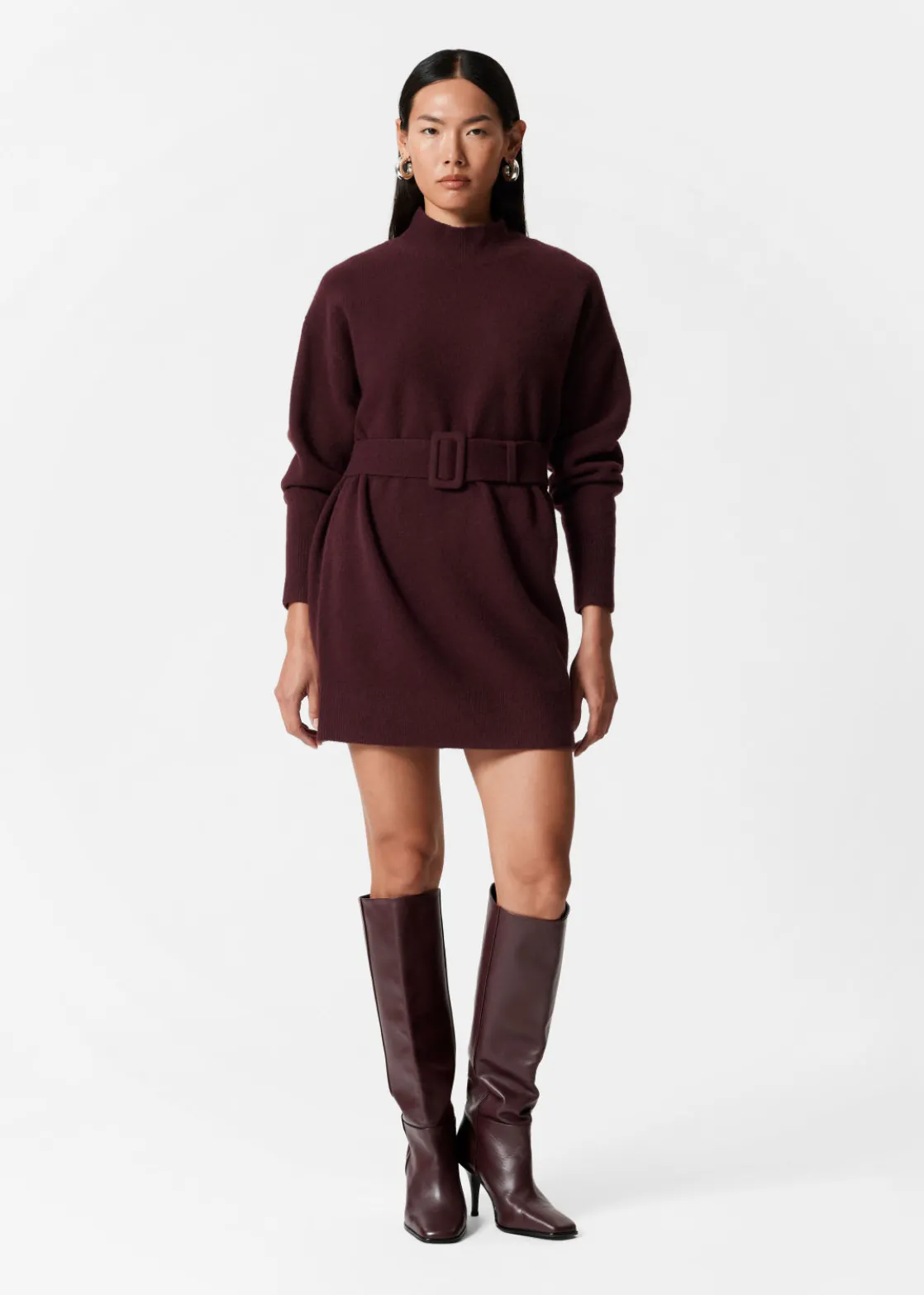 Relaxed mini knit dress featuring a mock neck and a tonal buckle belt.
