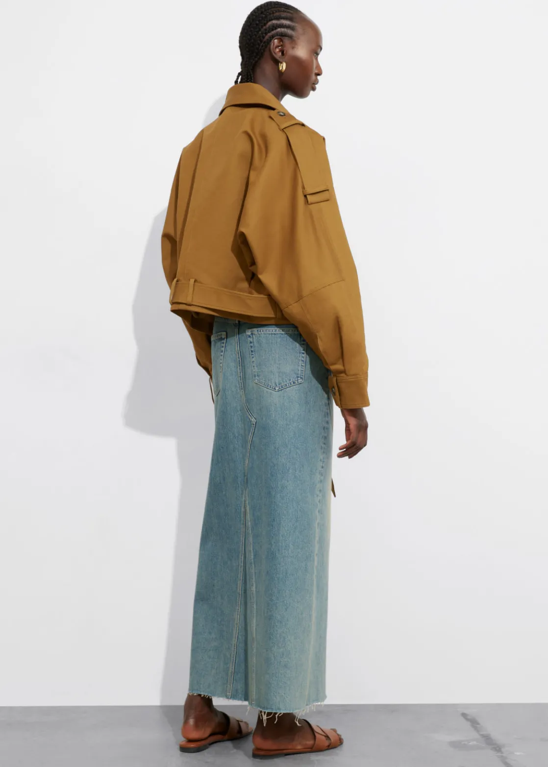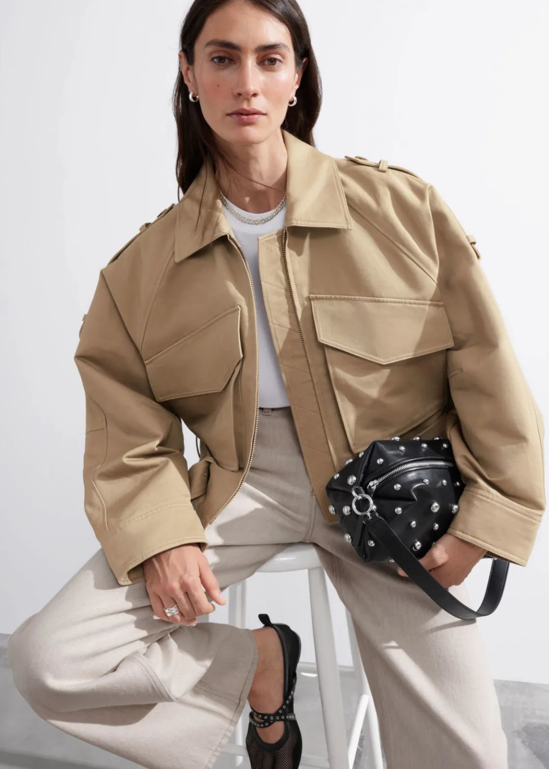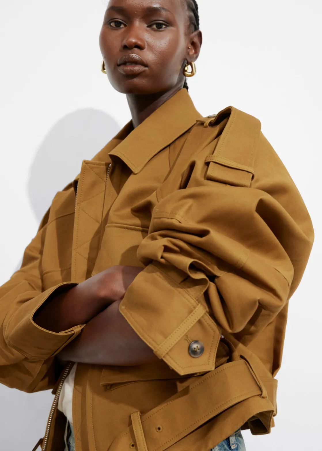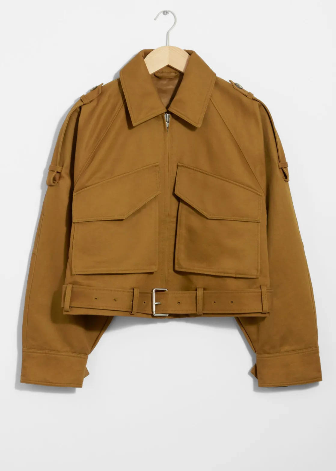 Cropped zip jacket featuring shoulder epaulettes, duo patch pockets and a buckle belt at the waist.