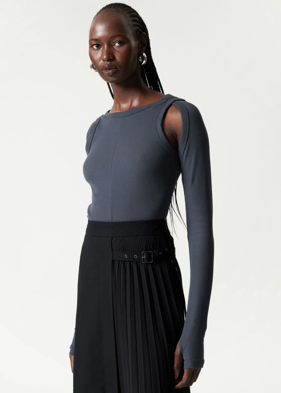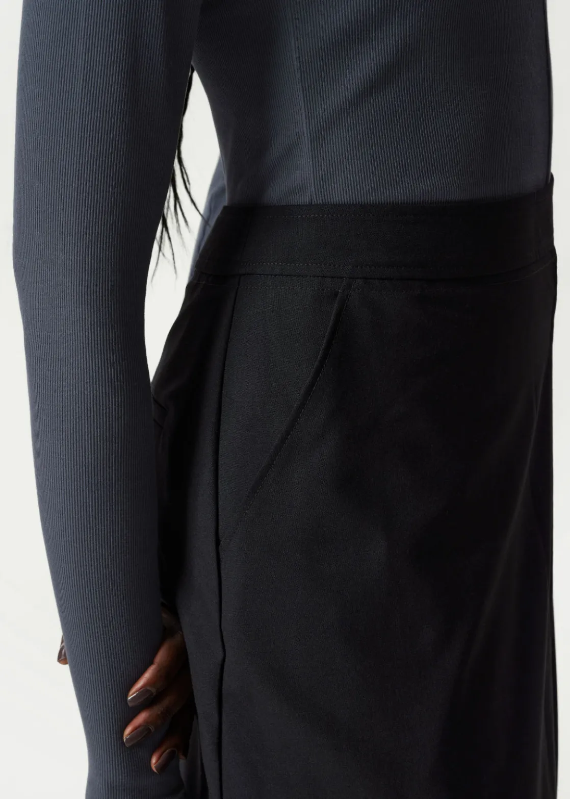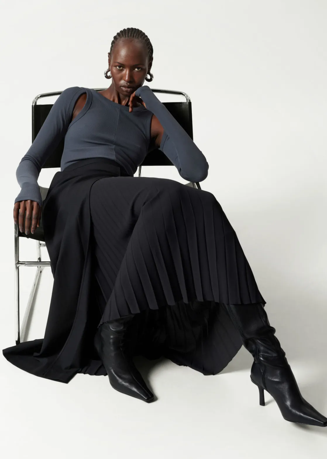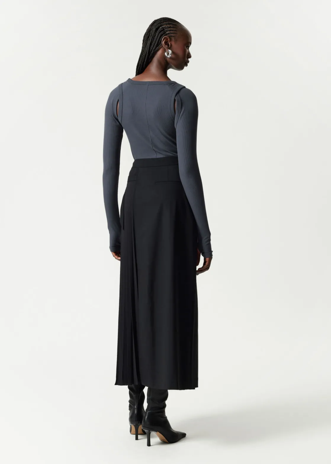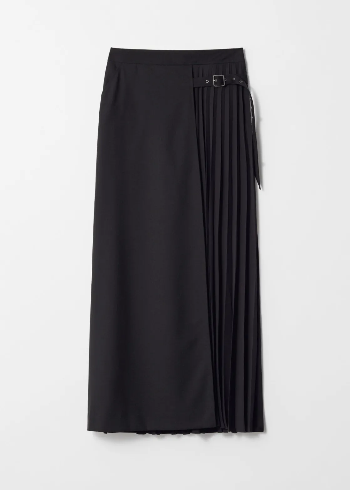 Tailored maxi skirt featuring a pleated detail, adjustable belt buckle and a welt pocket at the back.