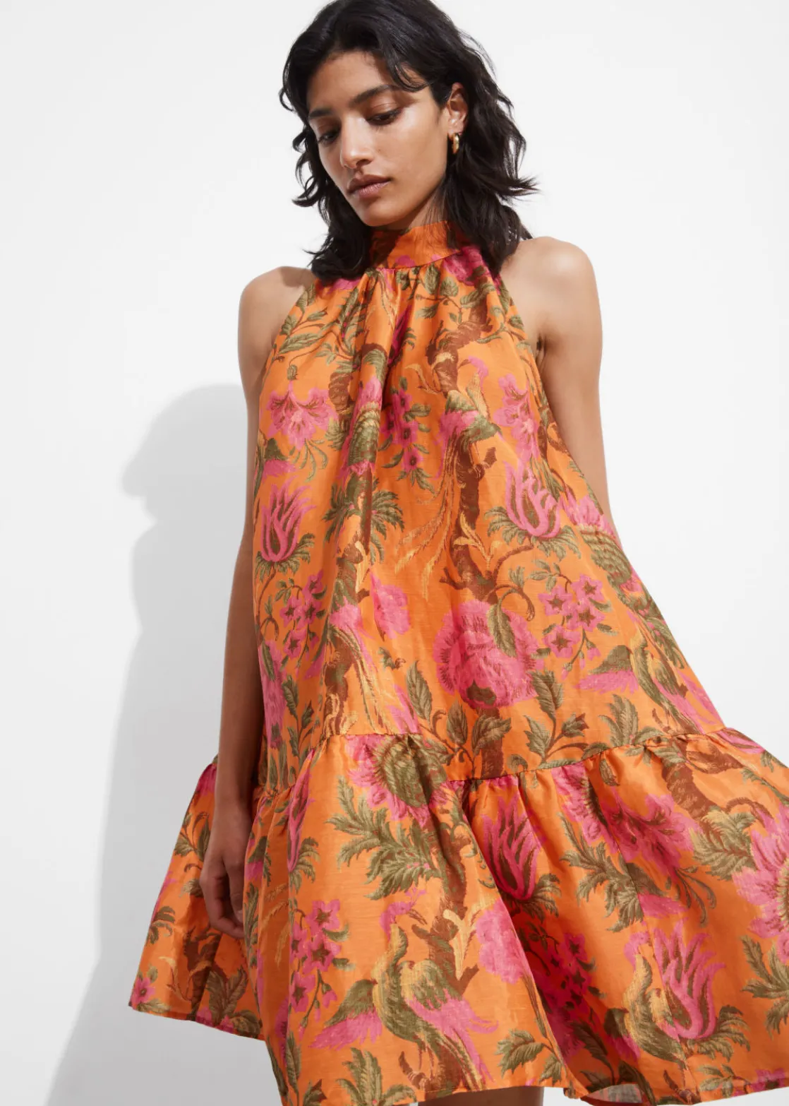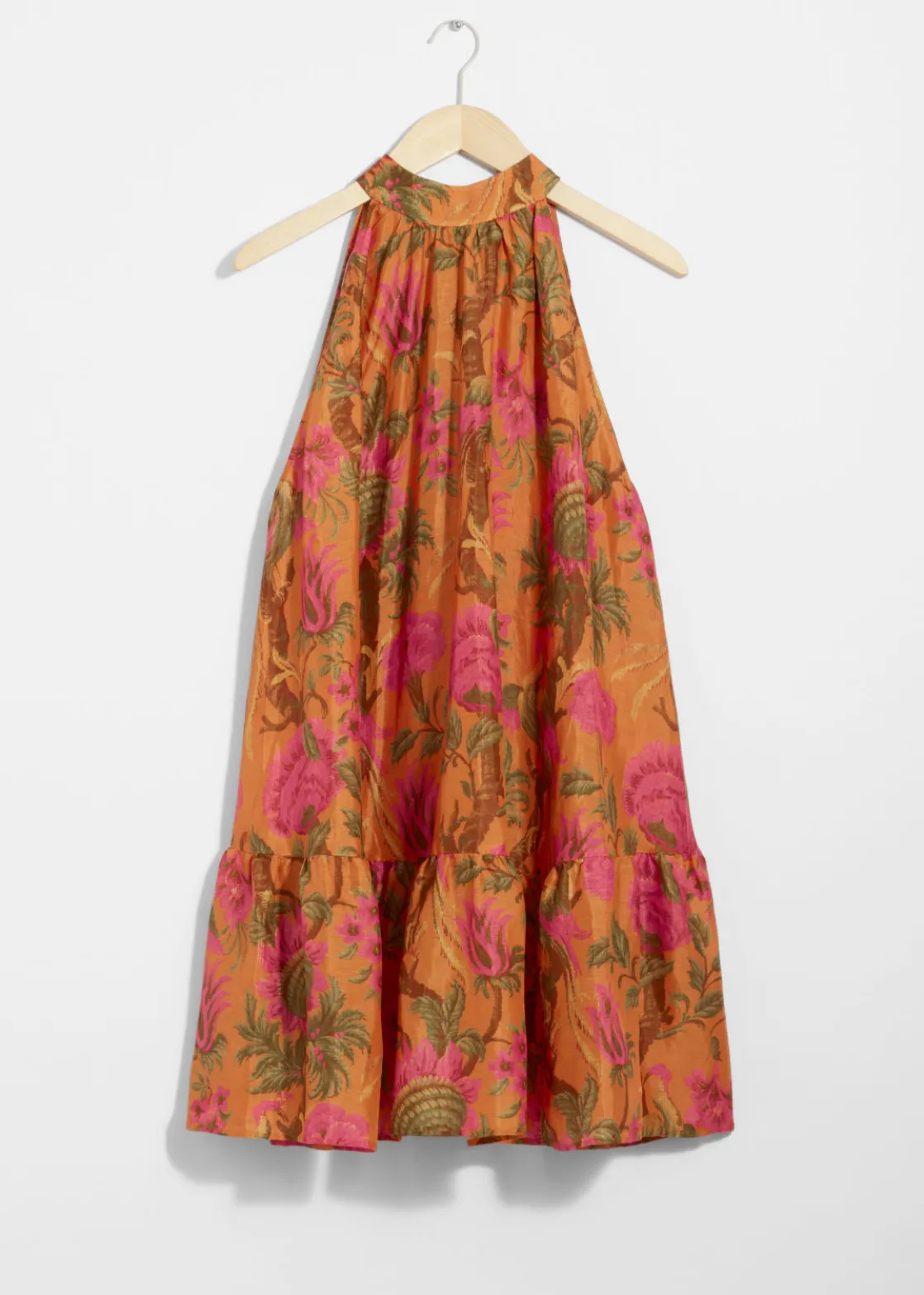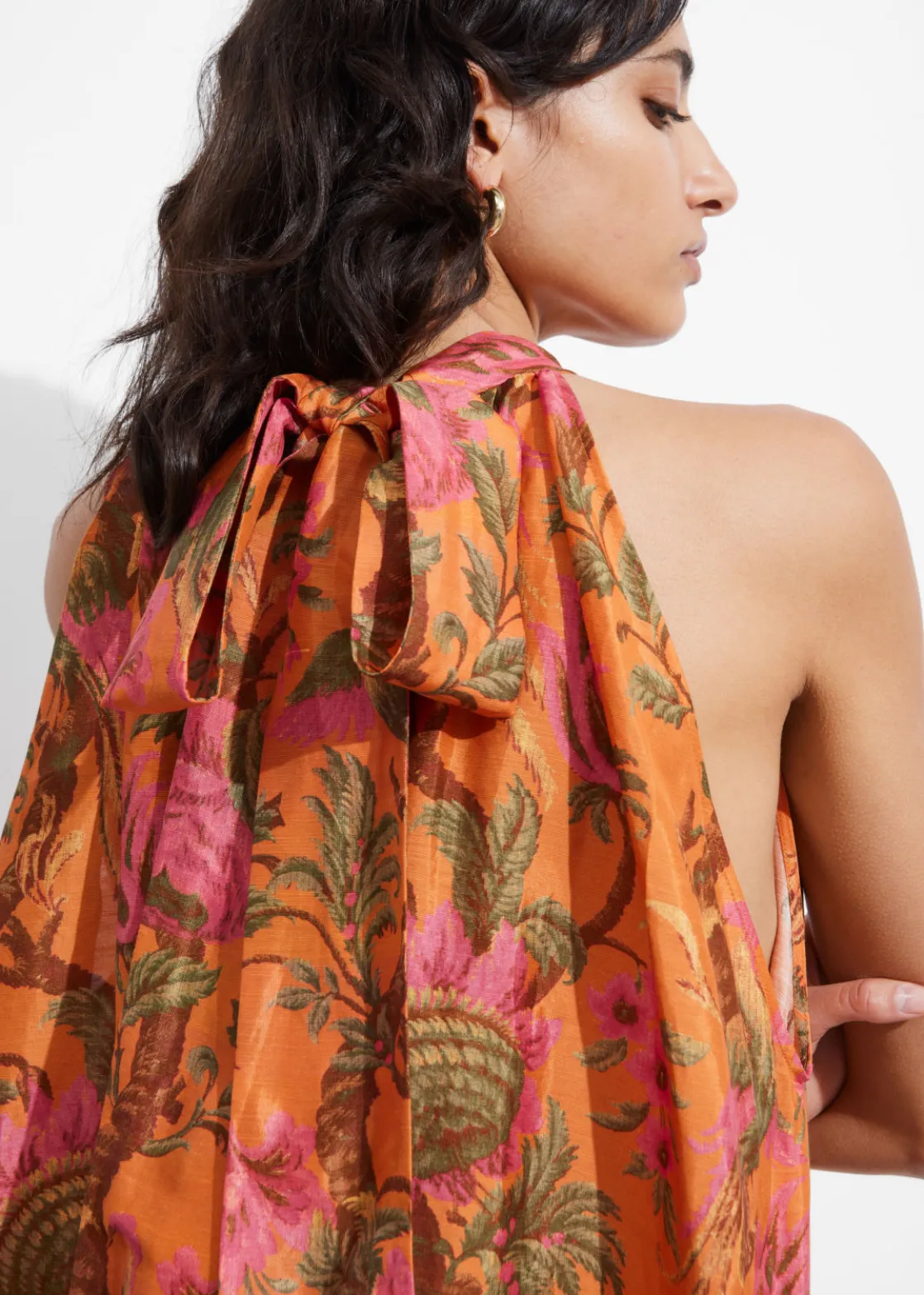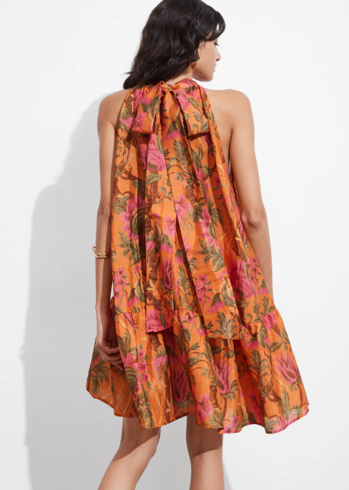 Sleeveless A-line halterneck mini dress adorned with a large bow at the neck. Finished with a gathered skirt.