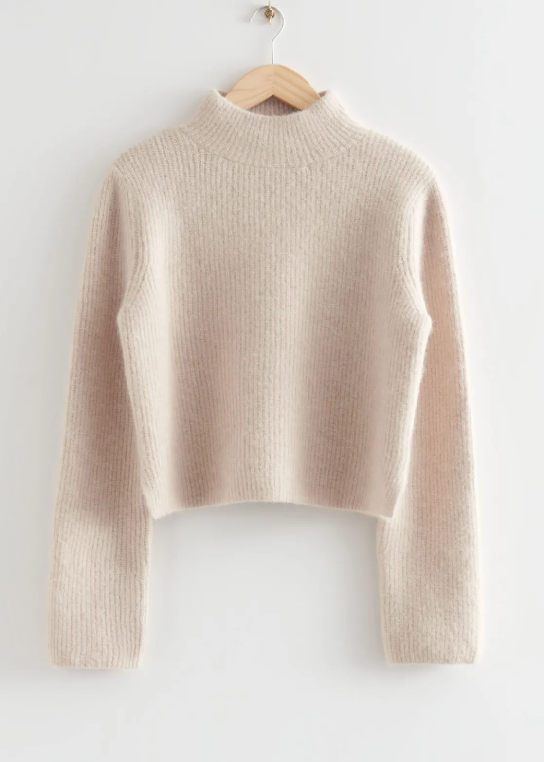 Boxy short-length knit sweater in an alpaca and wool mix, featuring a turtleneck collar and all over ribbed finish.