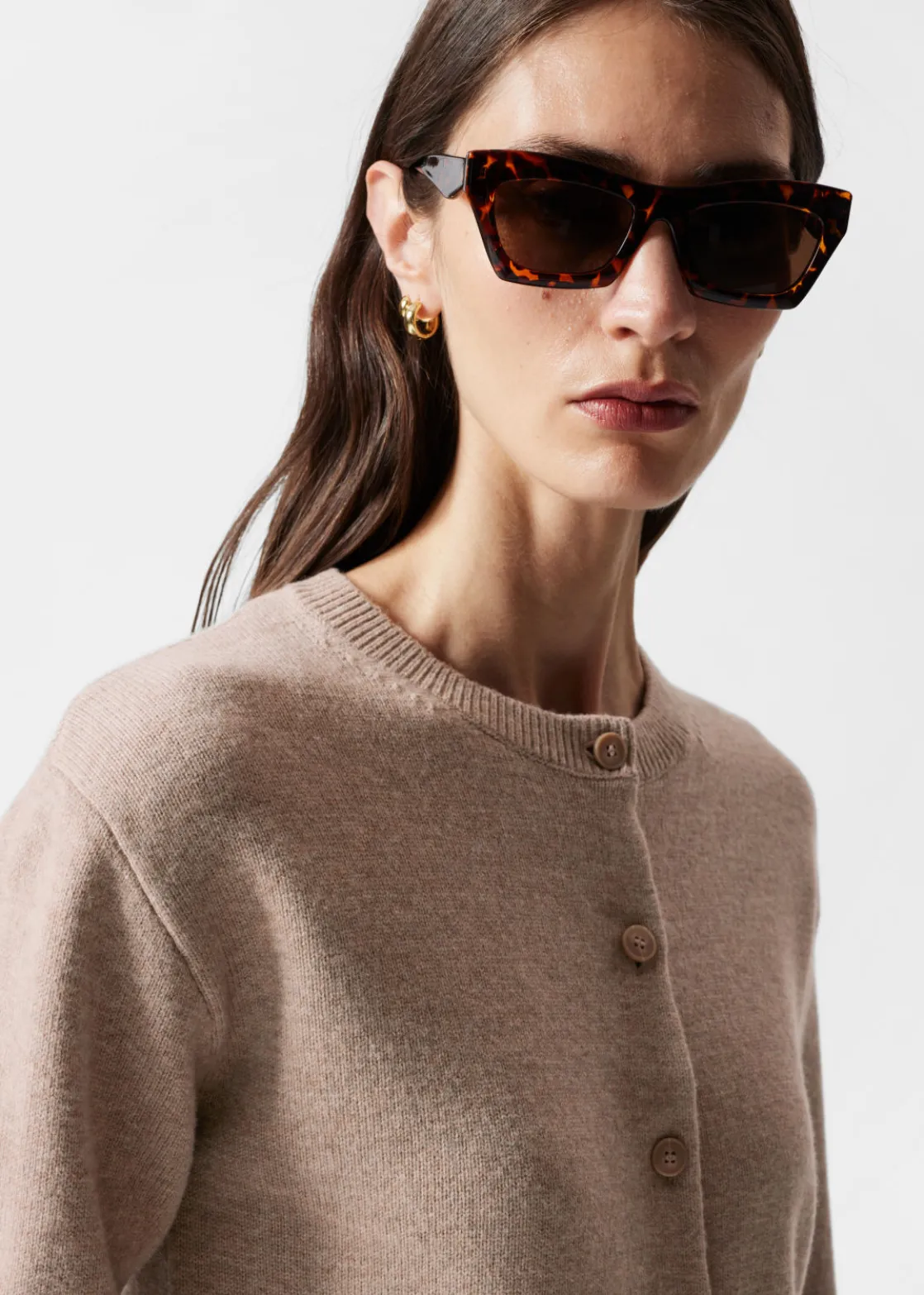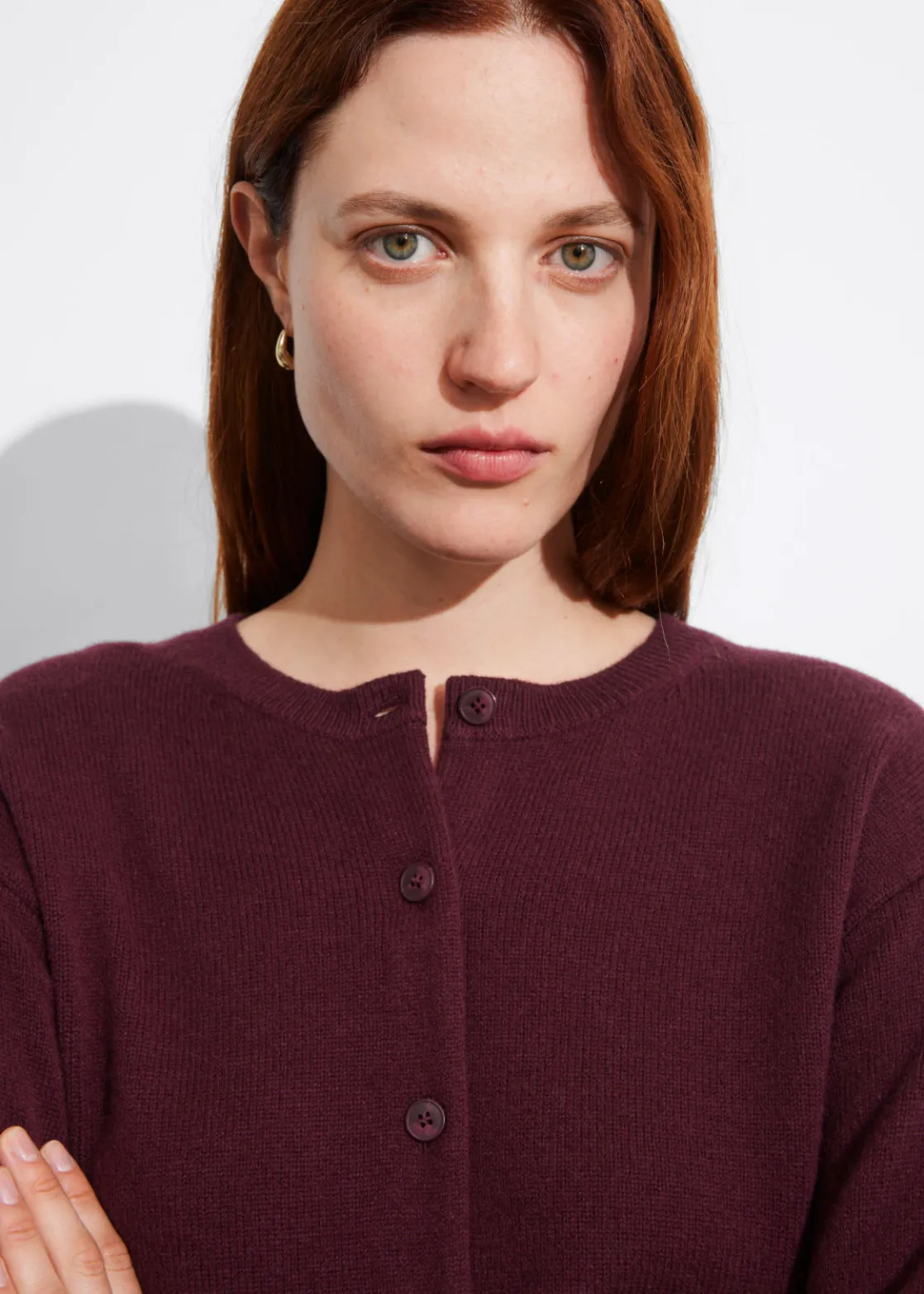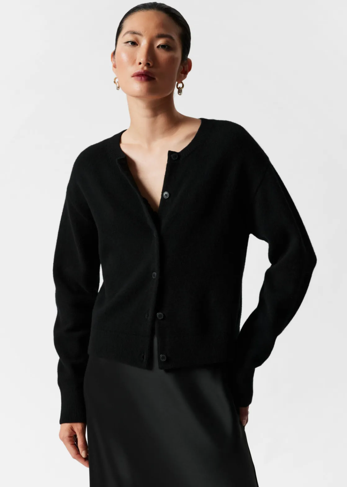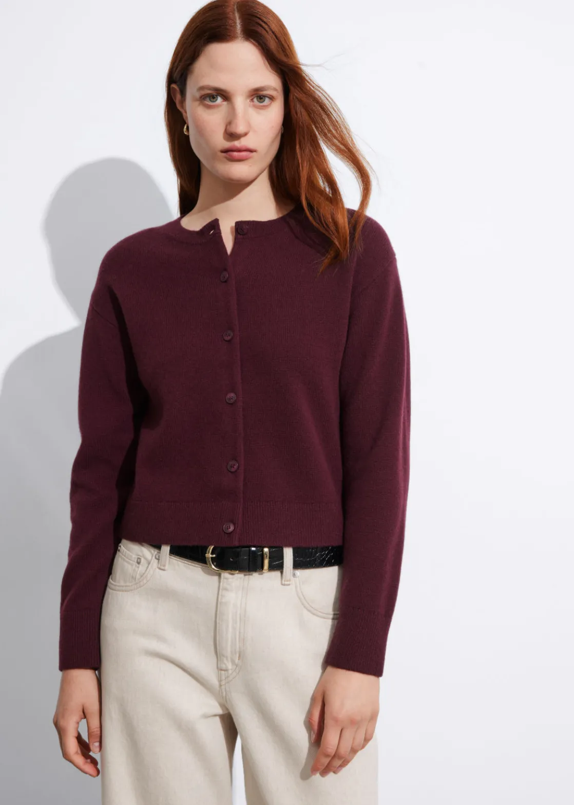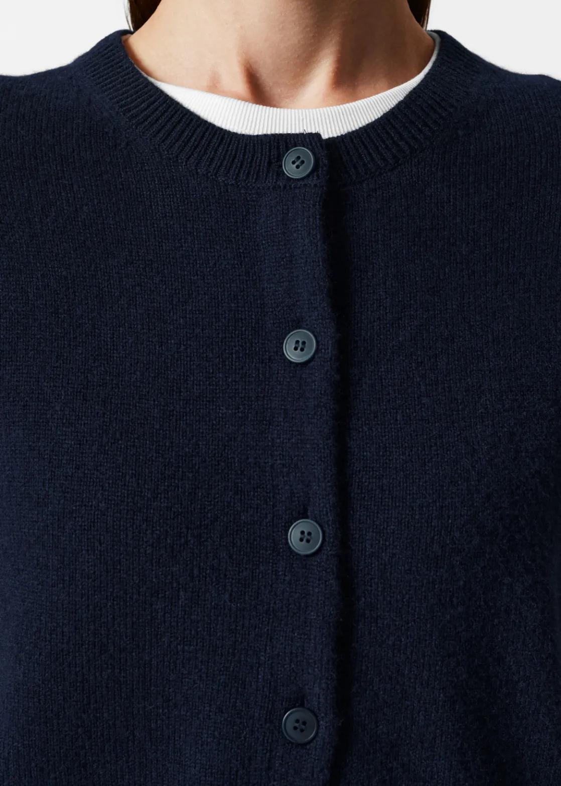Boxy merino wool cardigan finished with a ribbed neckline, cuffs and hemline.