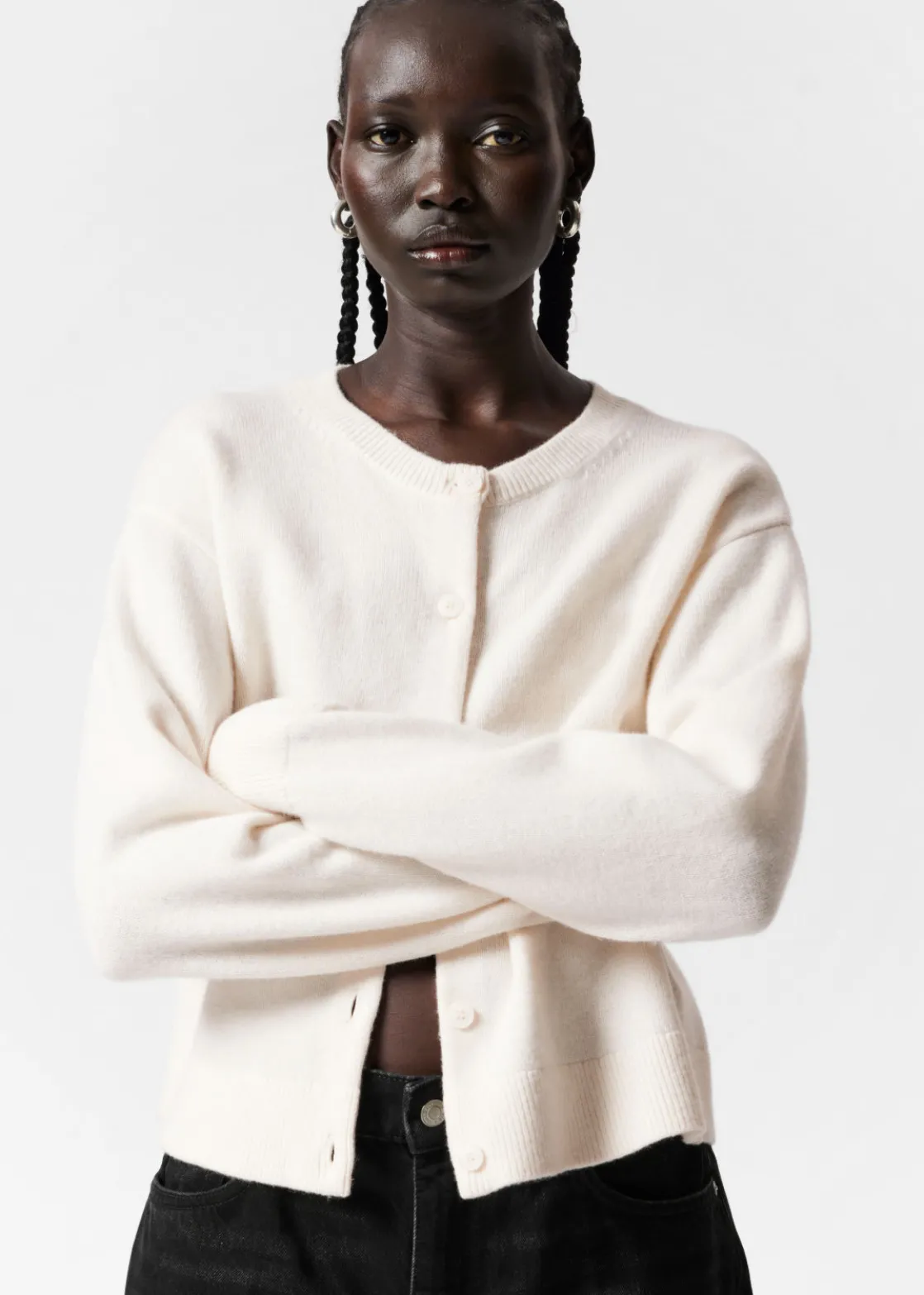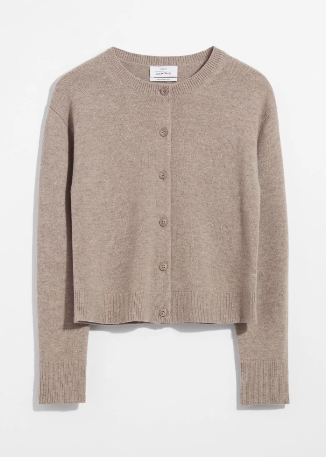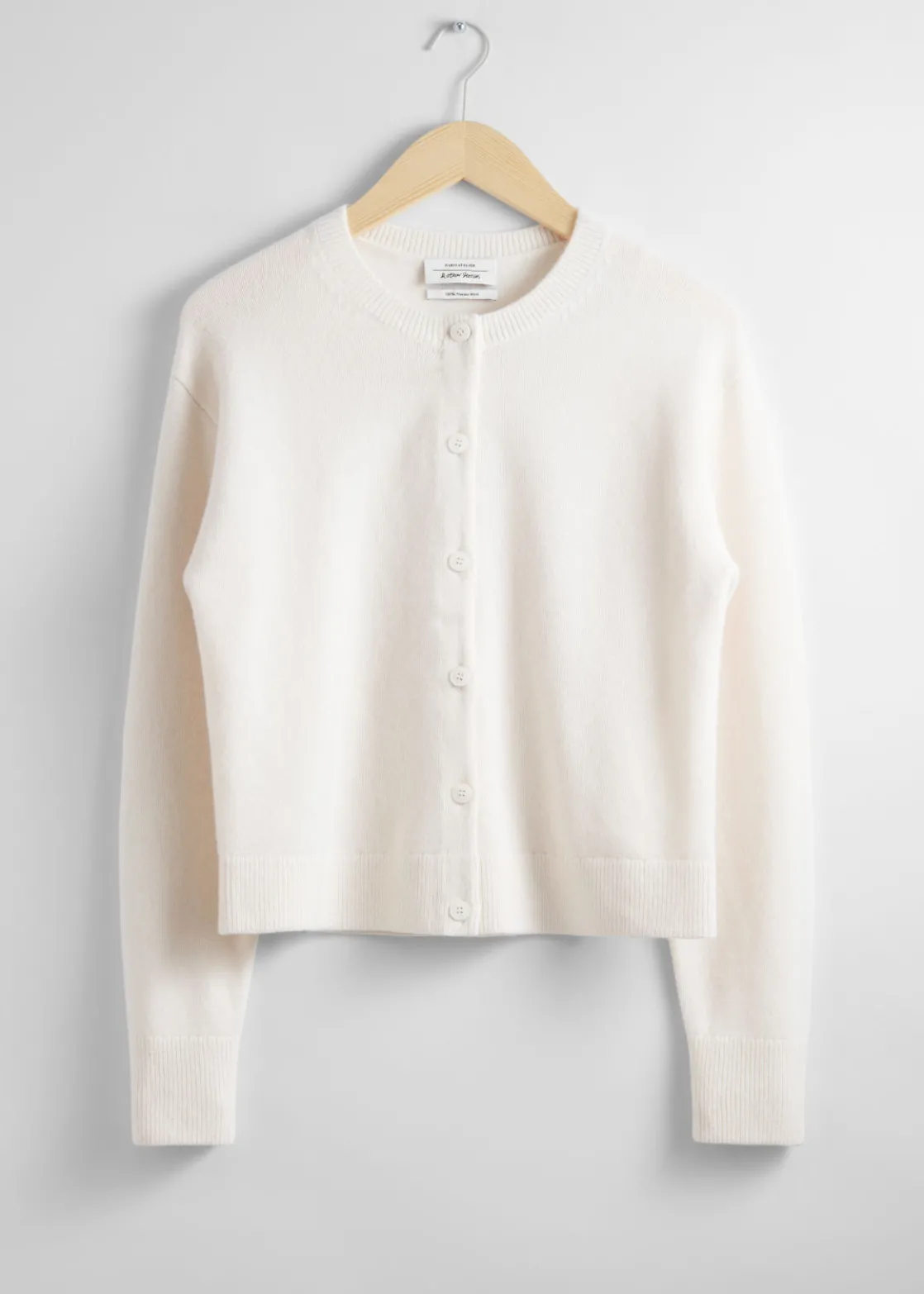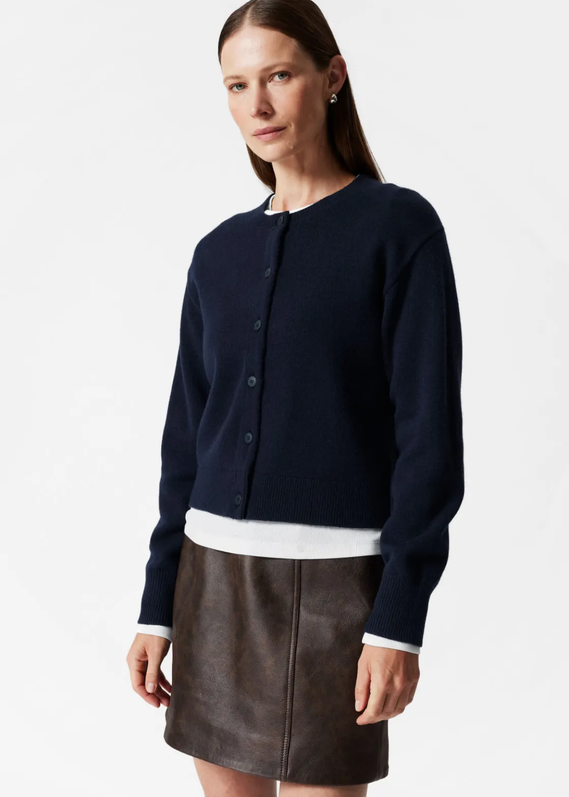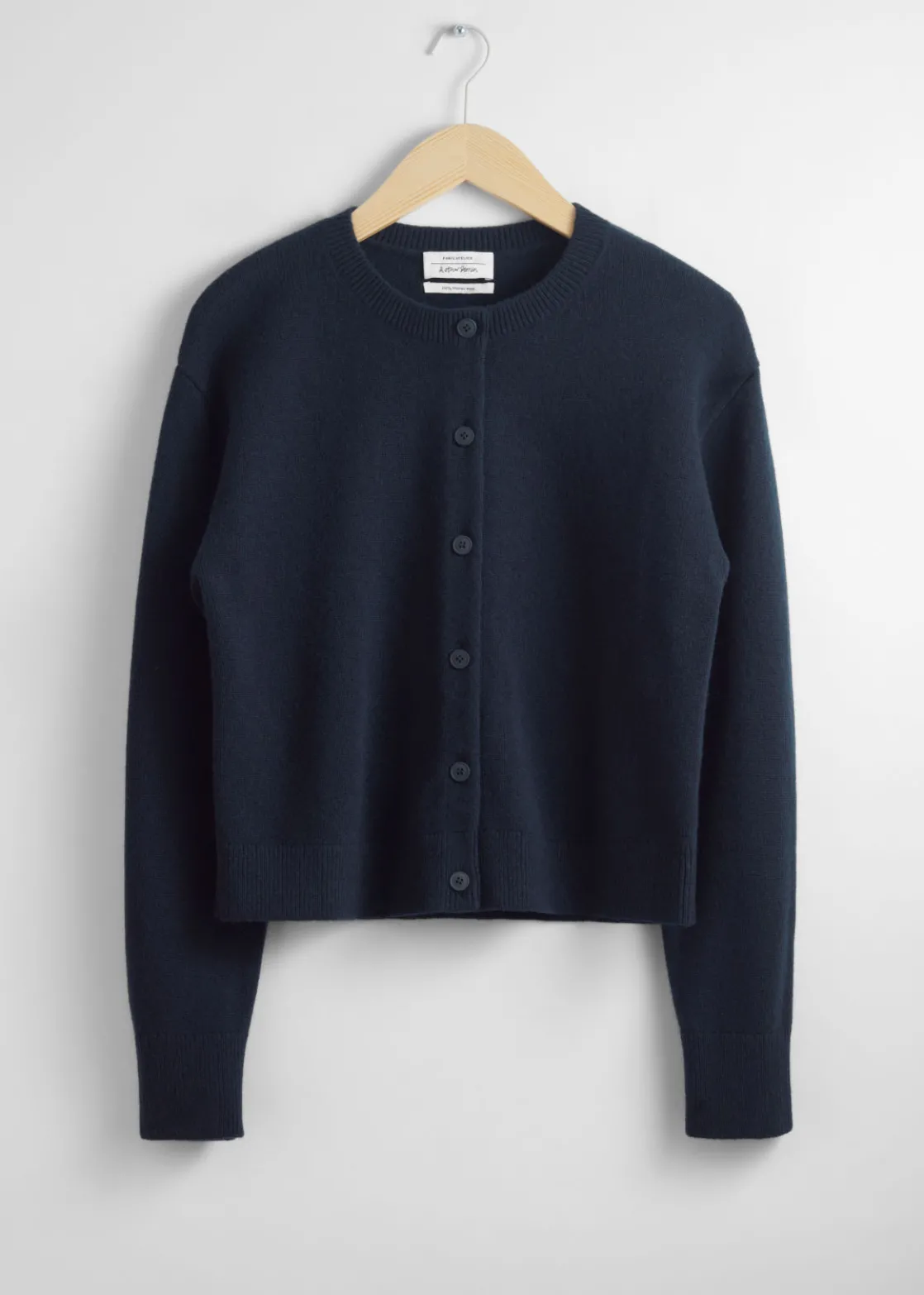 Boxy merino wool cardigan finished with a ribbed neckline, cuffs and hemline.