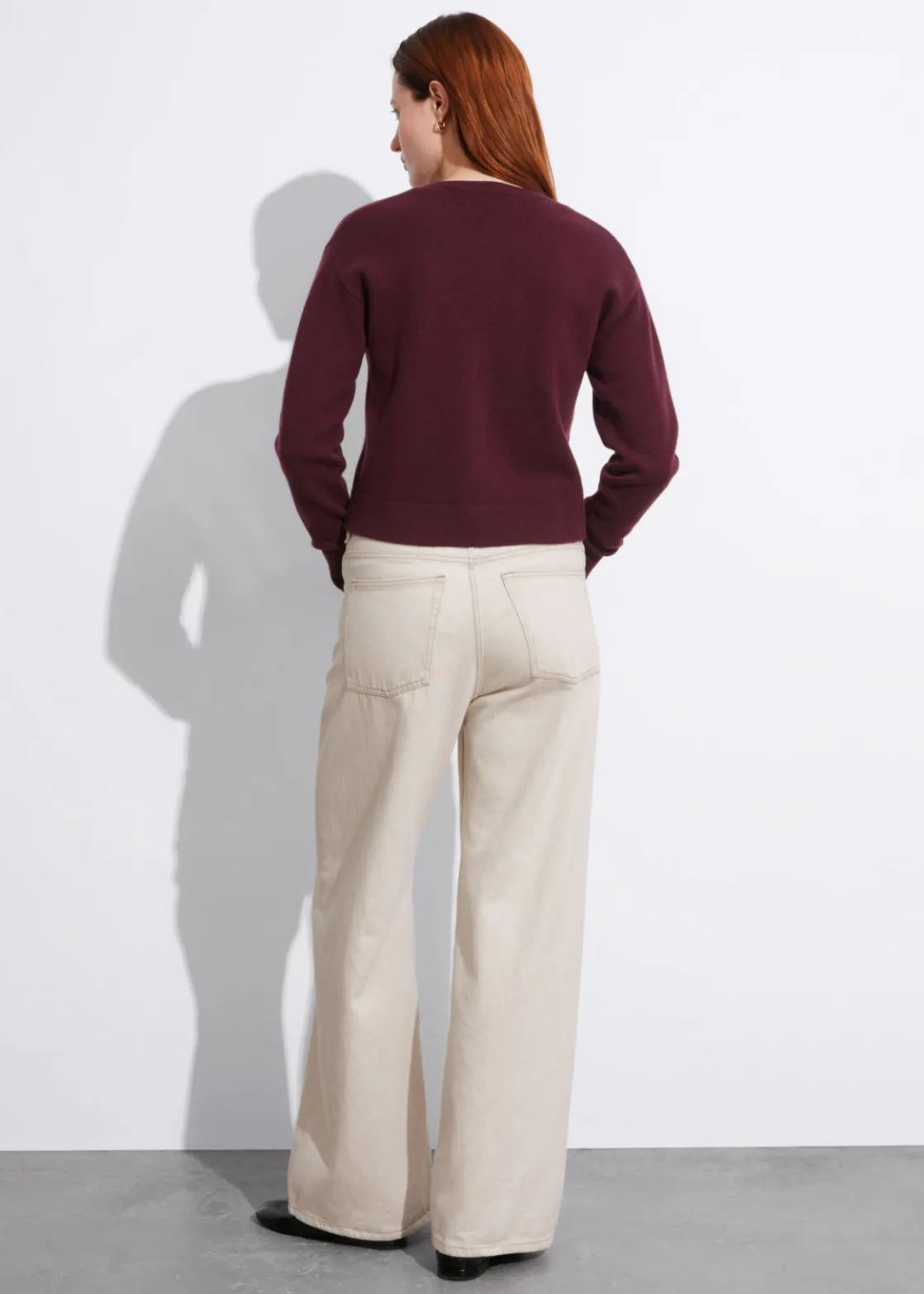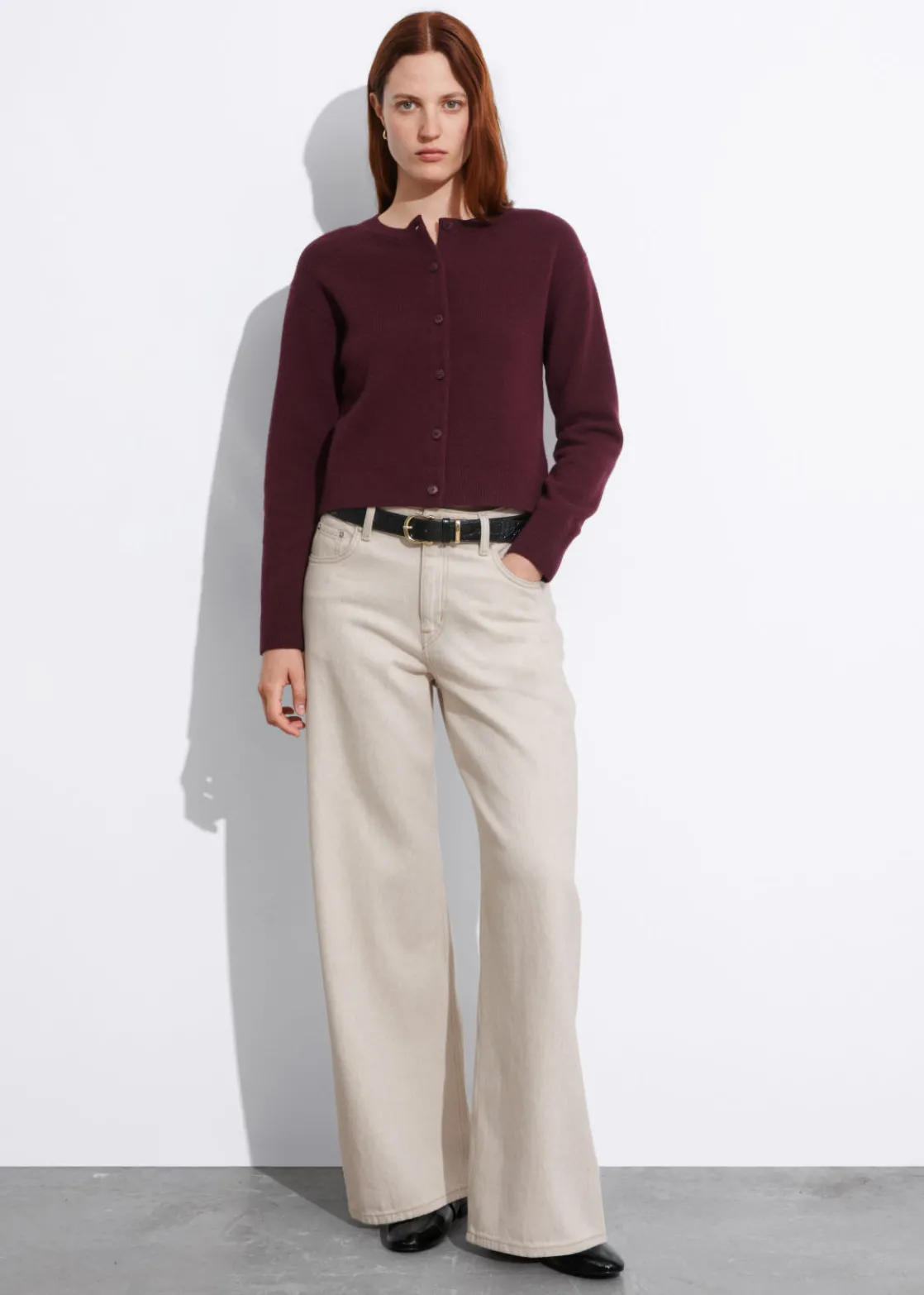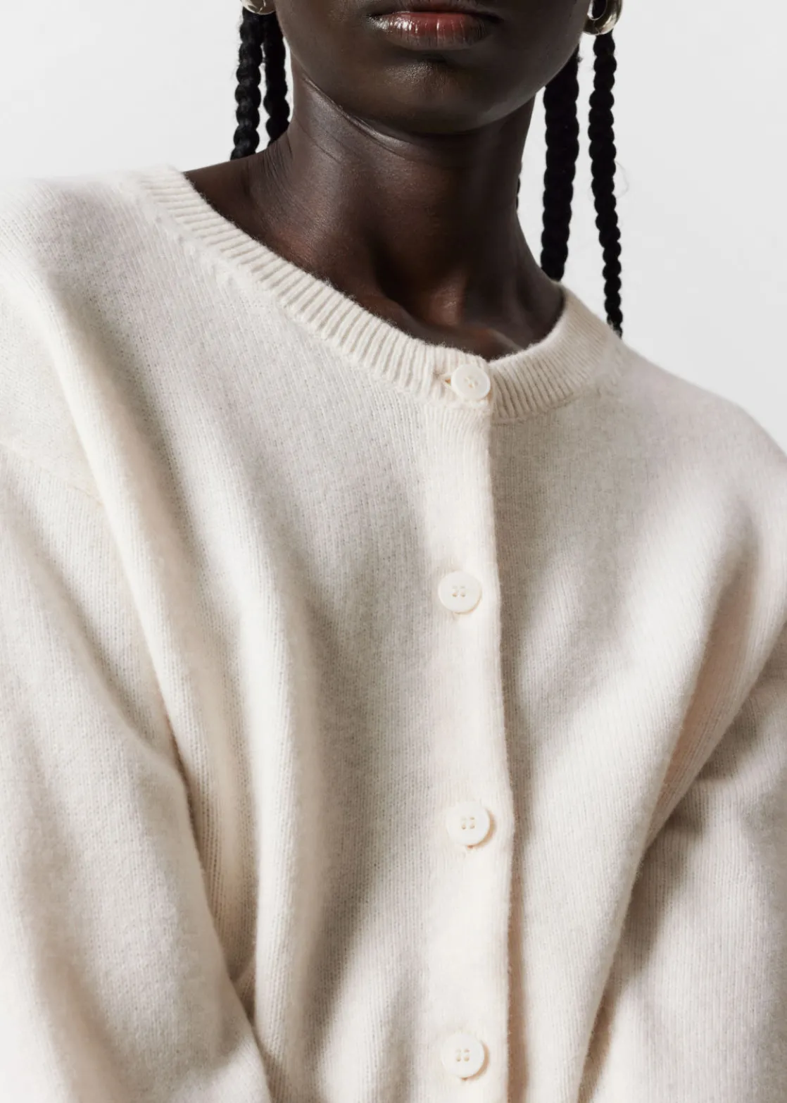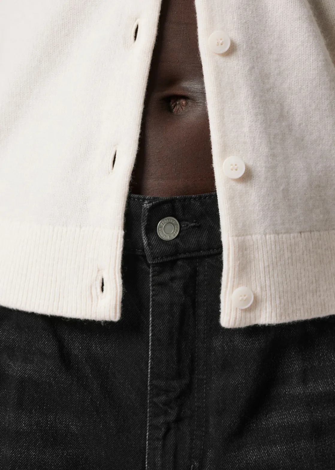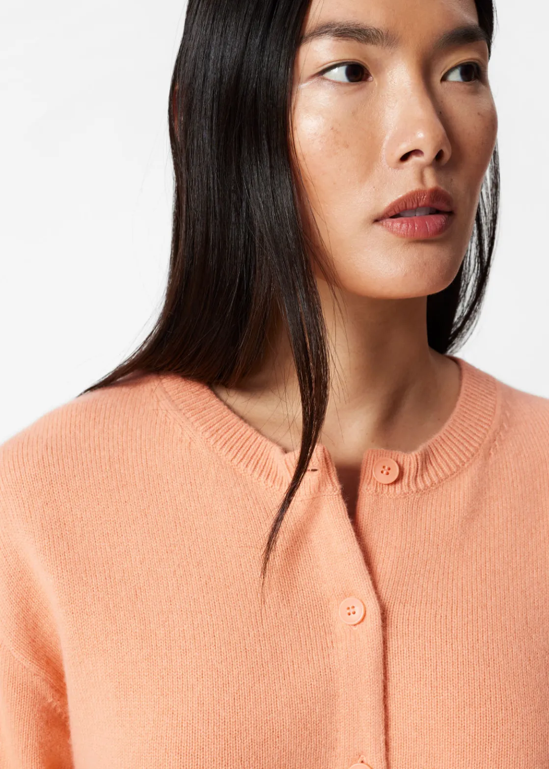 Boxy merino wool cardigan finished with a ribbed neckline, cuffs and hemline.