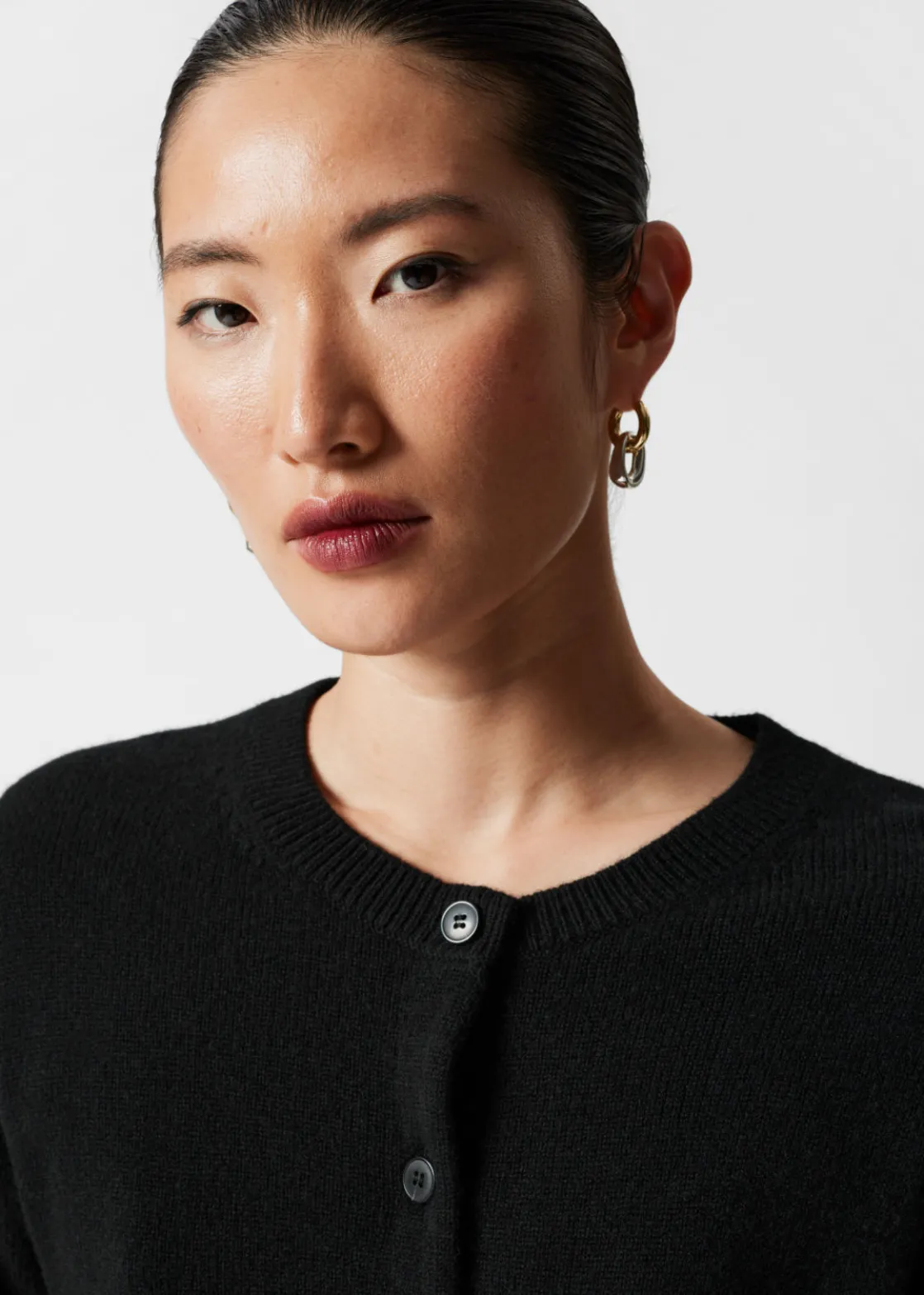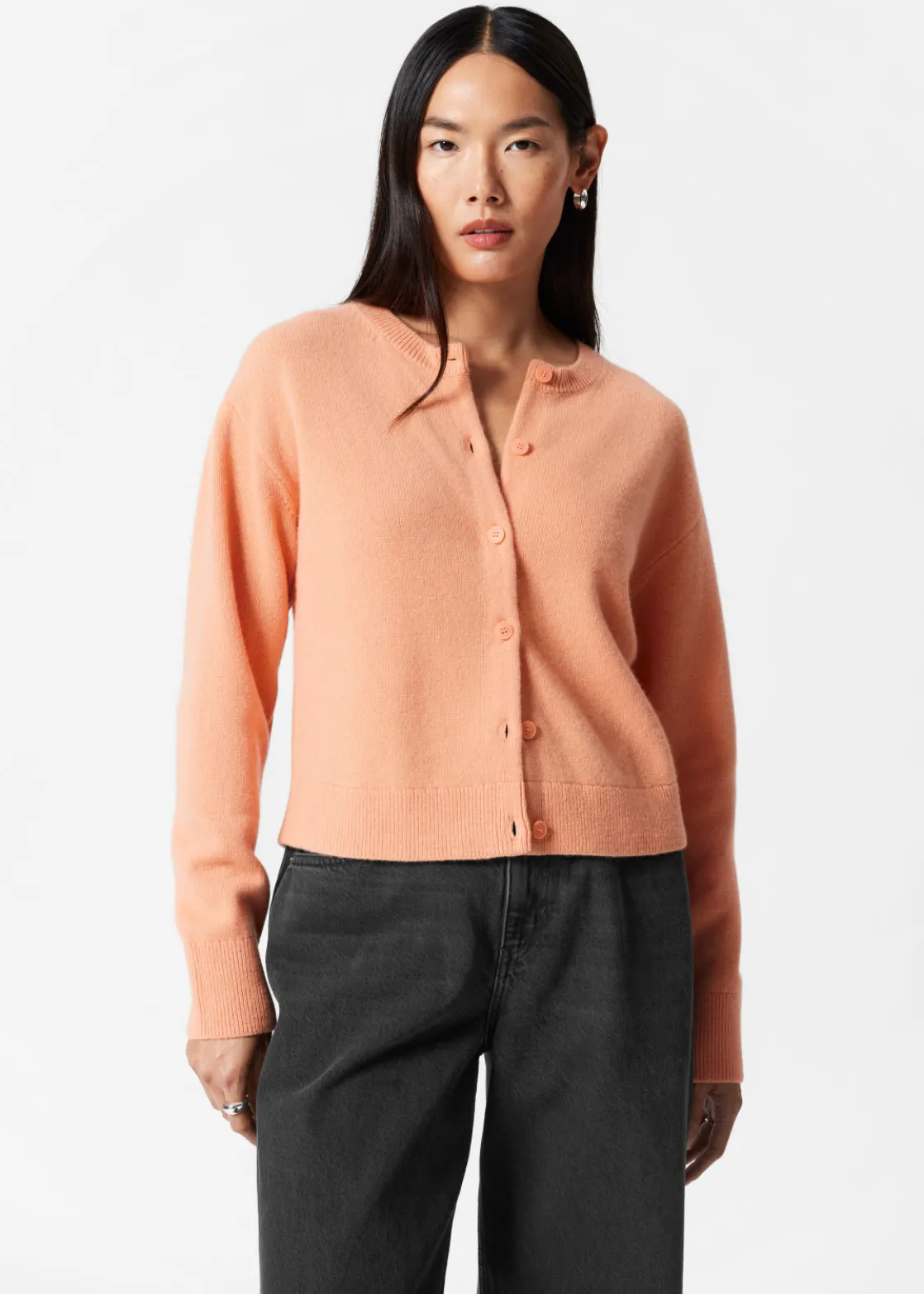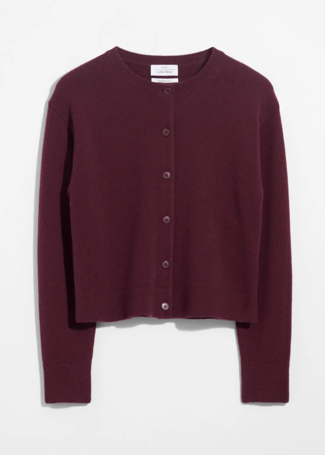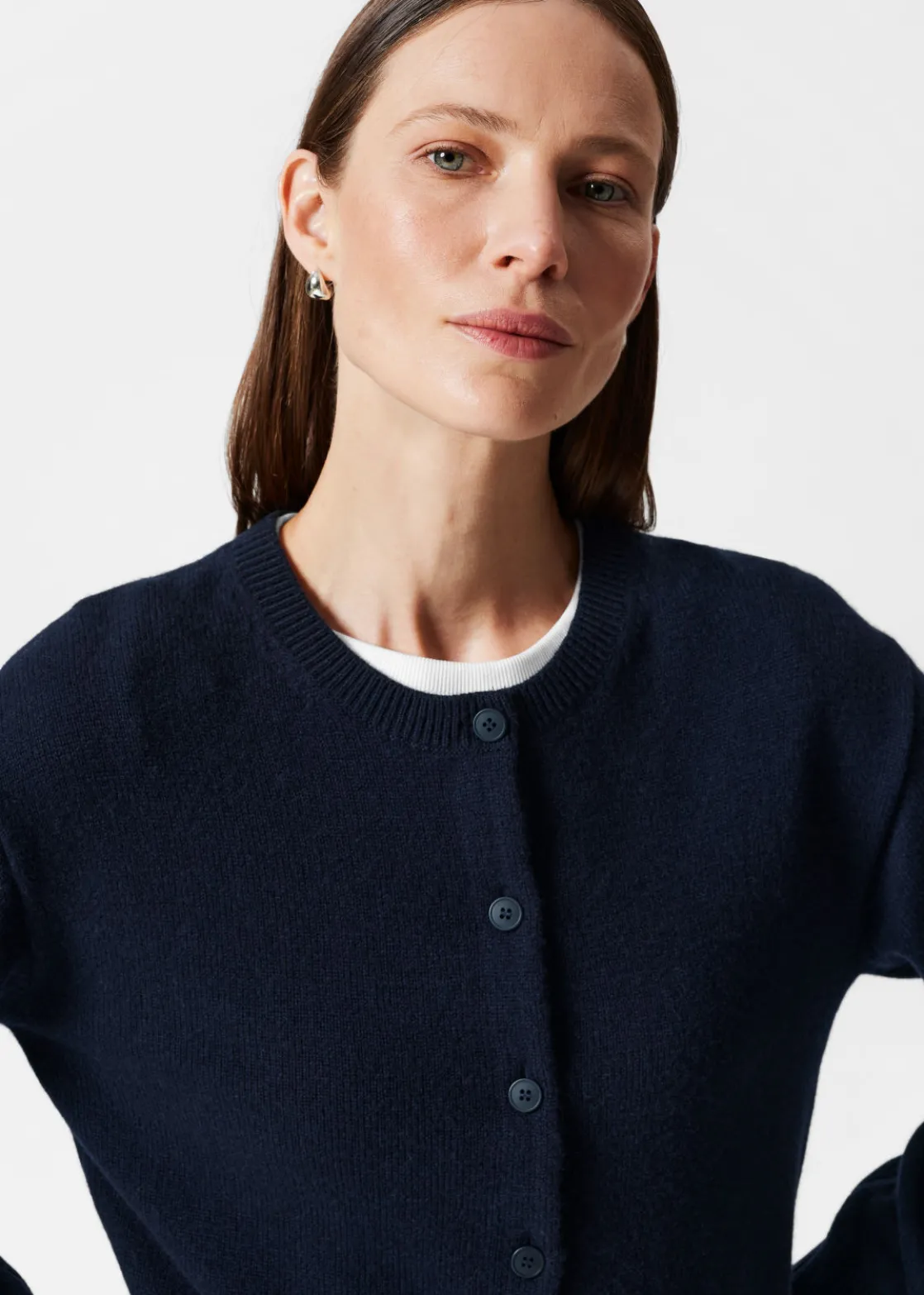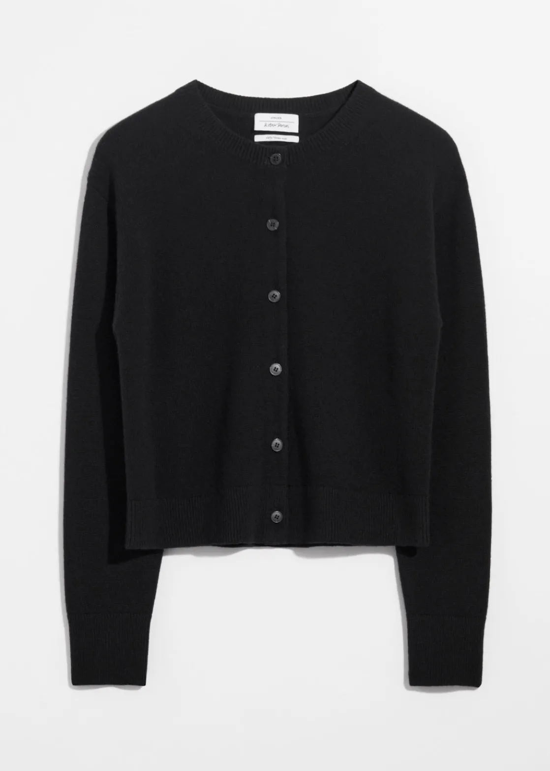 Boxy merino wool cardigan finished with a ribbed neckline, cuffs and hemline.