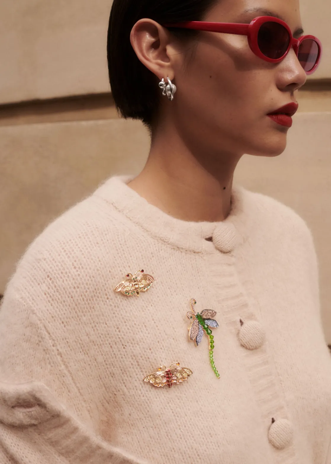 Long-sleeve cardigan knitted from a merino and alpaca wool blend. Accented with playful brooches at the chest.