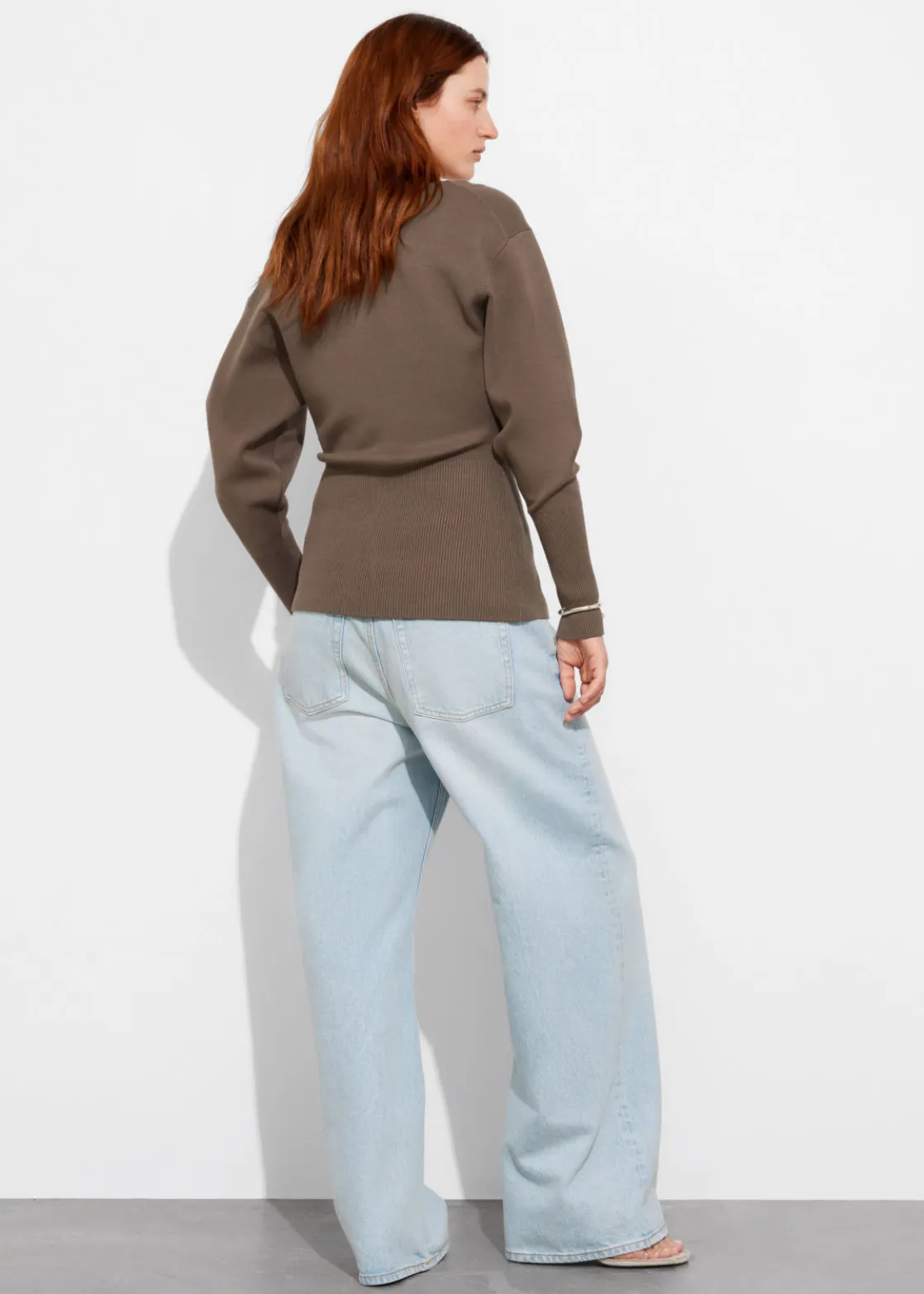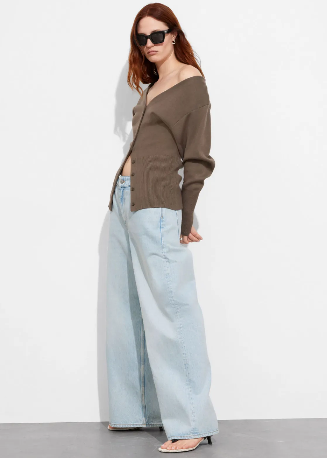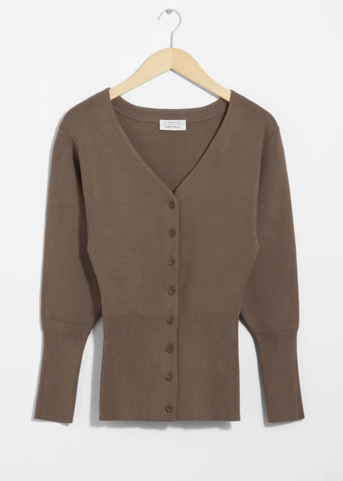 Knitted cardigan featuring an extended, ribbed hemline cut for a slim fit at the hips.