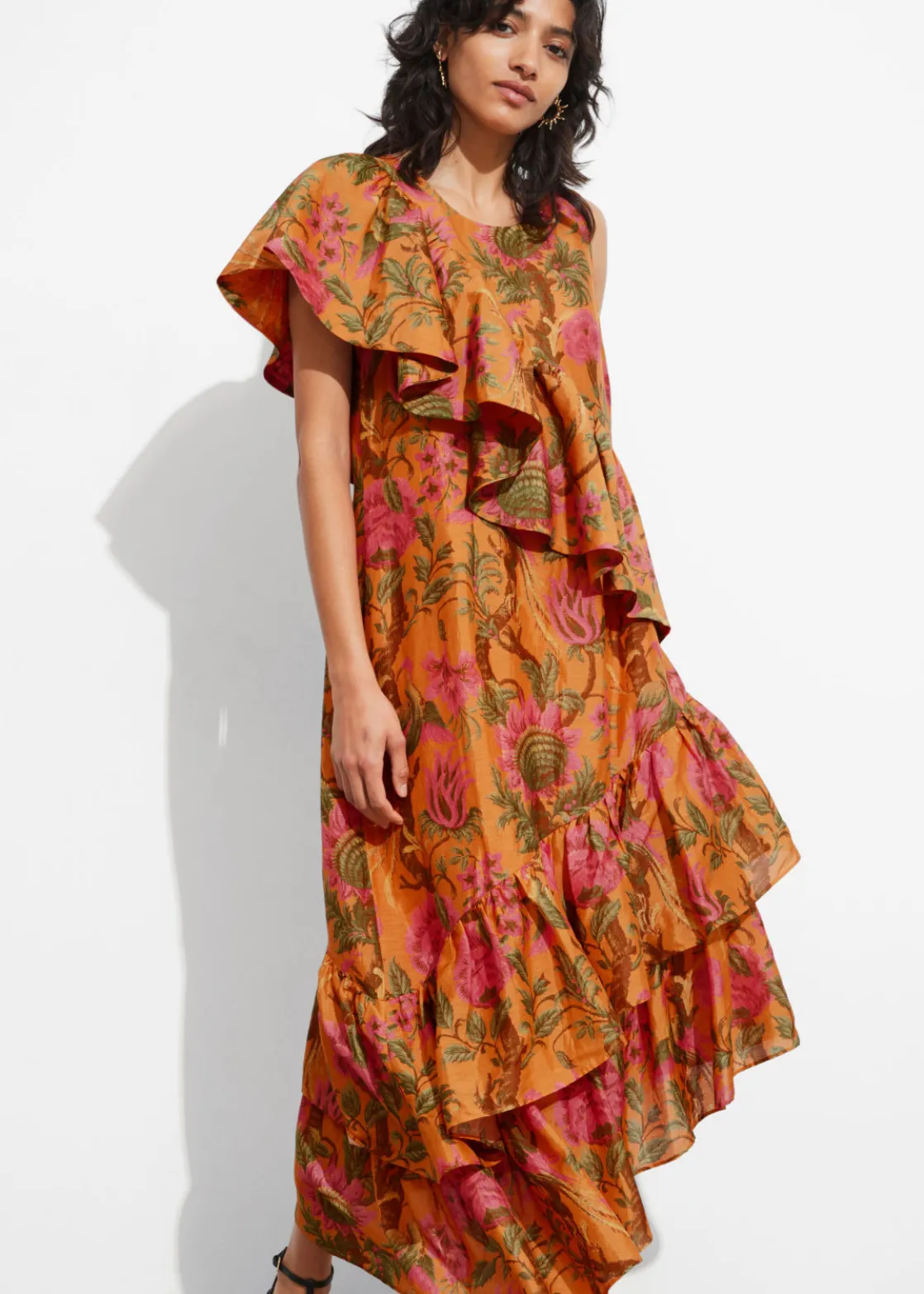 Midi dress traced with cascading ruffles that fall to a layered, asymmetric hemline.