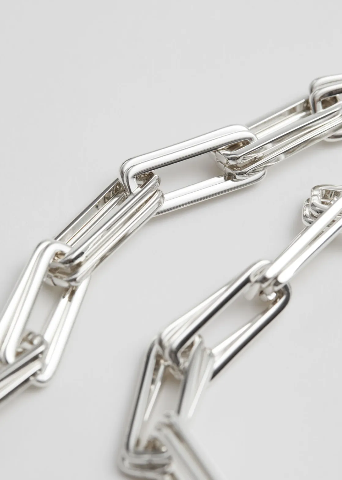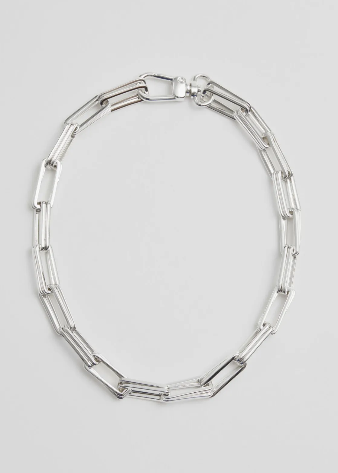 Chunky chain link necklace with a short fit and swivel clasp closure.