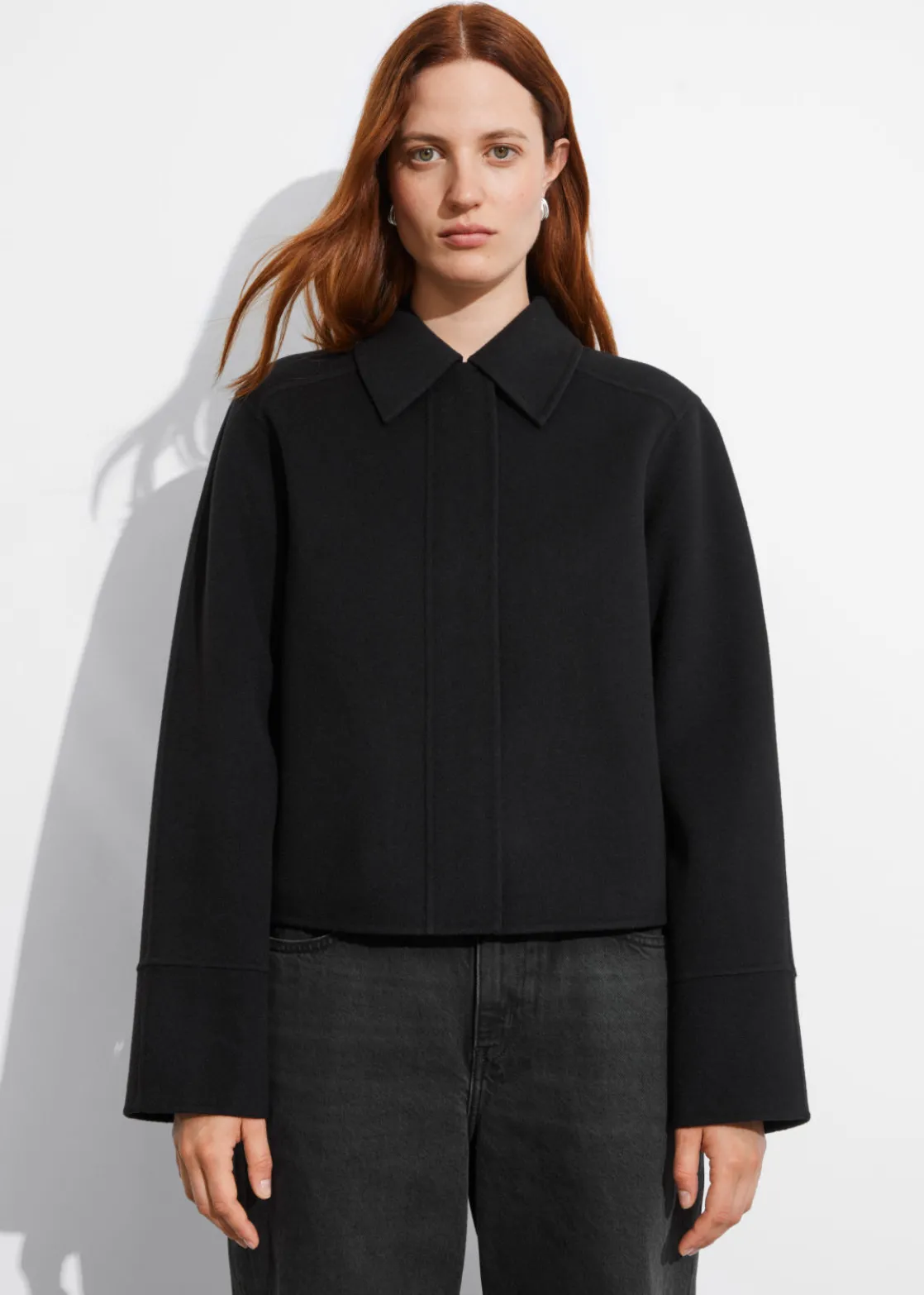 Jacket made from a wool-blend, fastened with a concealed zipper closure.