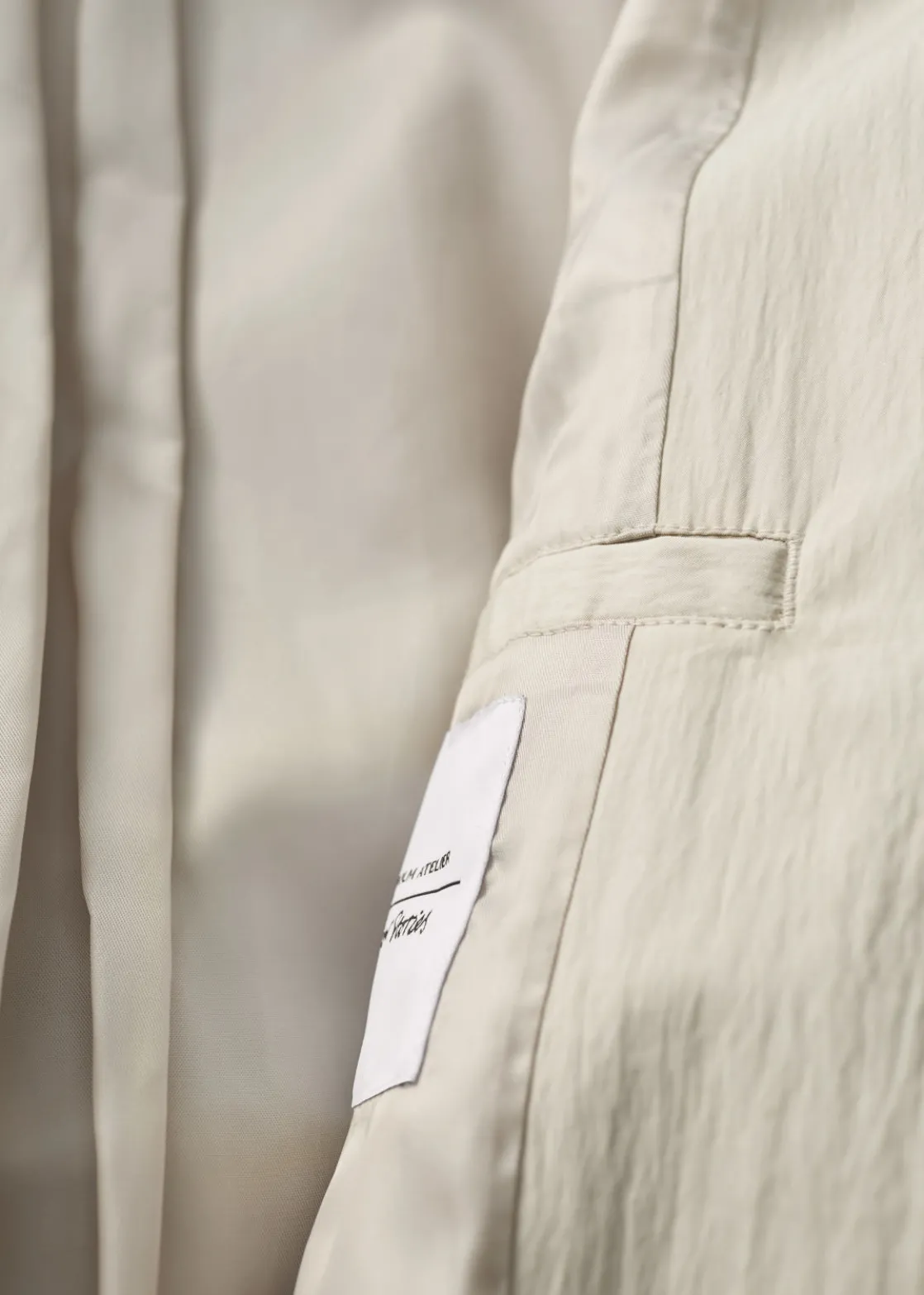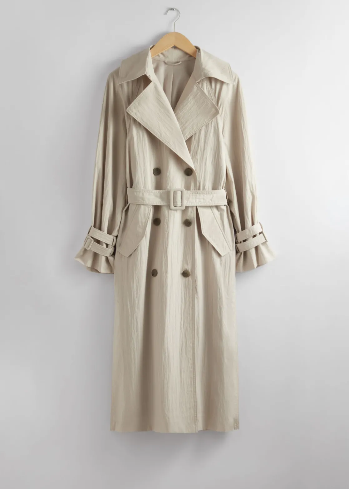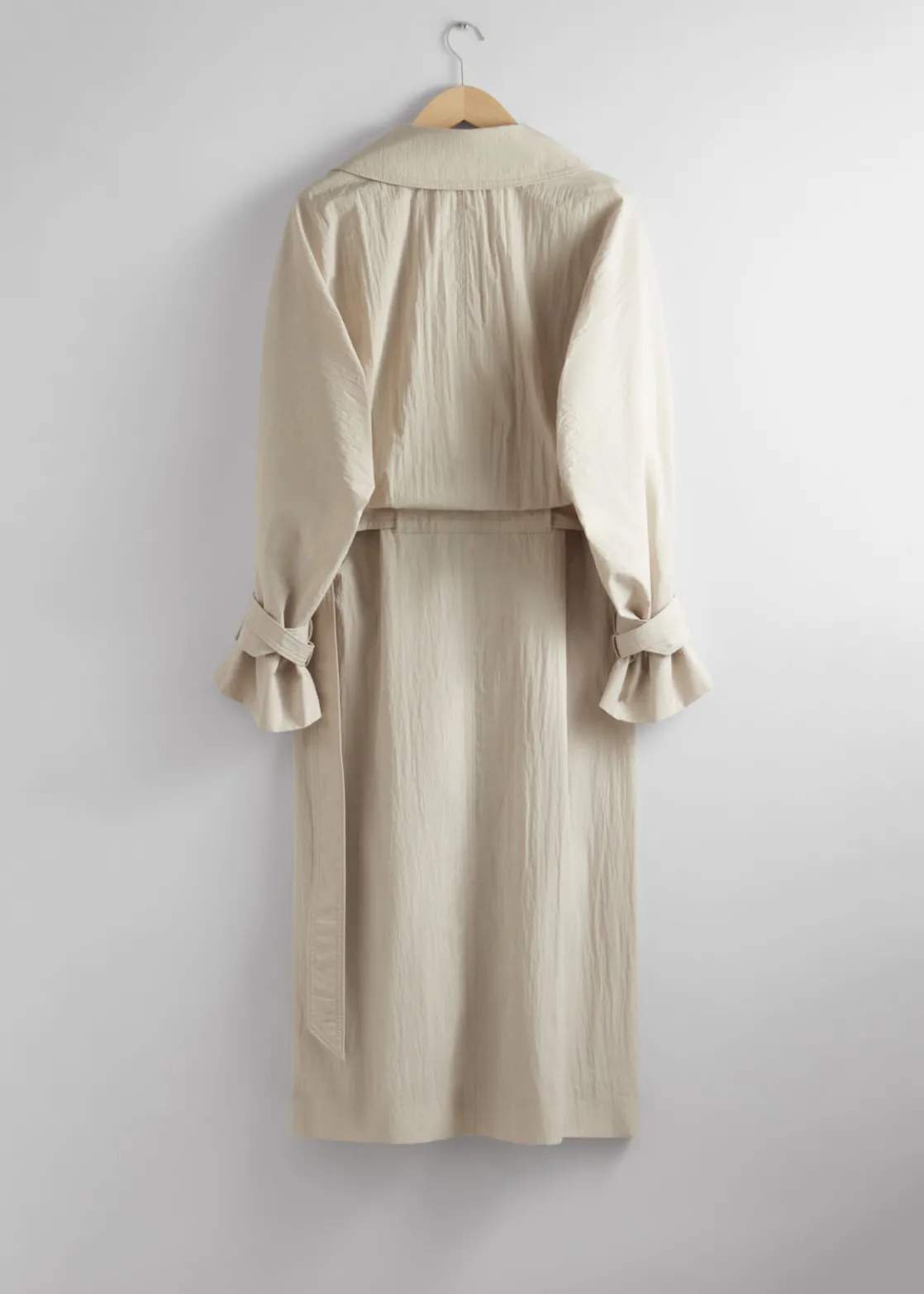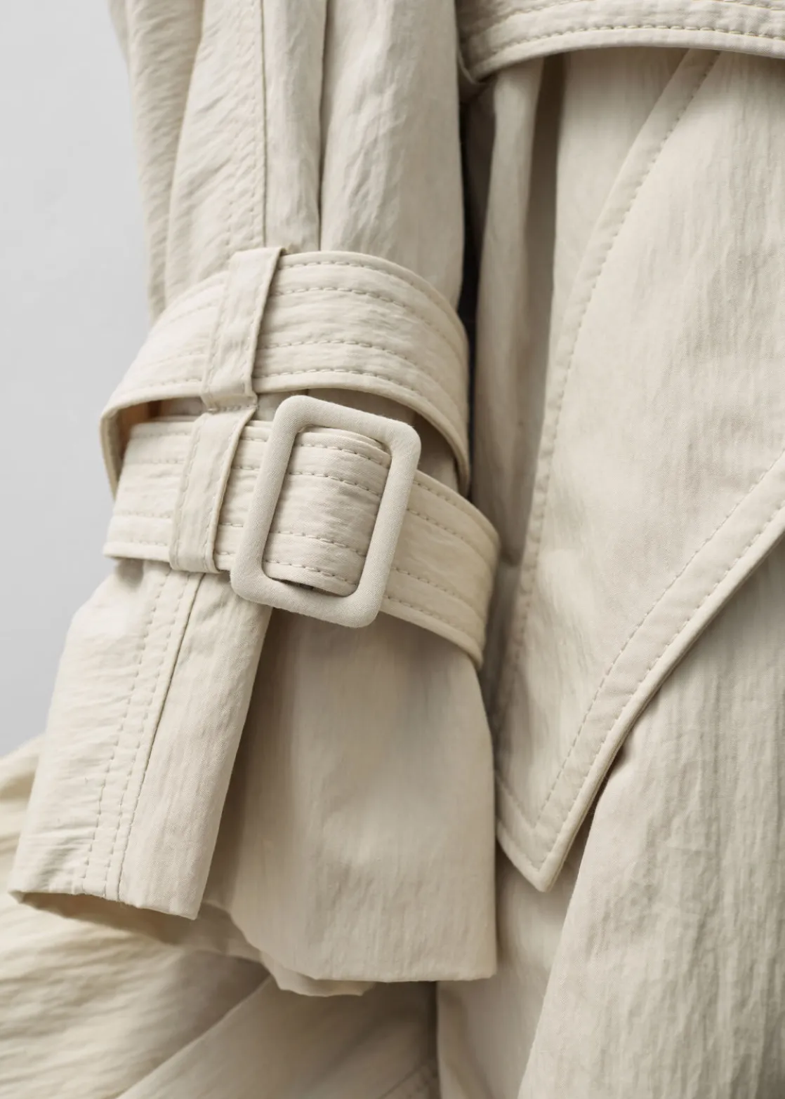 Double-breasted trench coat with a gently crinkled finish. Secured with a tonal buckle belt.
