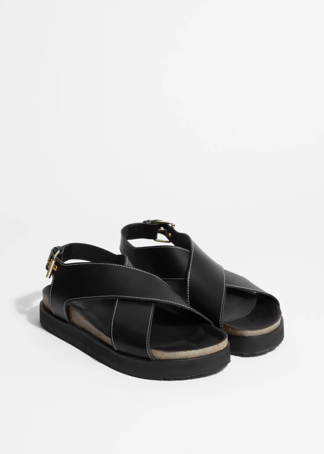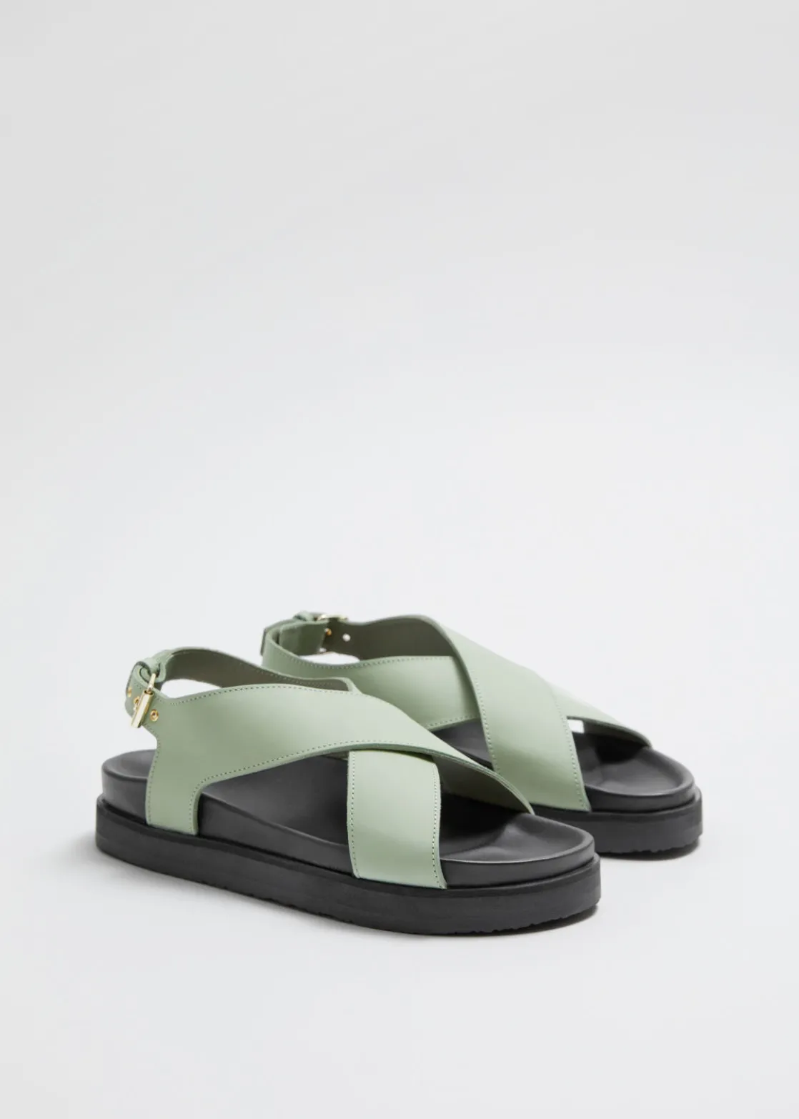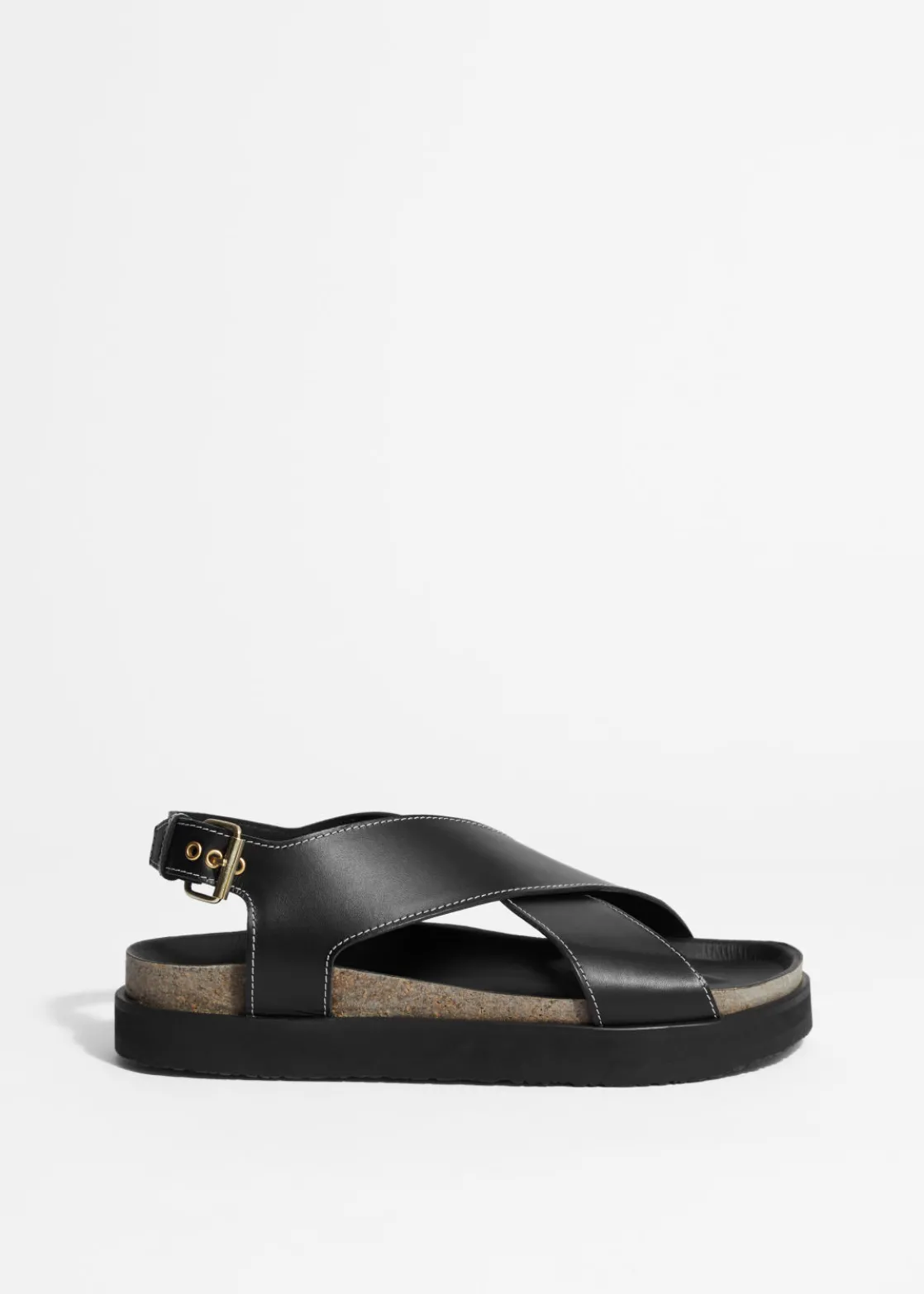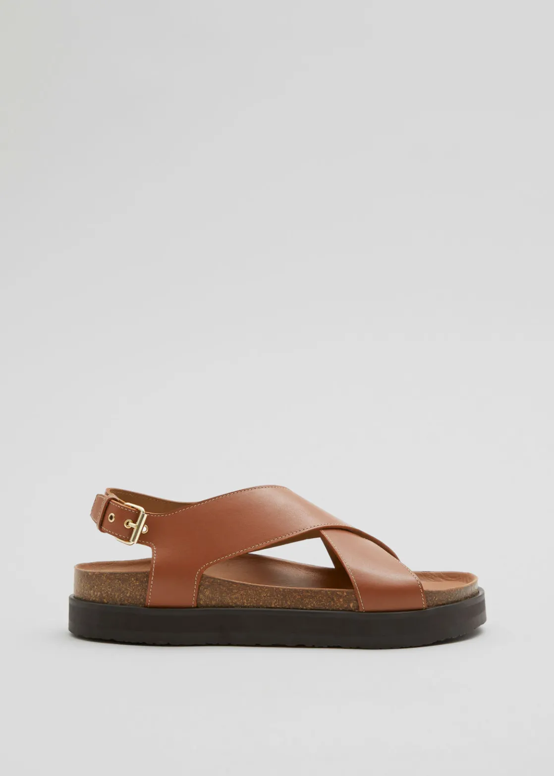 Leather sandal featuring criss-cross straps secured with an adjustable buckle closure.