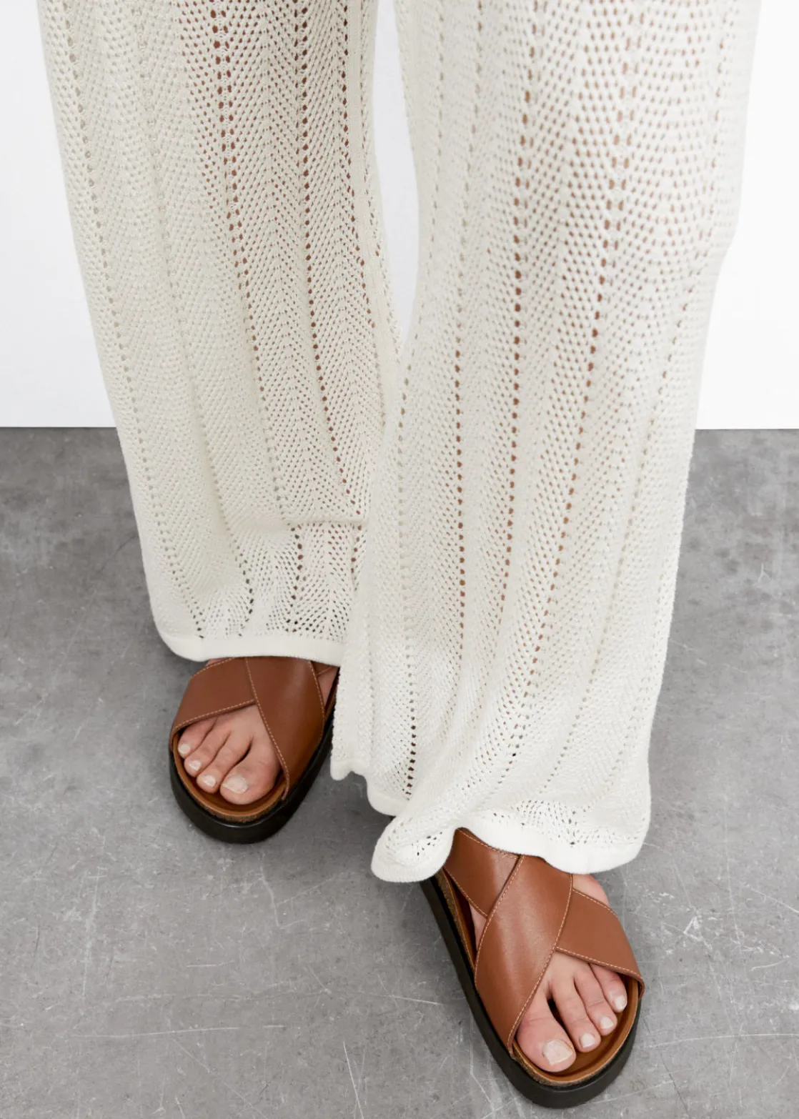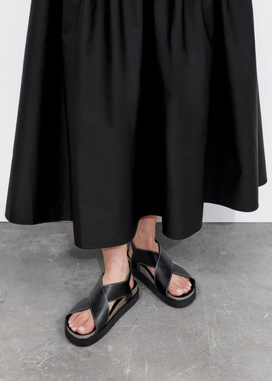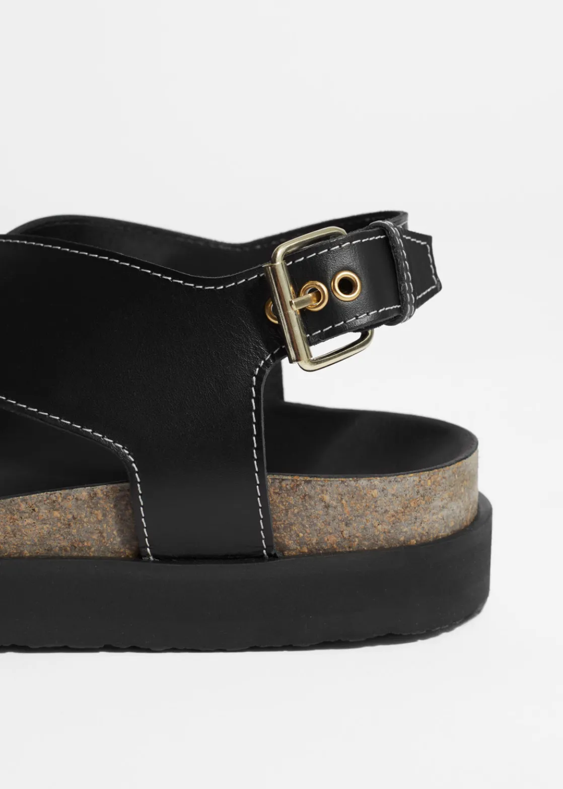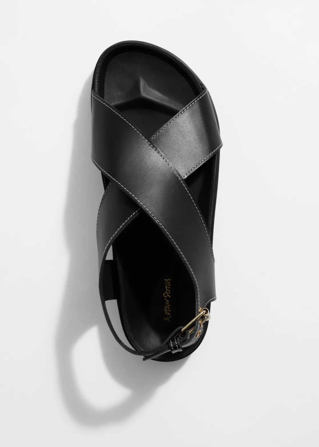 Leather sandal featuring criss-cross straps secured with an adjustable buckle closure.