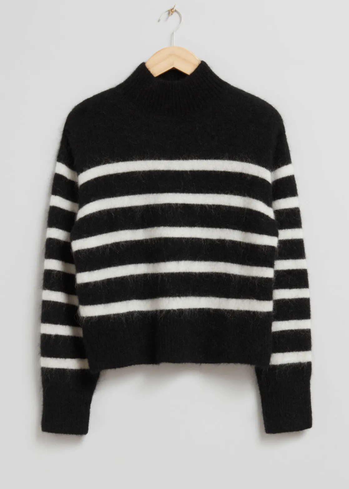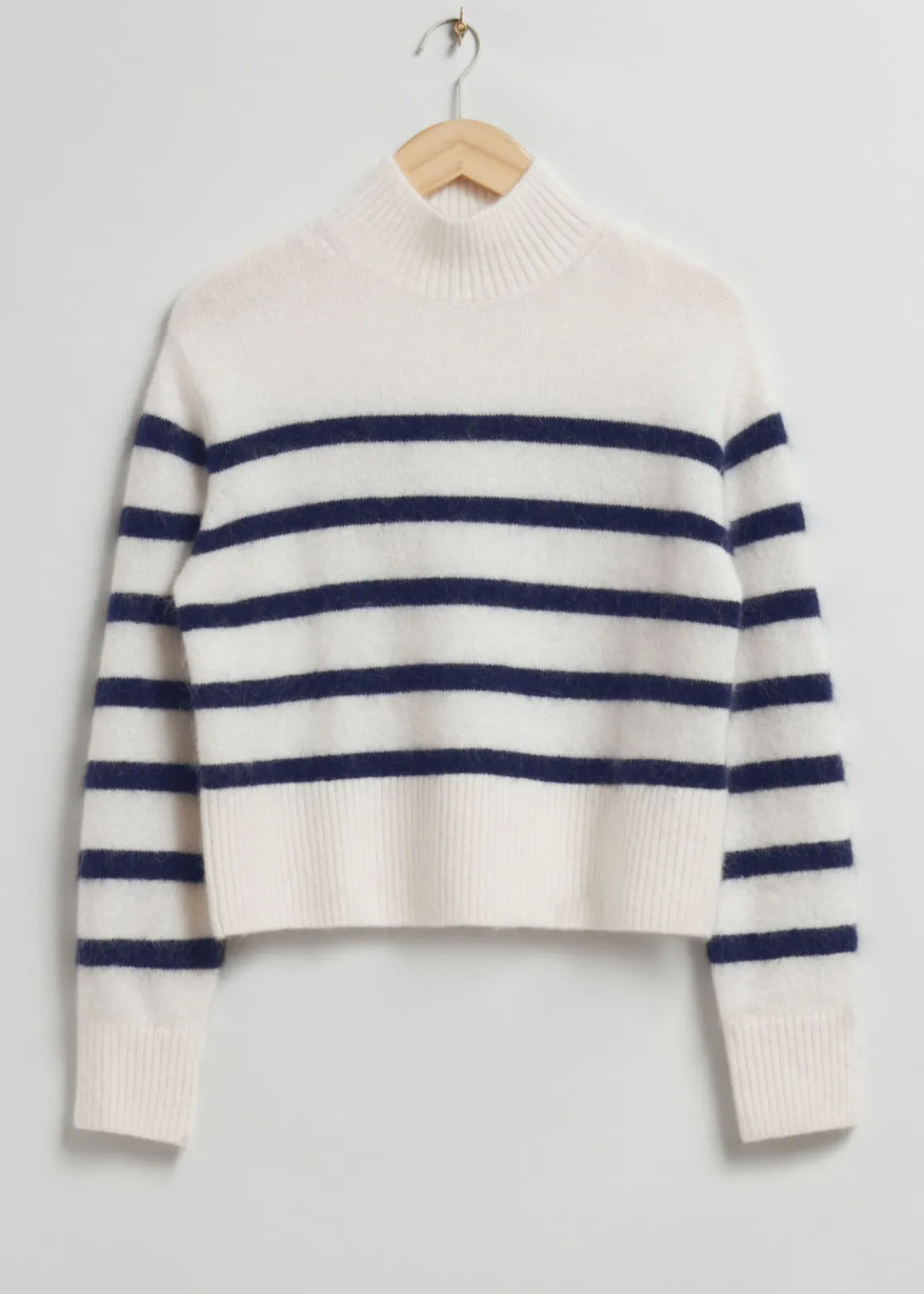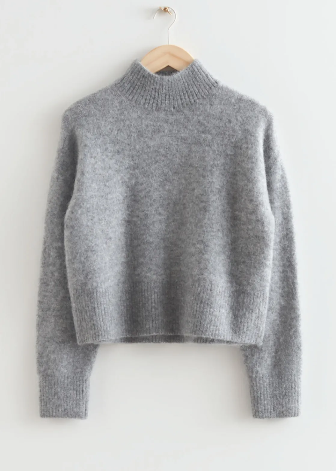 Cropped mock neck knit sweater featuring a cropped, boxy silhouette.
