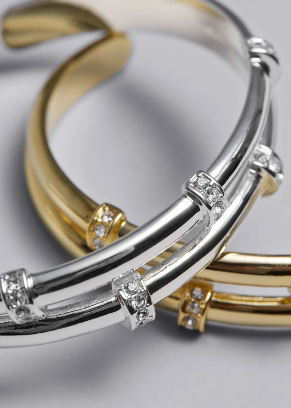Cast from brass, this cuff features interlaced bands detailed with delicate clear glass stones.