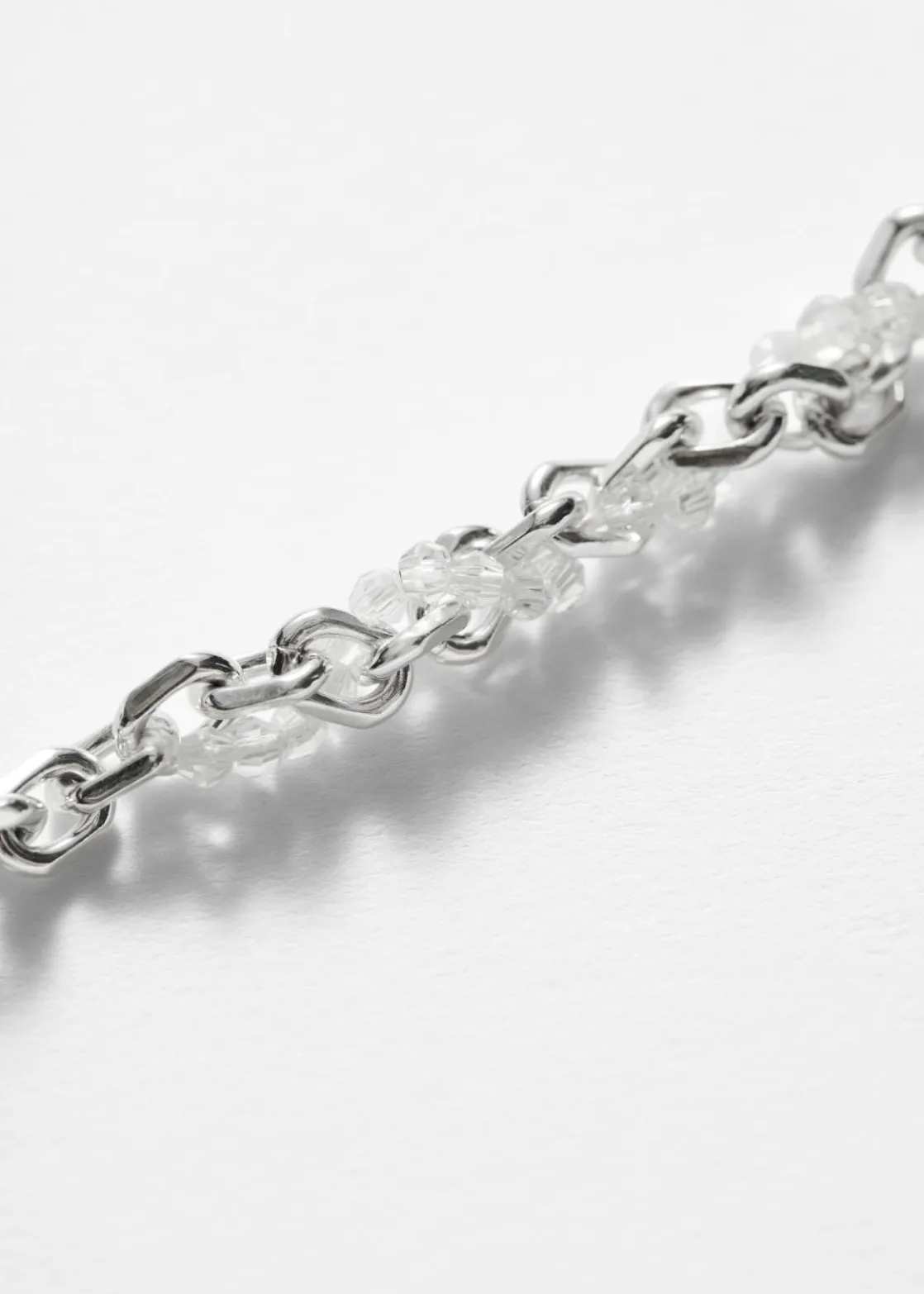 This necklace is crafted from silver-tone brass cast into delicate links. It’s adorned with lustrous glass beads and finished with extension chain, allowing you to customize the length.