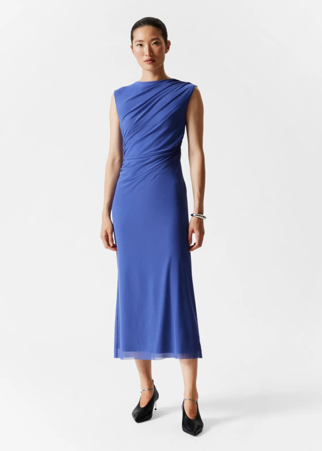Sleeveless midi dress featuring a boat neck and a form-fitting silhouette with draped detailing.