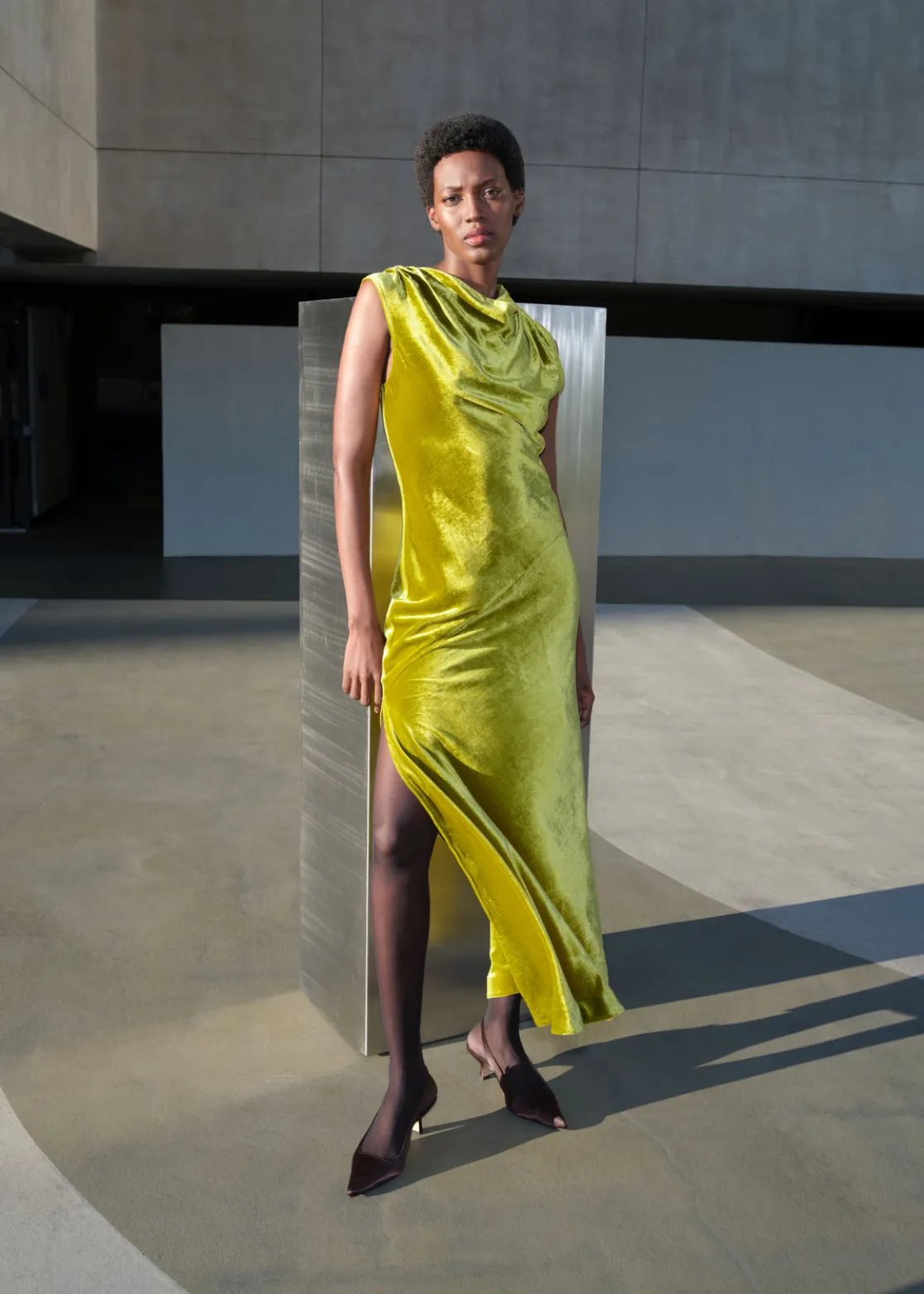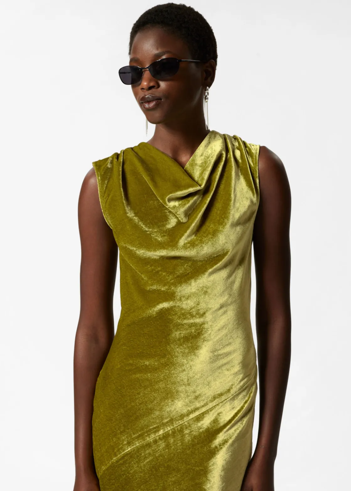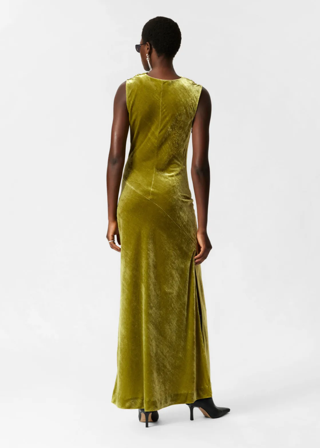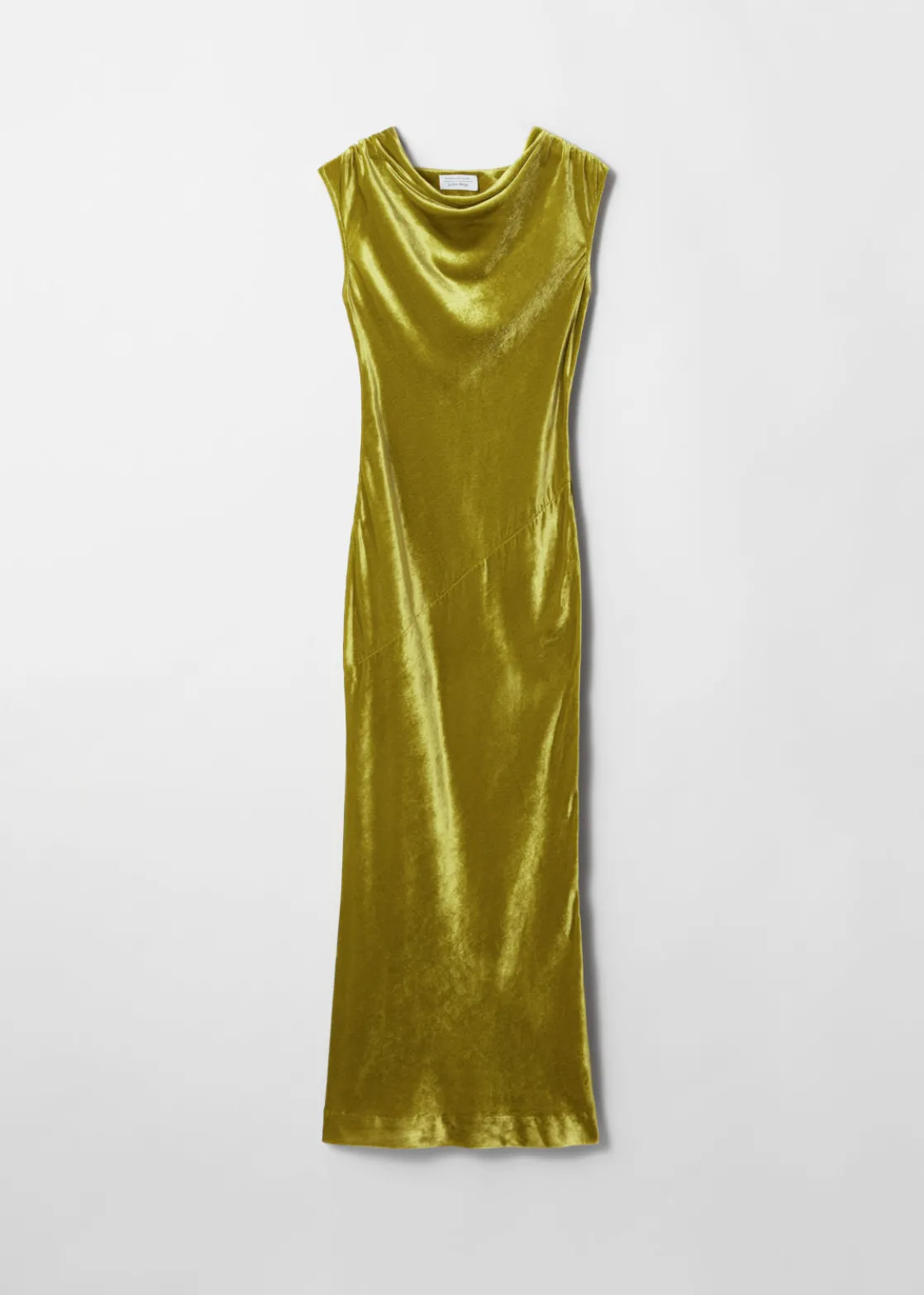 Draped velvet maxi dress with bias-cut panelling and folded waterfall neckline. Full-length skirt with a concealed zip at the side seam.