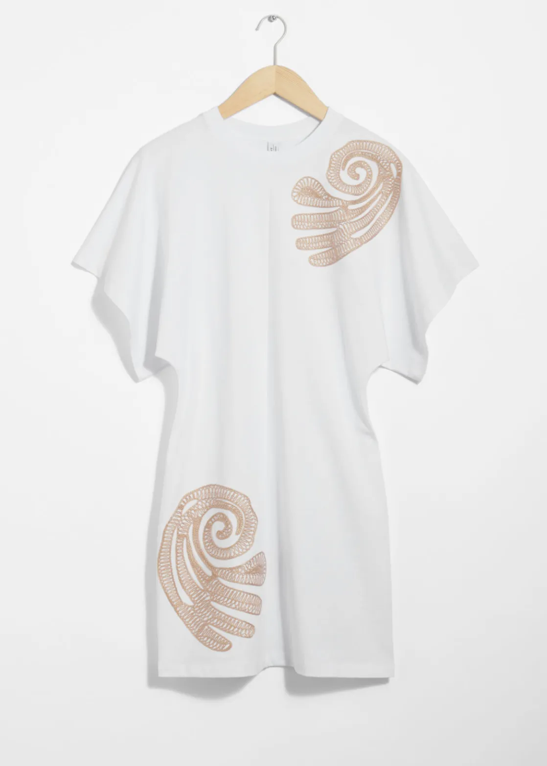 T-shirt mini dress featuring an accentuated waistline. Detailed with duo embroidered motifs.