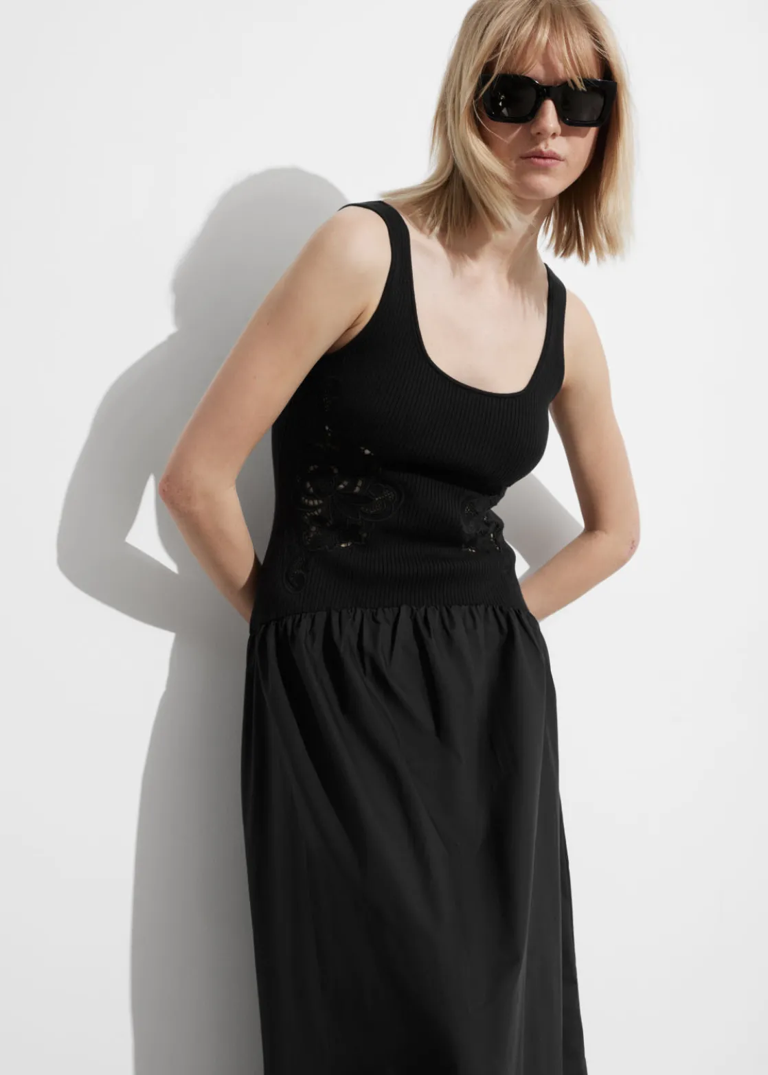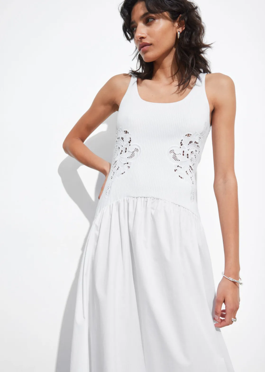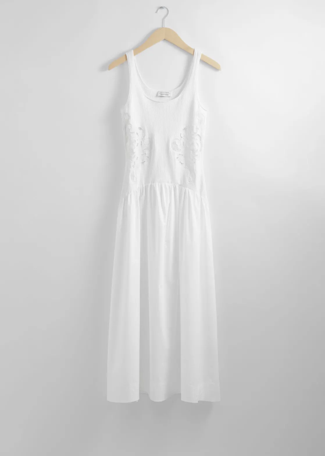Tank midi dress featuring a ribbed top with embroidered detailing and a gently flared skirt.