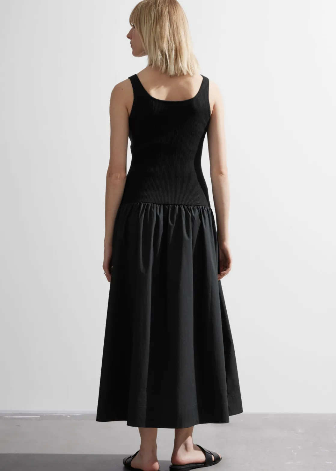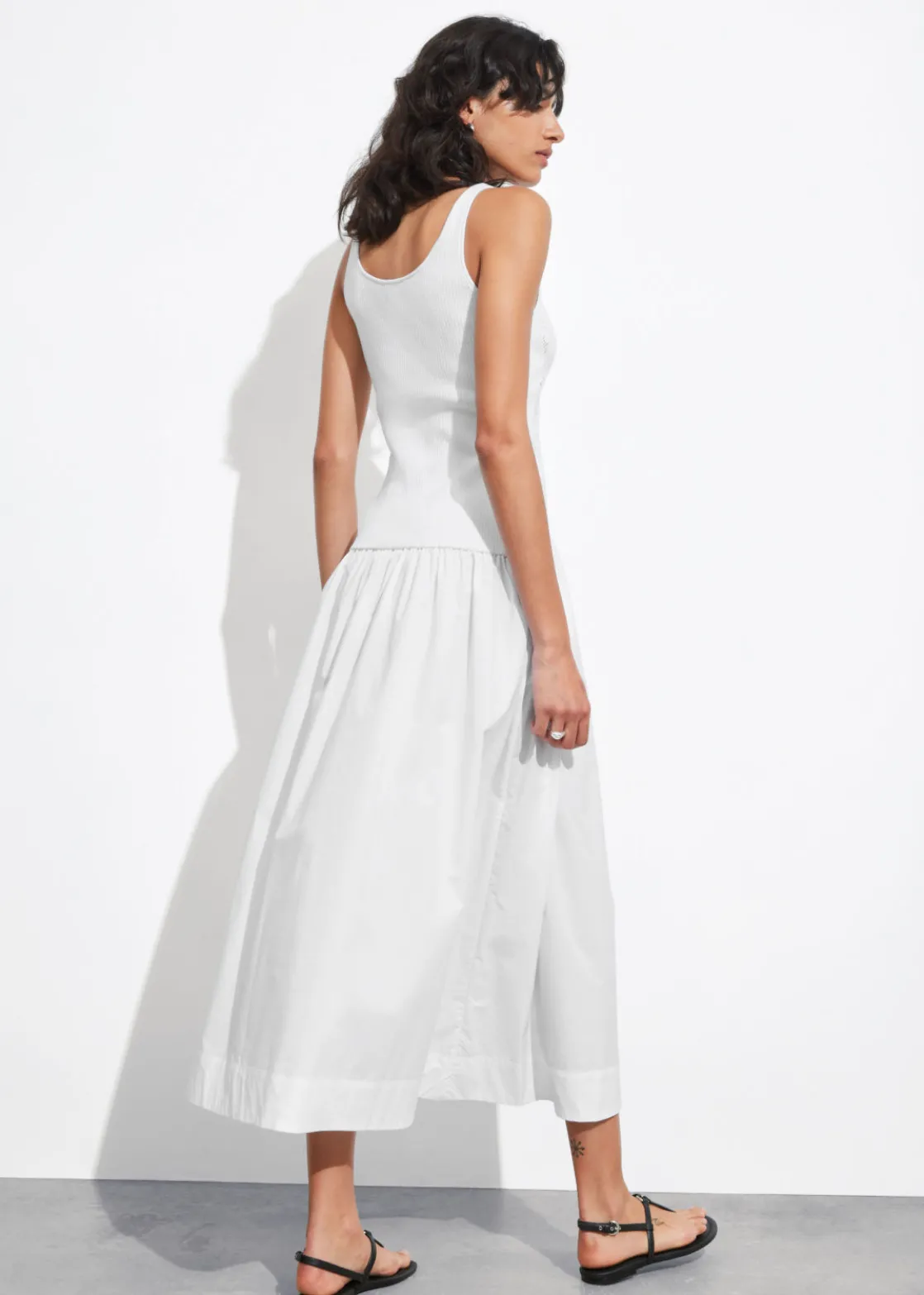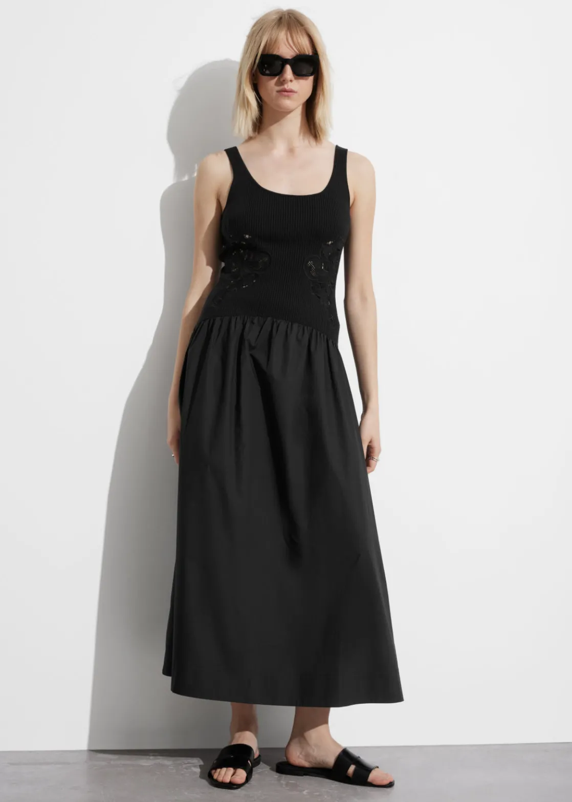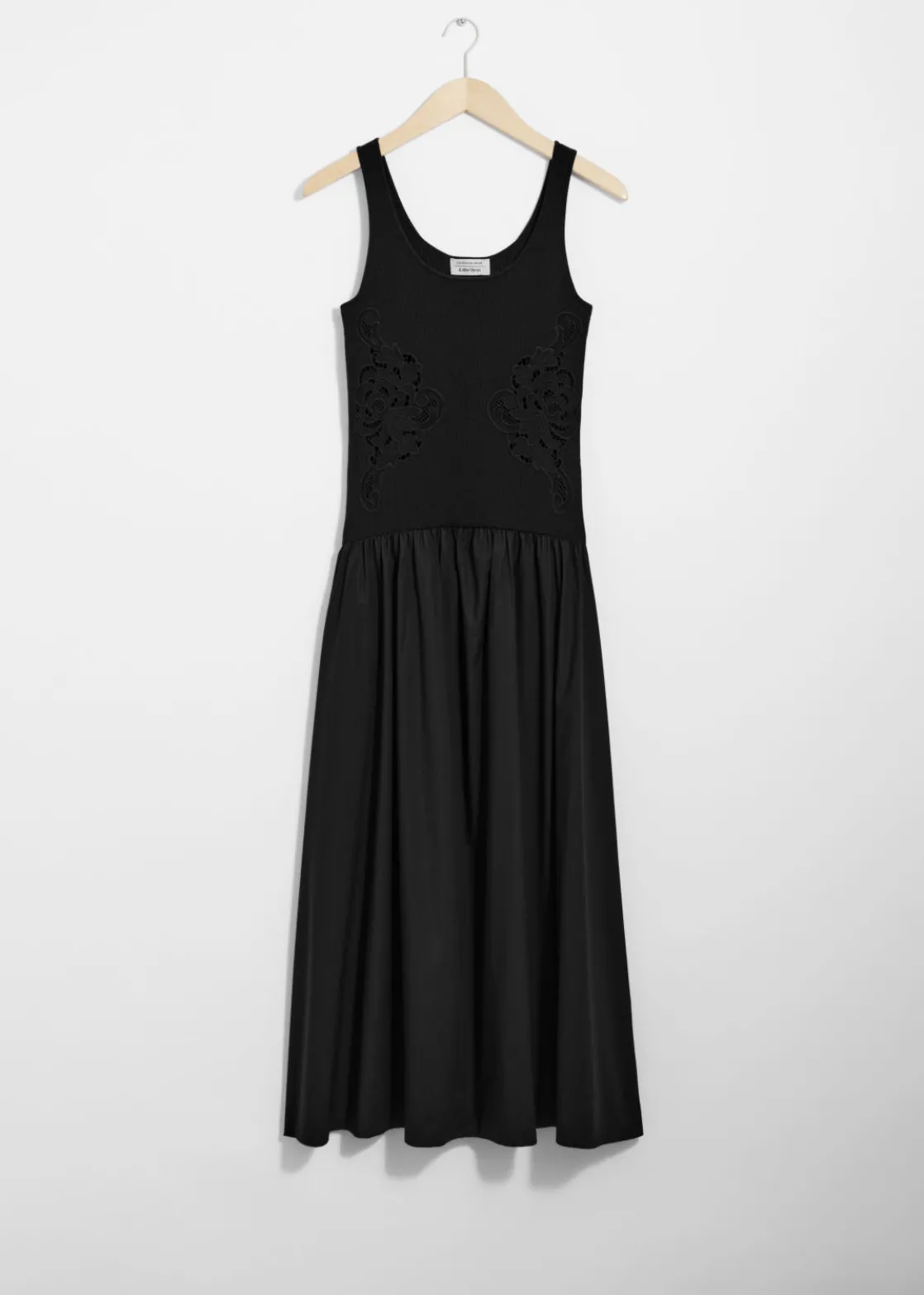 Tank midi dress featuring a ribbed top with embroidered detailing and a gently flared skirt.