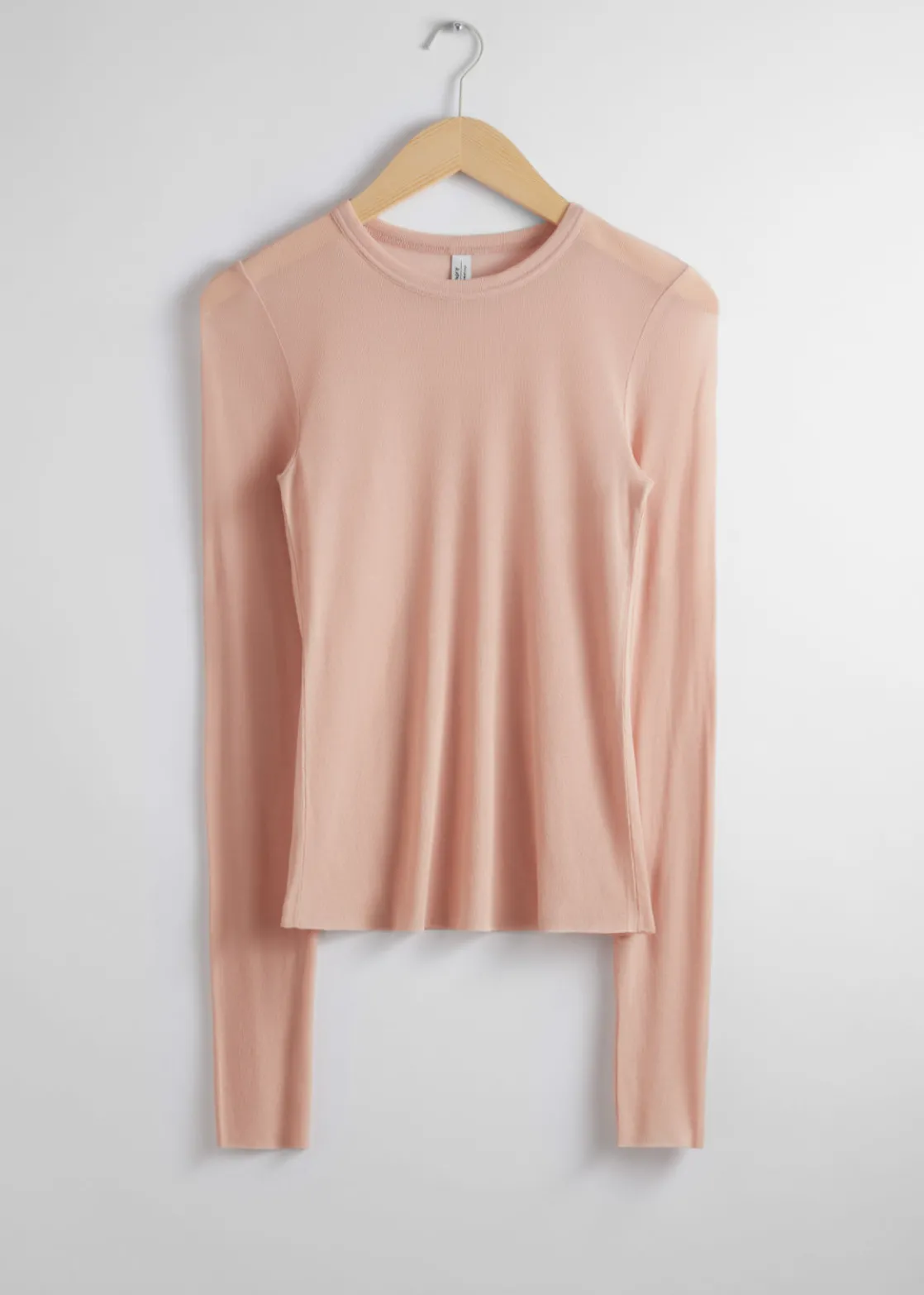 Mulberry silk long sleeved top in a fitted silhouette with rounded neckline.