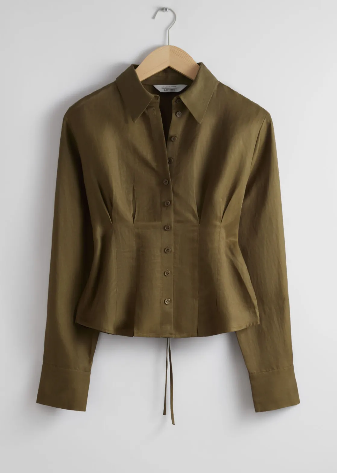 Buttoned shirt featuring a fitted, pleated waistline and spaghetti ties at the back.