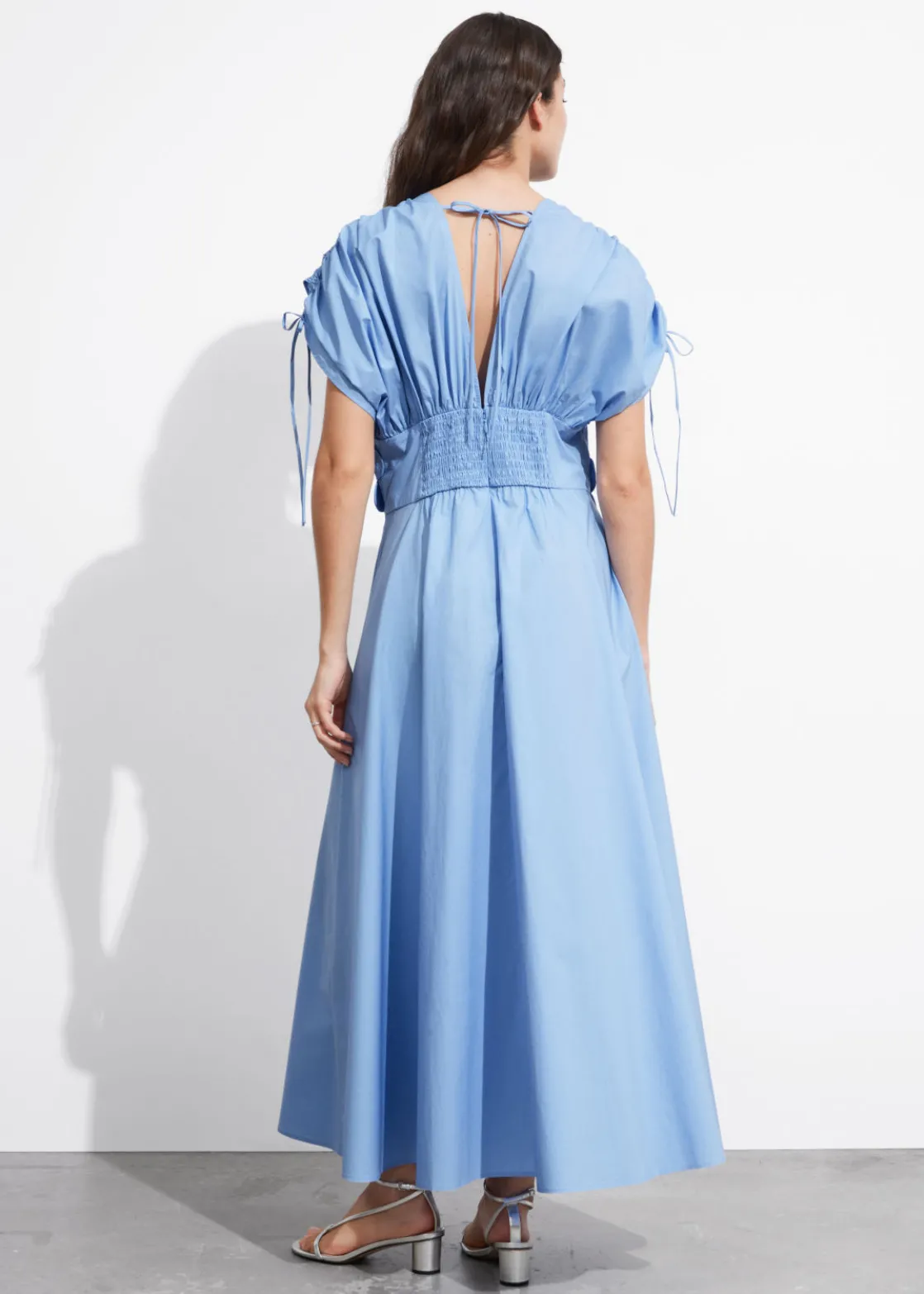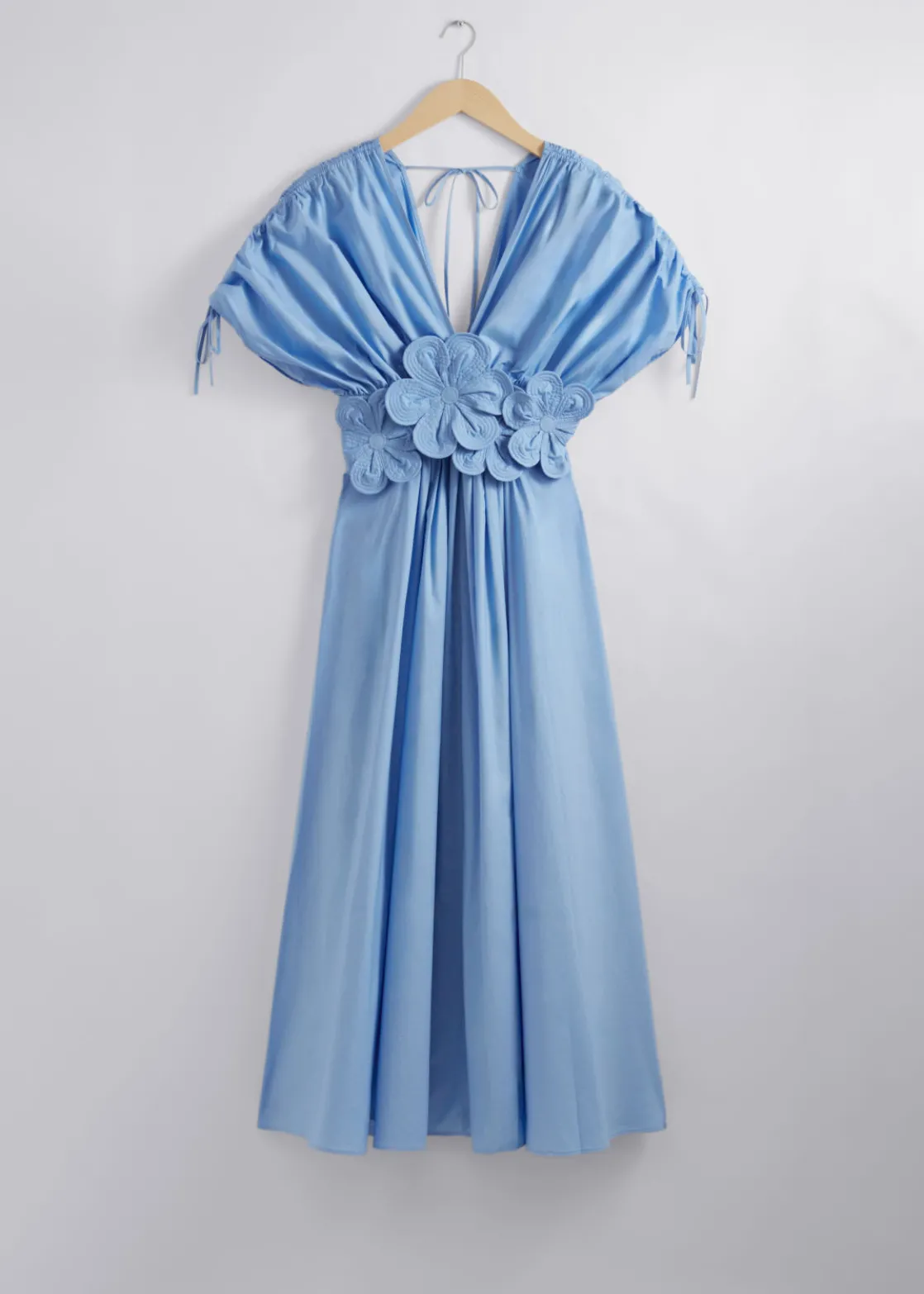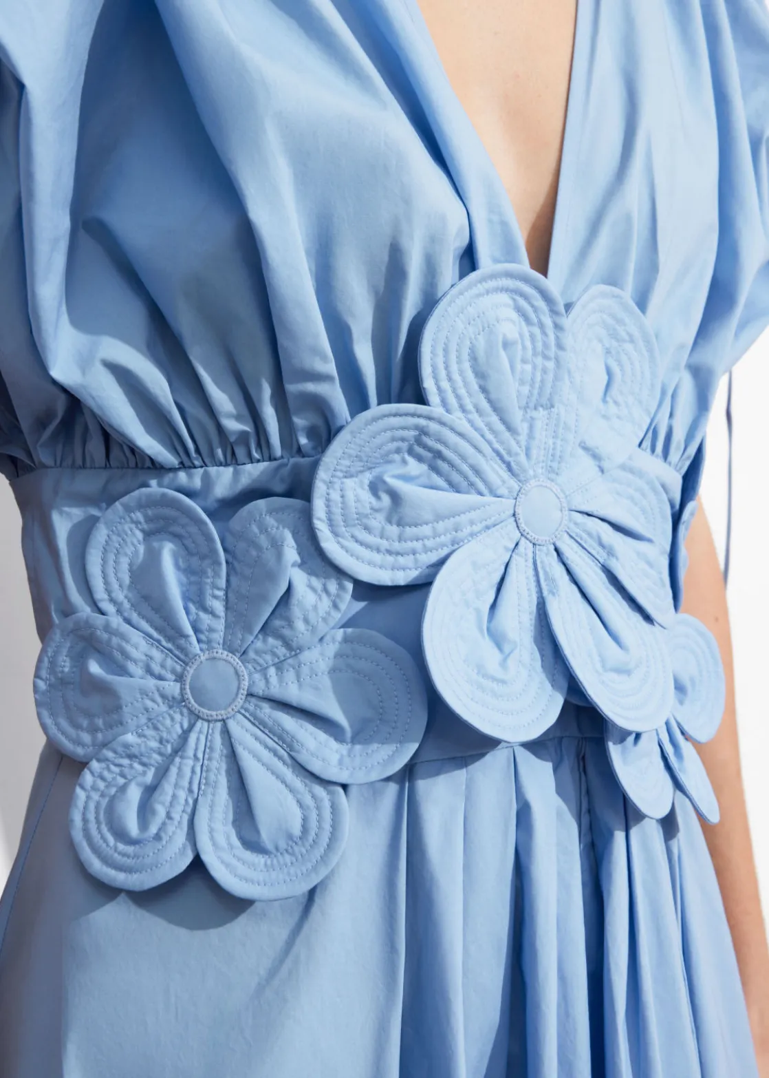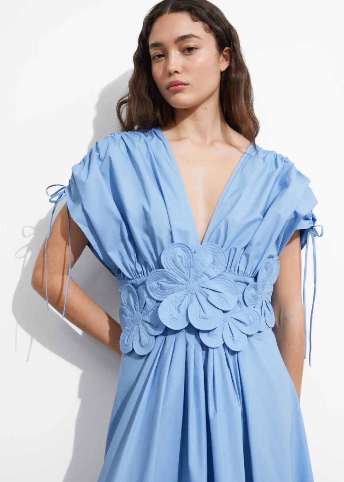 Midi dress featuring a gently pleated silhouette and an elasticated waistline detailed with floral appliqués.