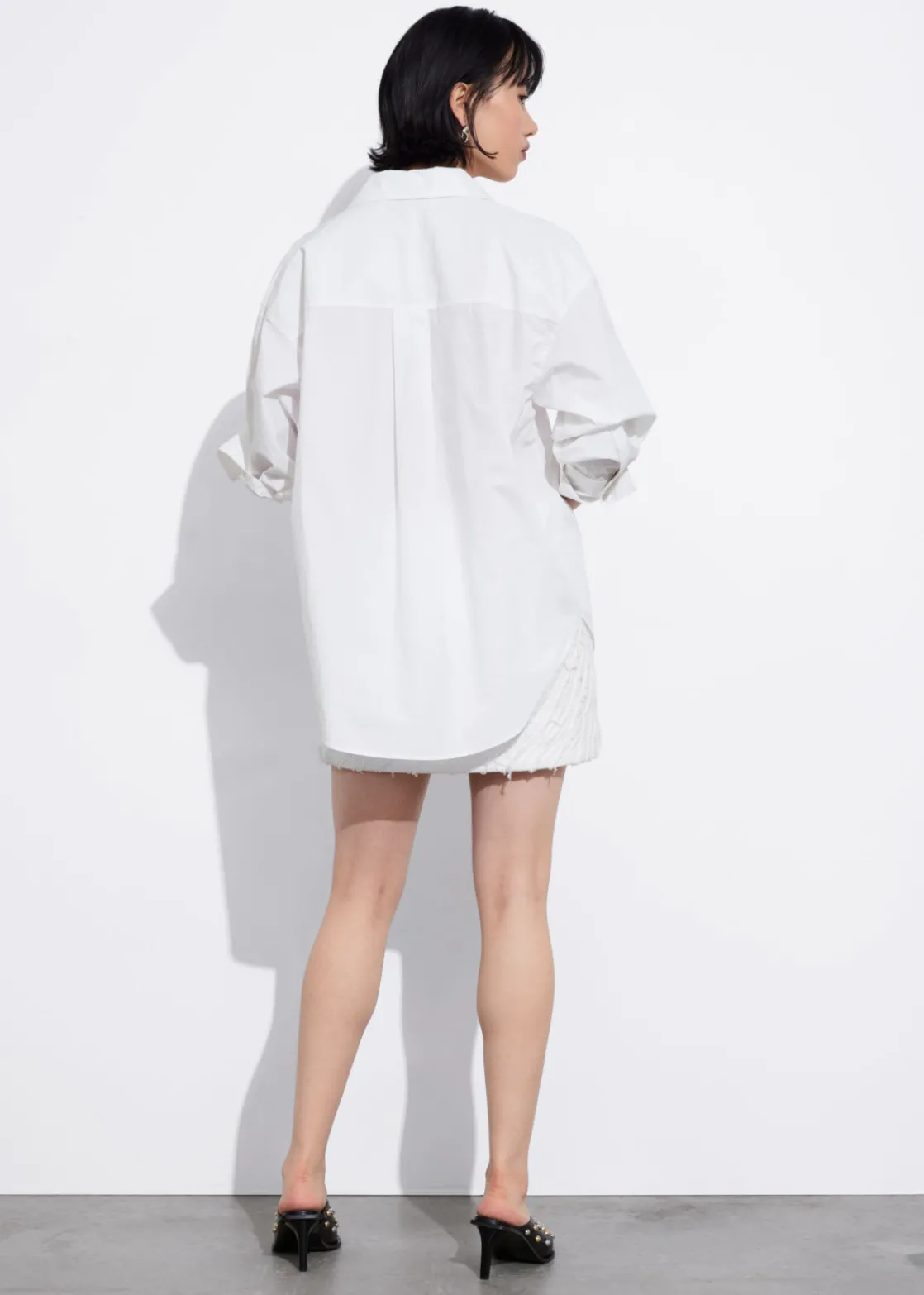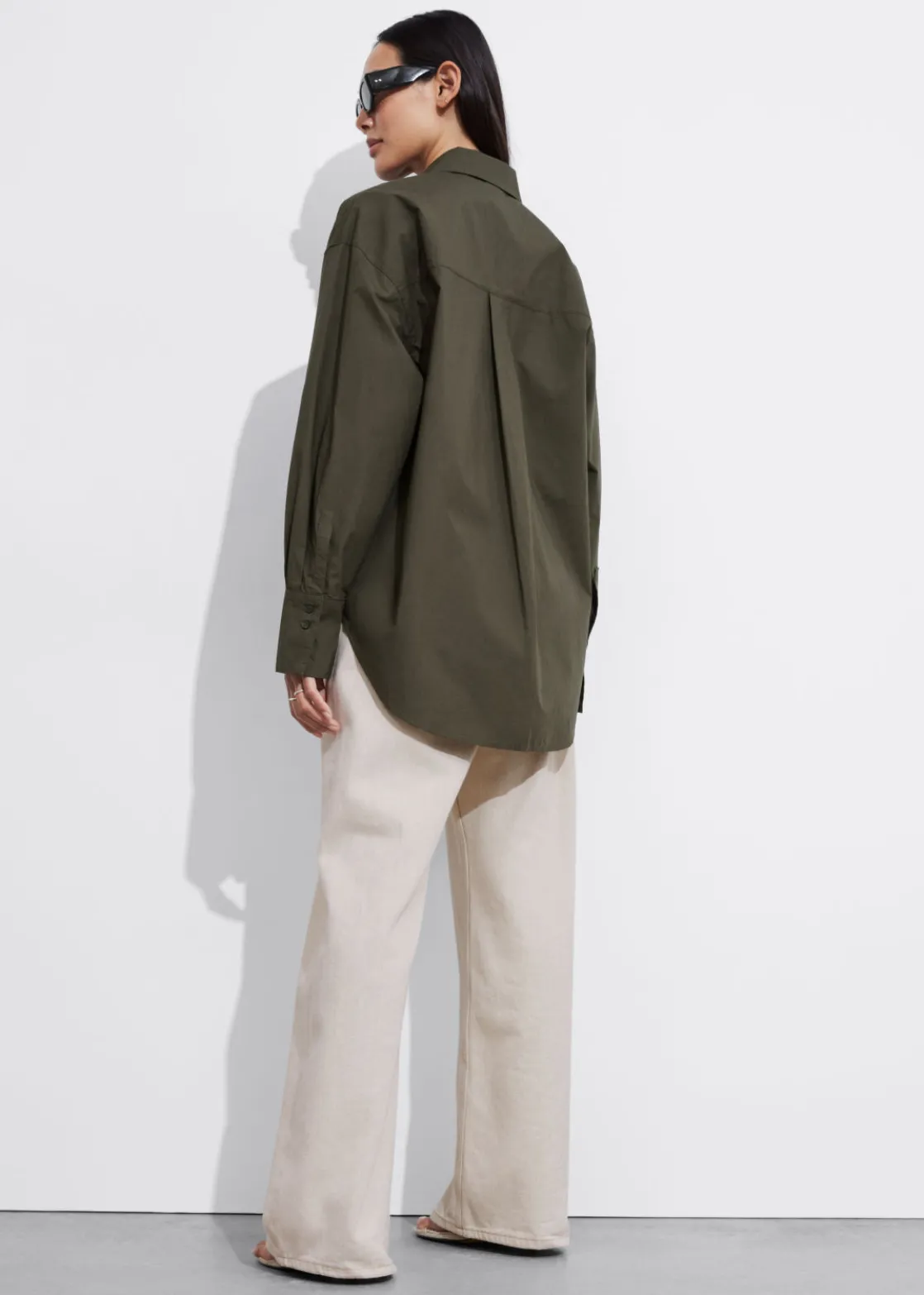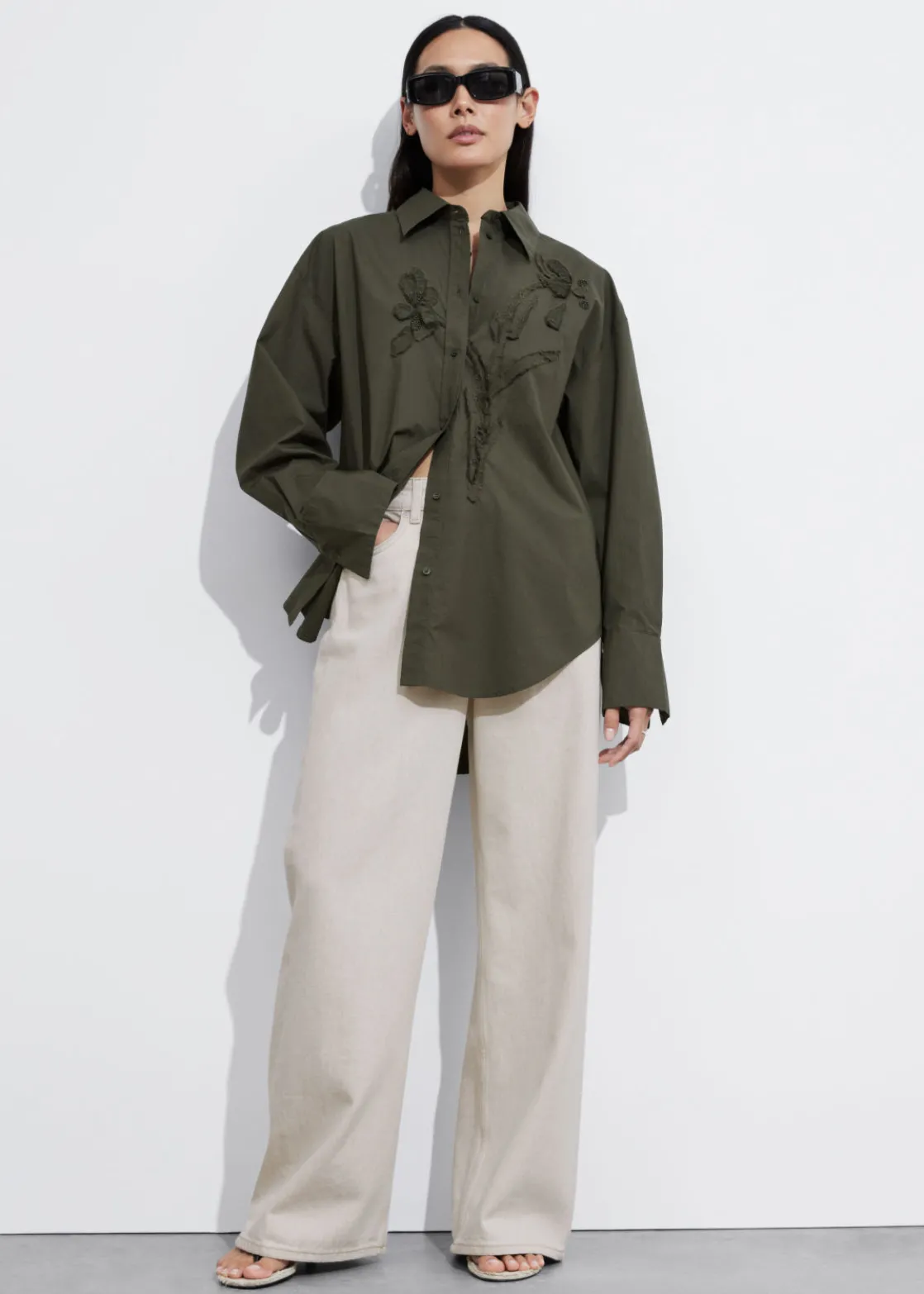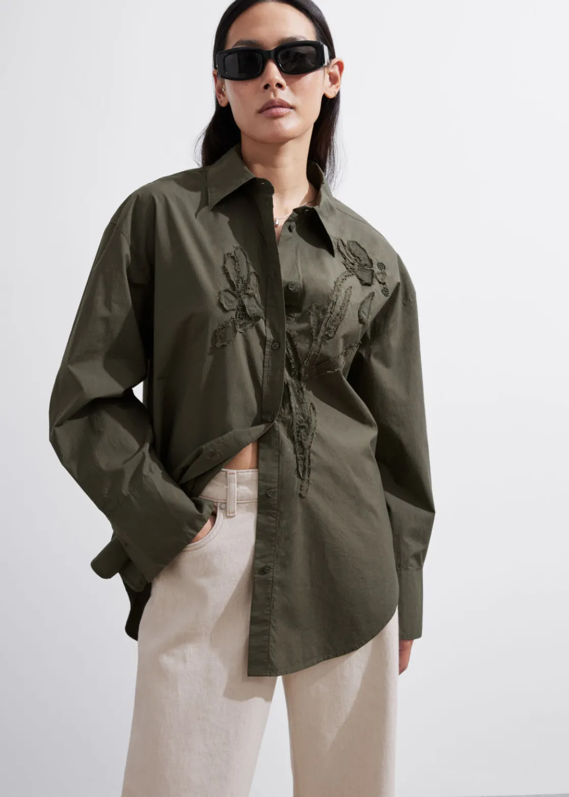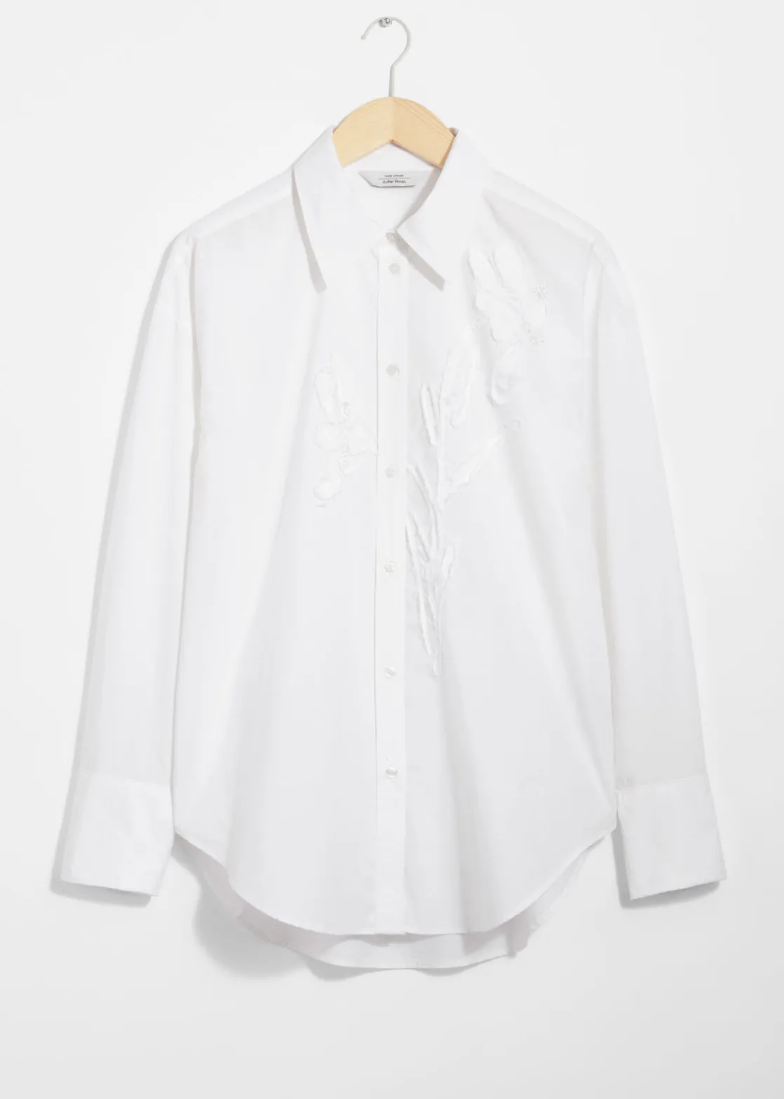 Long-sleeve shirt adorned with floral embroidery at the chest.
