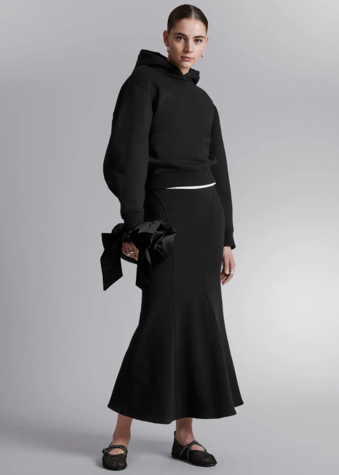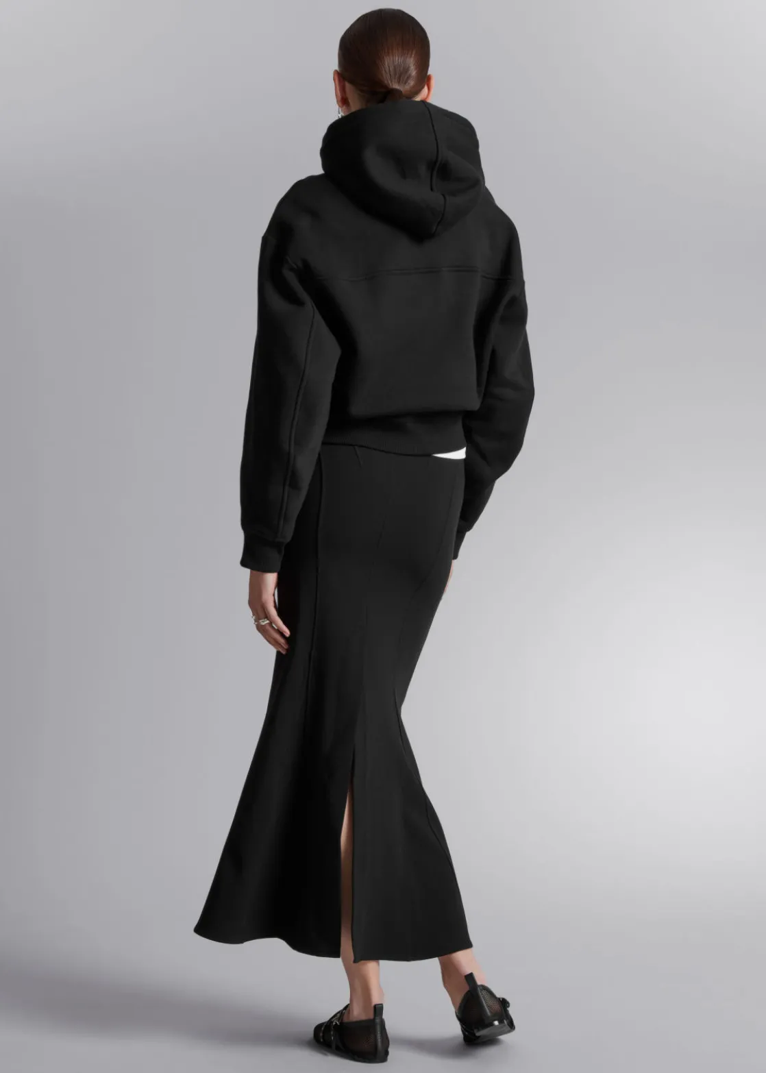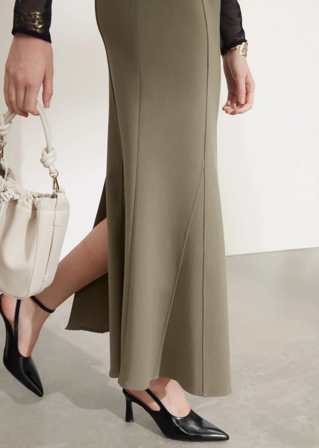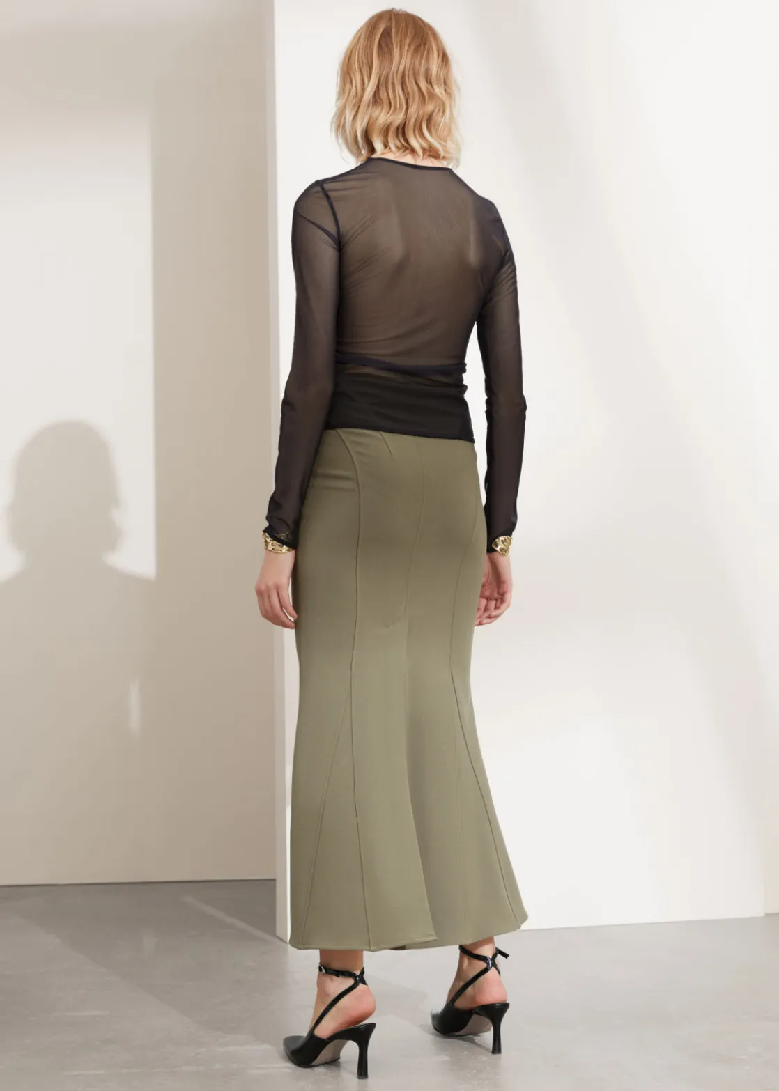 Maxi skirt designed with a figure-hugging fit before flaring out at the knee to a fluted hem.