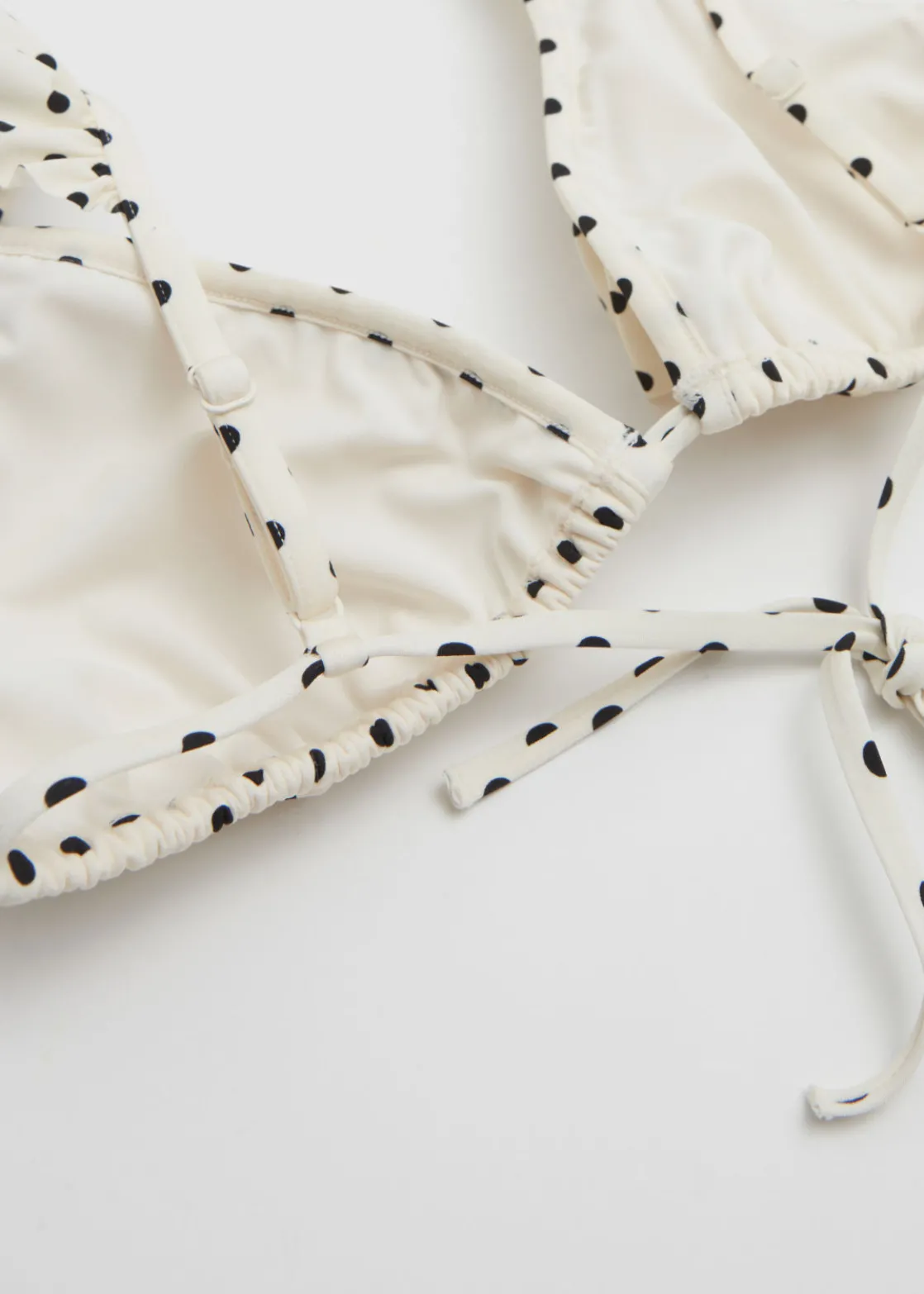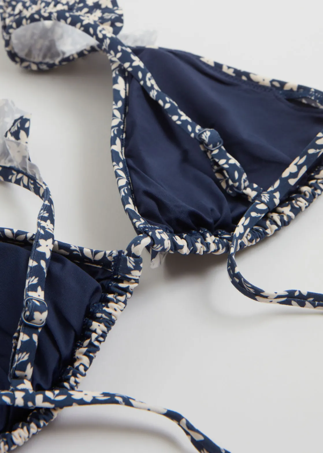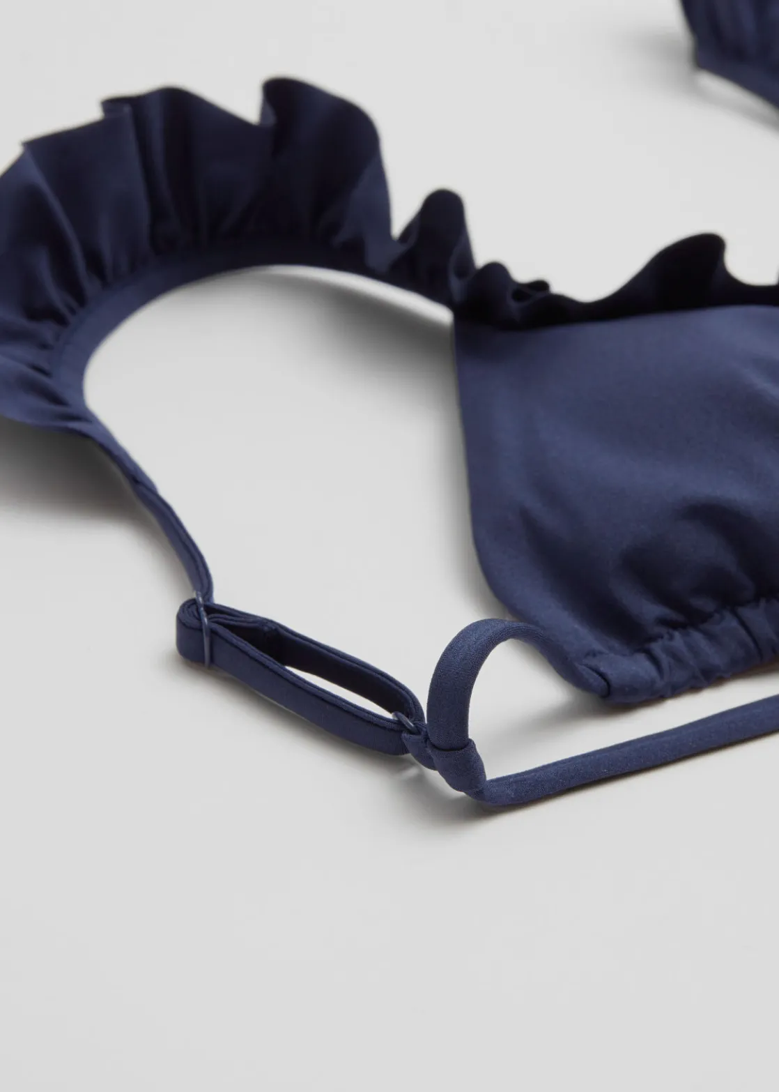 Frilled triangle bikini top featuring adjustable straps and light, removable padding.