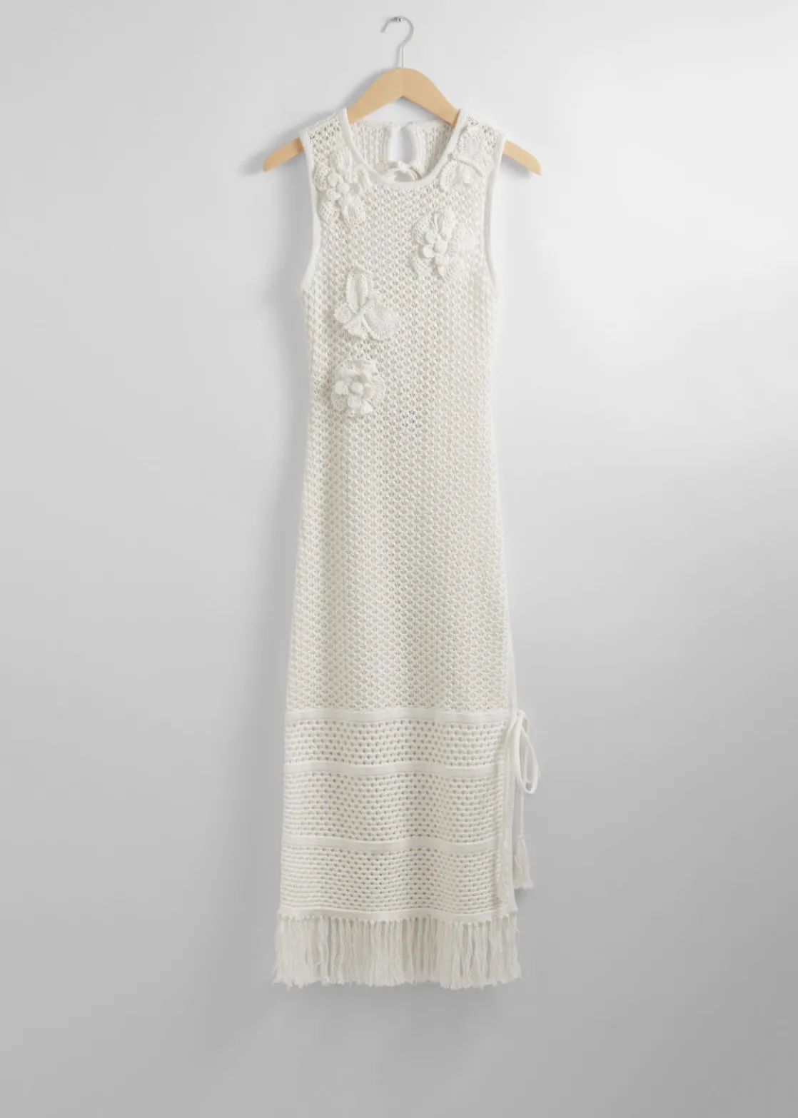 Crocheted midi dress detailed with floral appliqués and a fringed hemline.