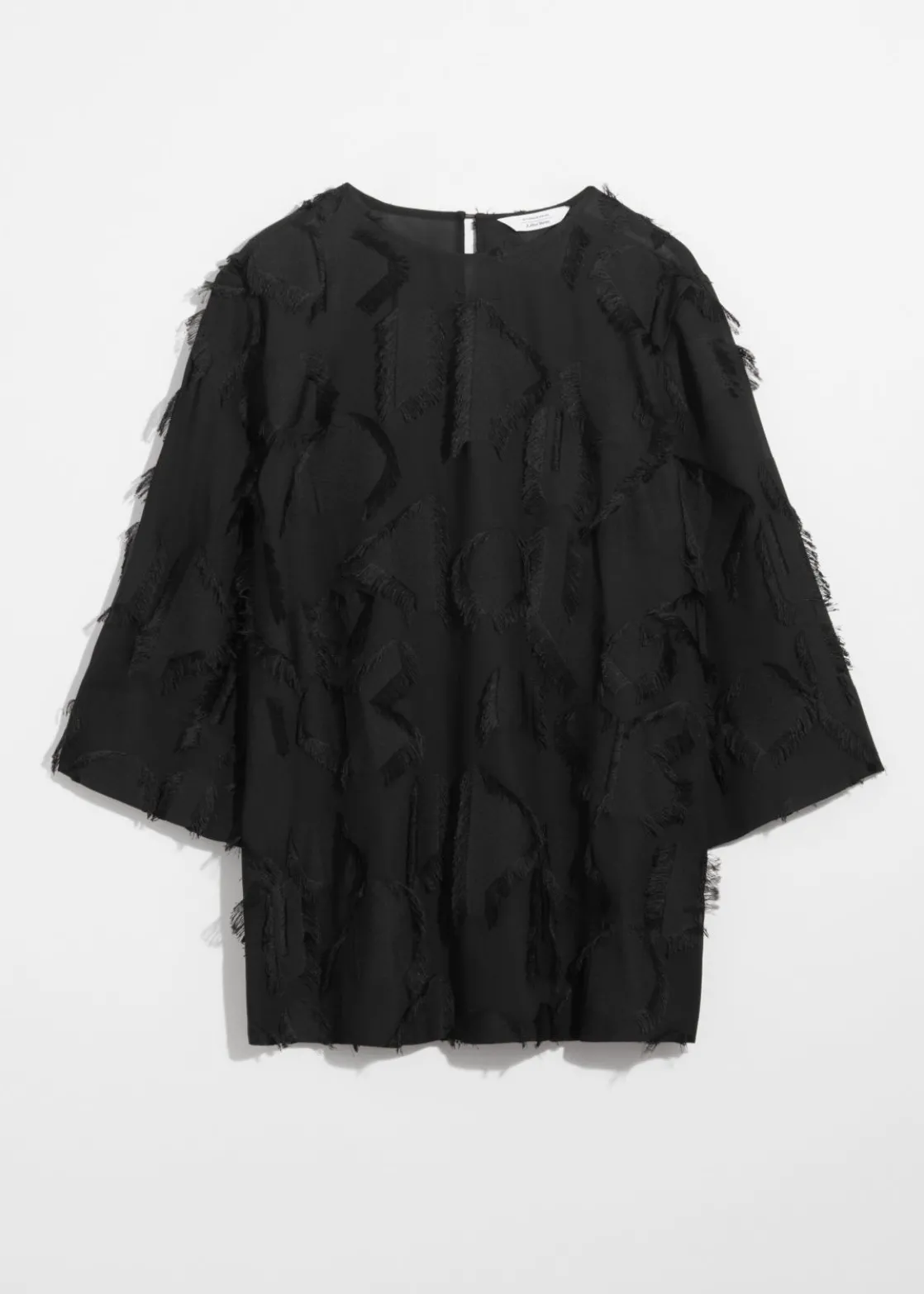 Oversized mini tunic dress featuring a boat neck and allover fringed detailing.