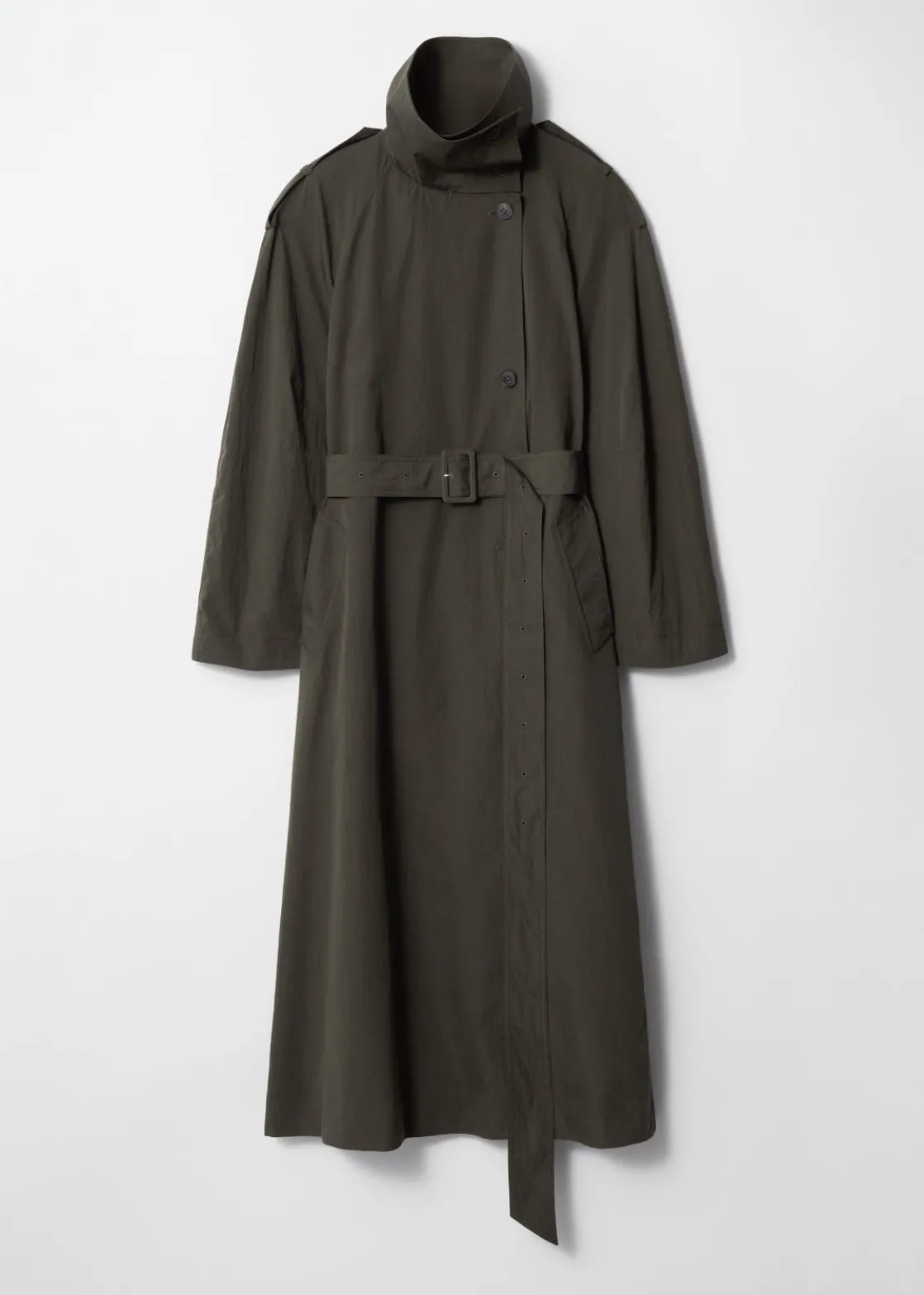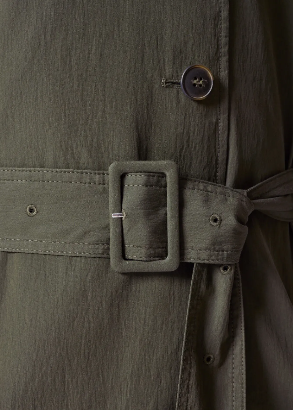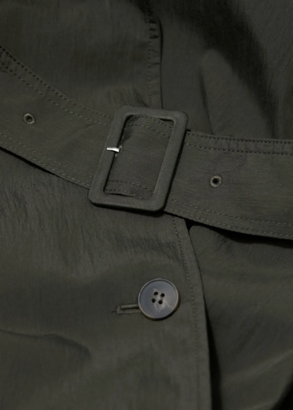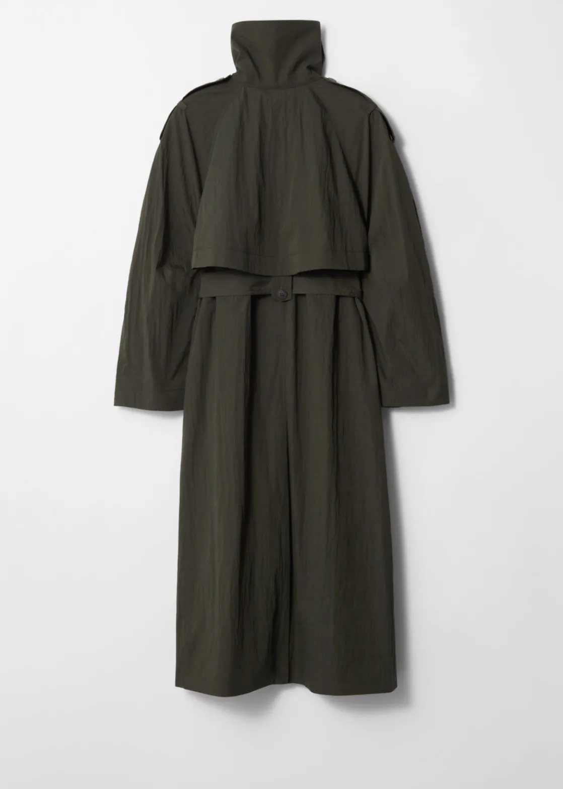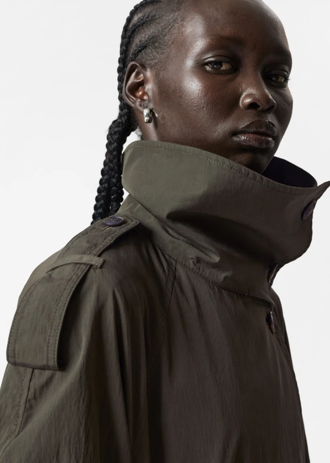 Trench coat featuring a high collar and classic detailing including a tonal buckle belt and shoulder epaulettes.