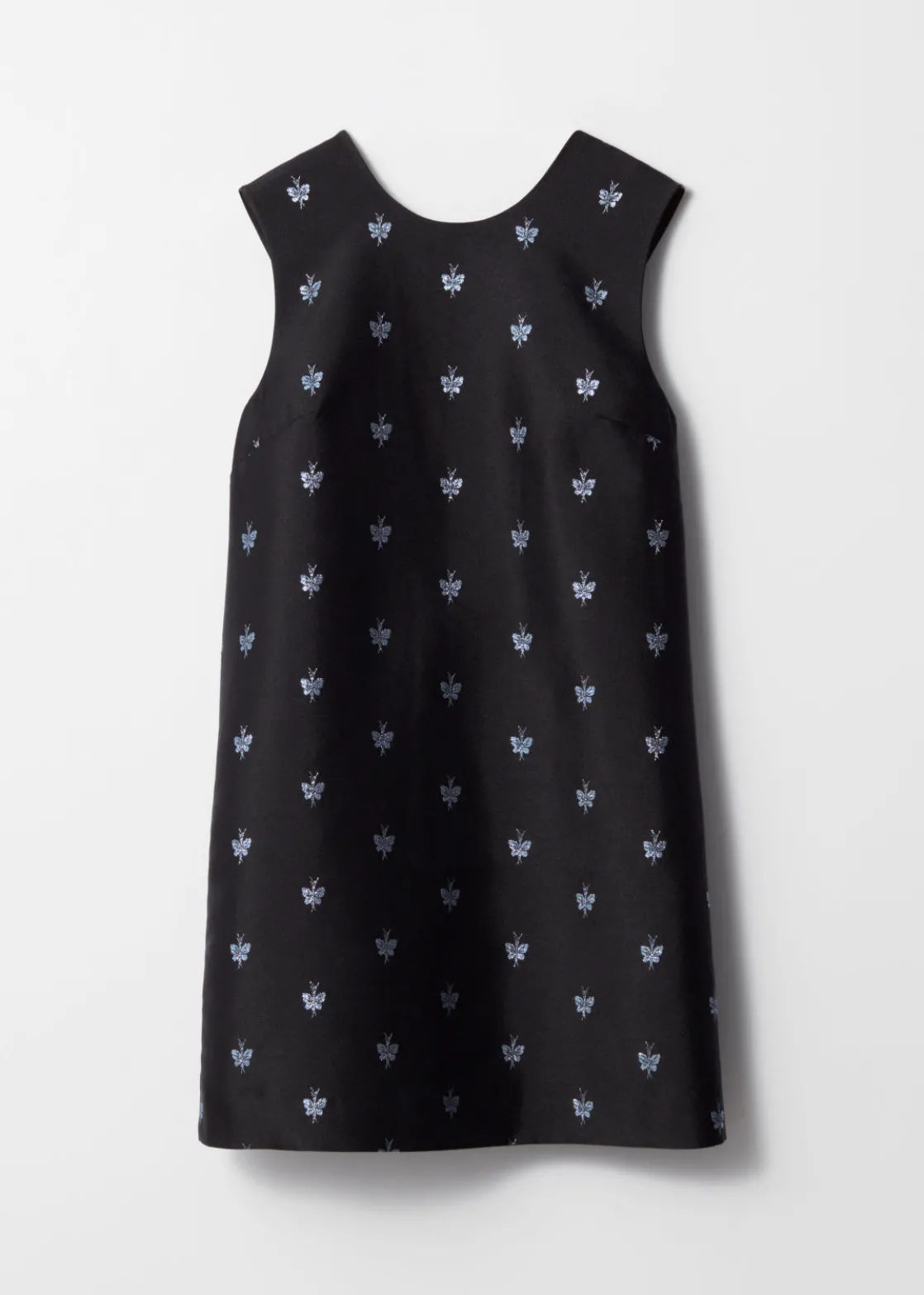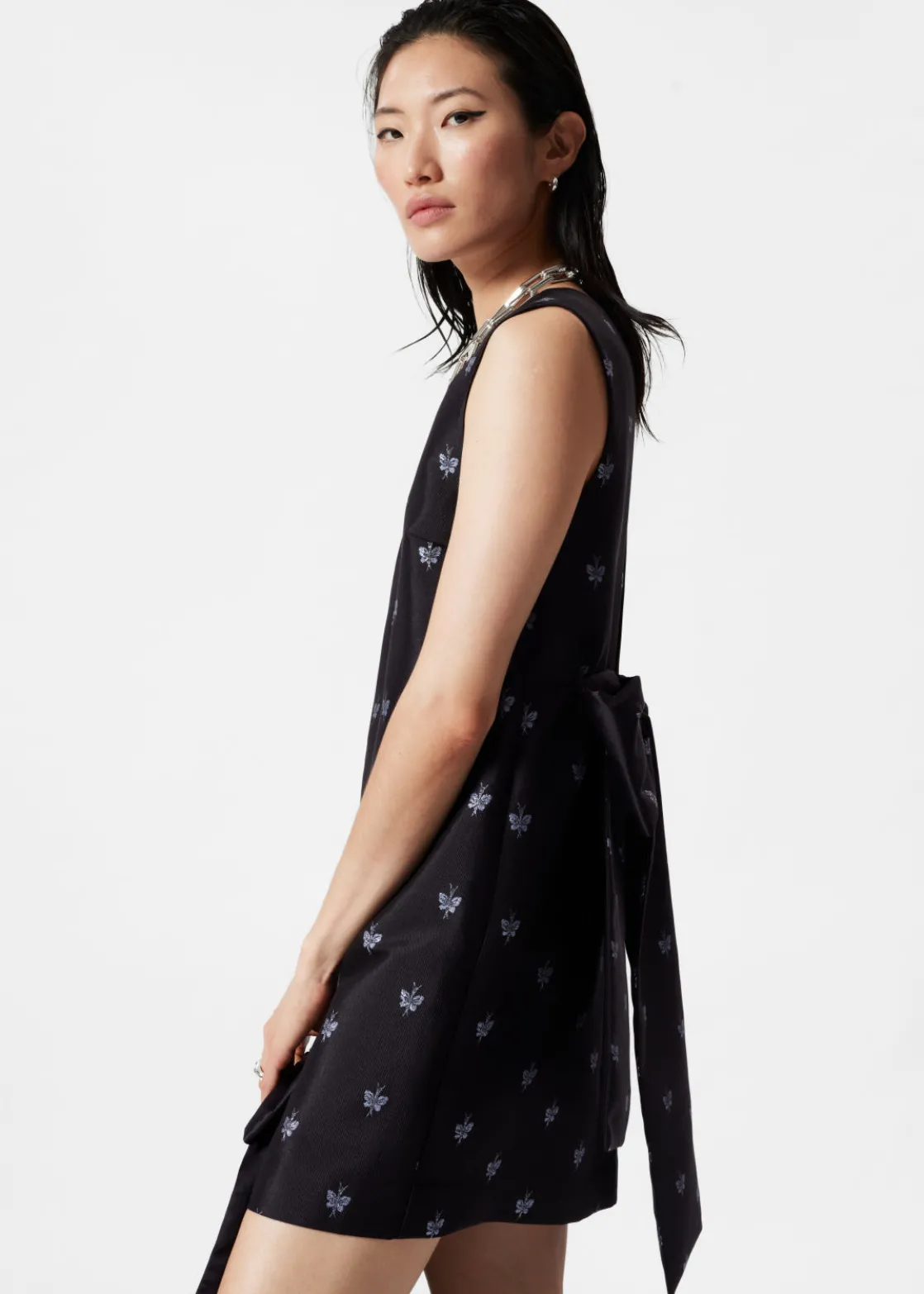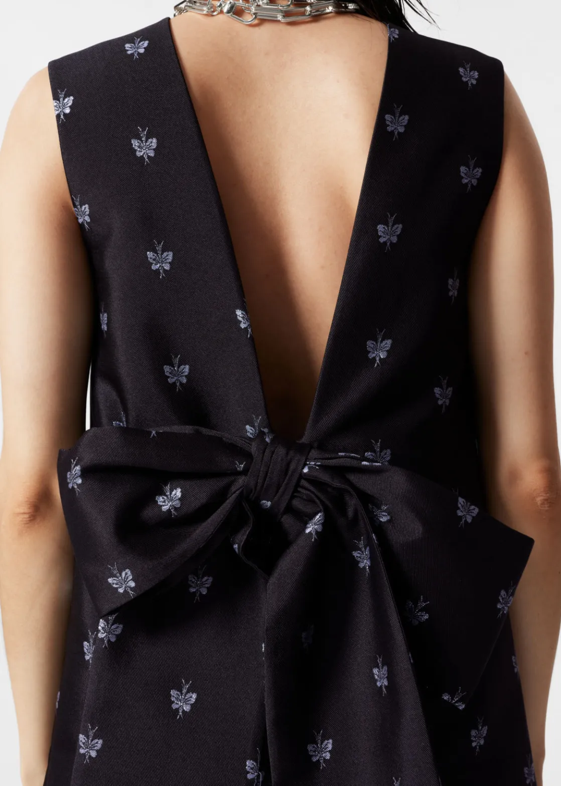 Mini dress with a metallised jacquard pattern and a V-shaped bow at the back.