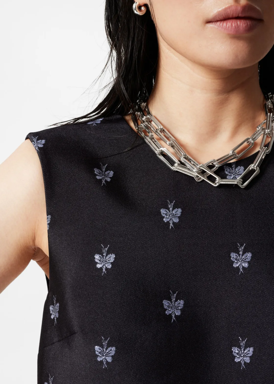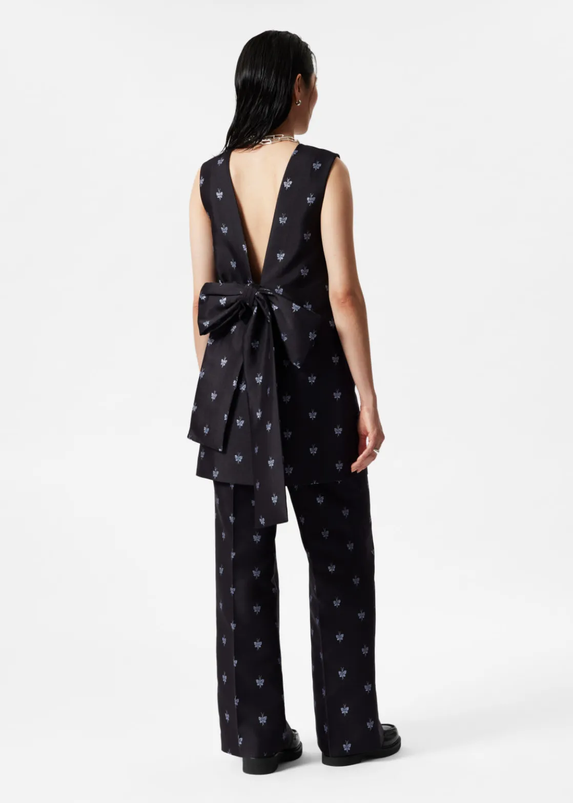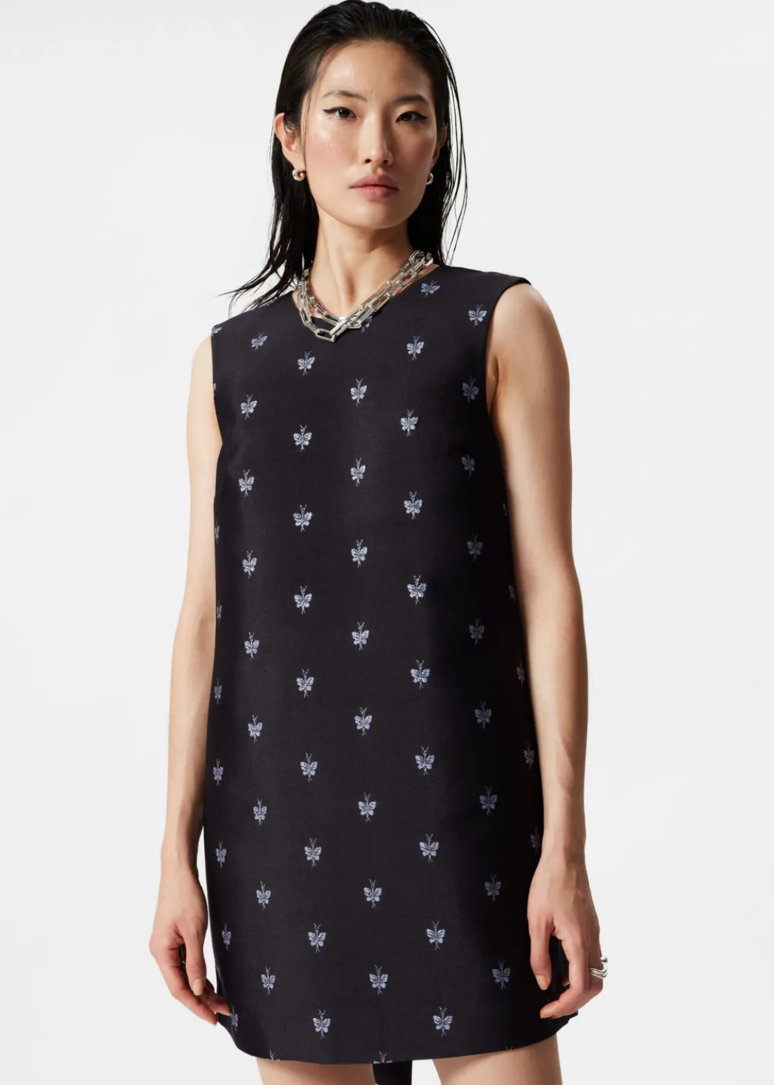 Mini dress with a metallised jacquard pattern and a V-shaped bow at the back.