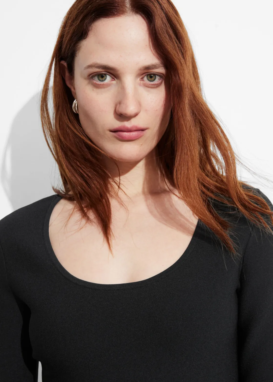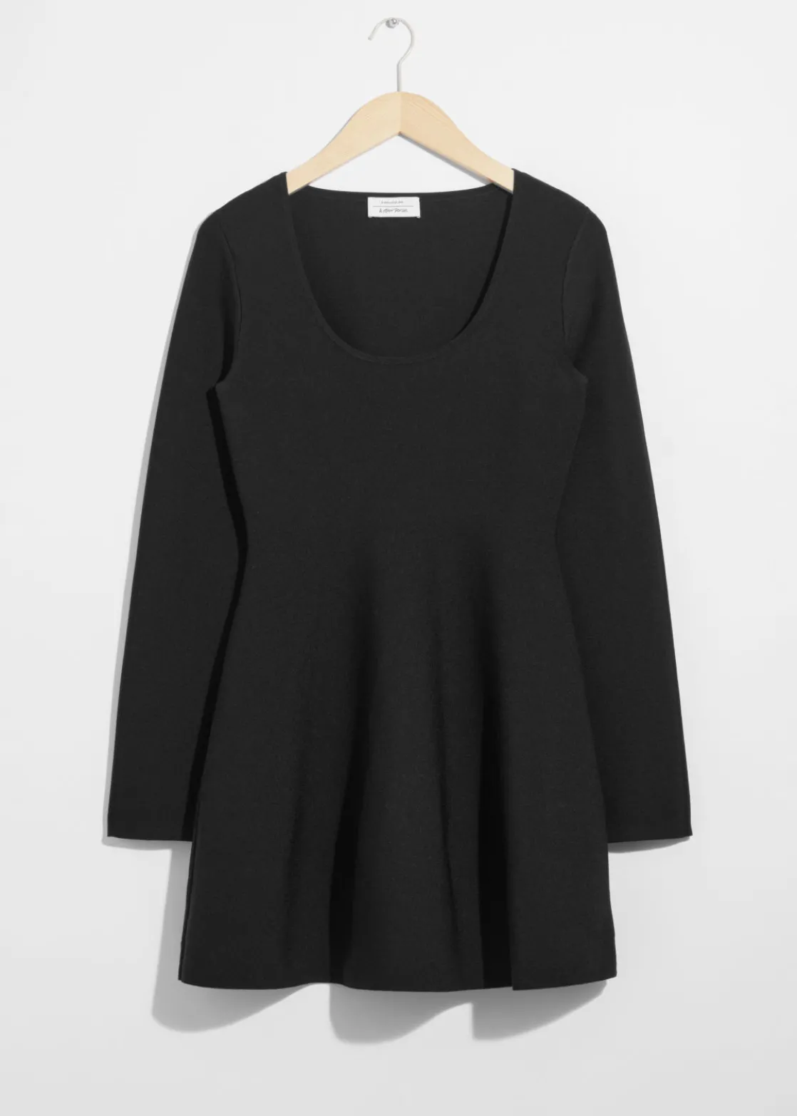 Knitted mini dress featuring a deep neckline and a peplum hemline.