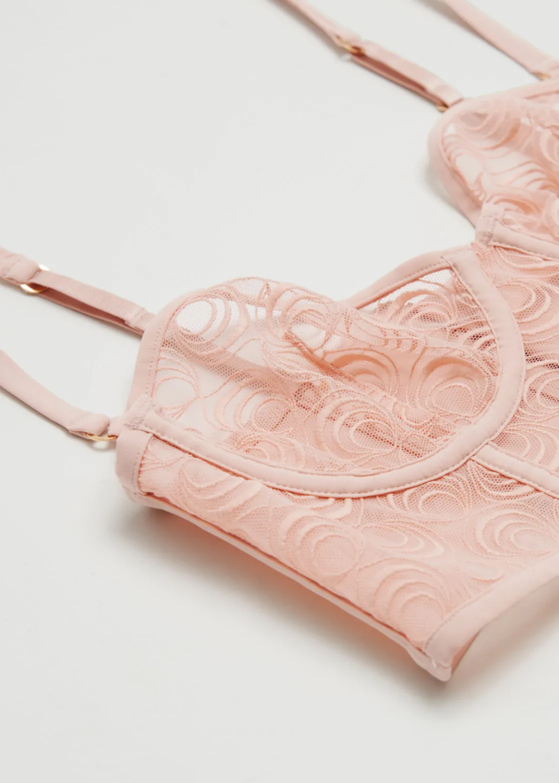 Bustier bra cut in delicate stretchy lace featuring semi-sheer, unlined cups that frame your curves and underwire and boning at the sides granting support and comfort. Finished with adjustable straps and back hook closure.