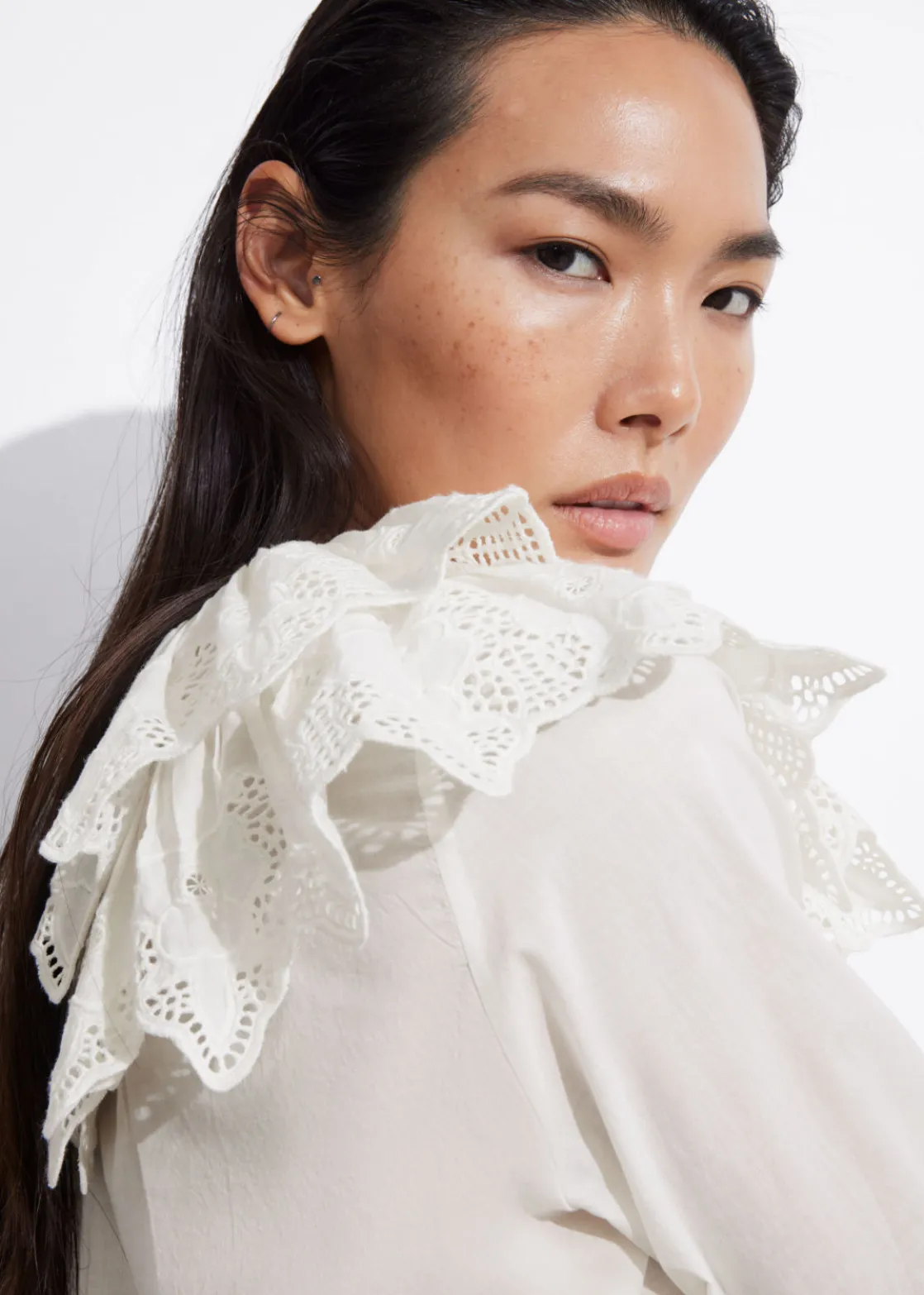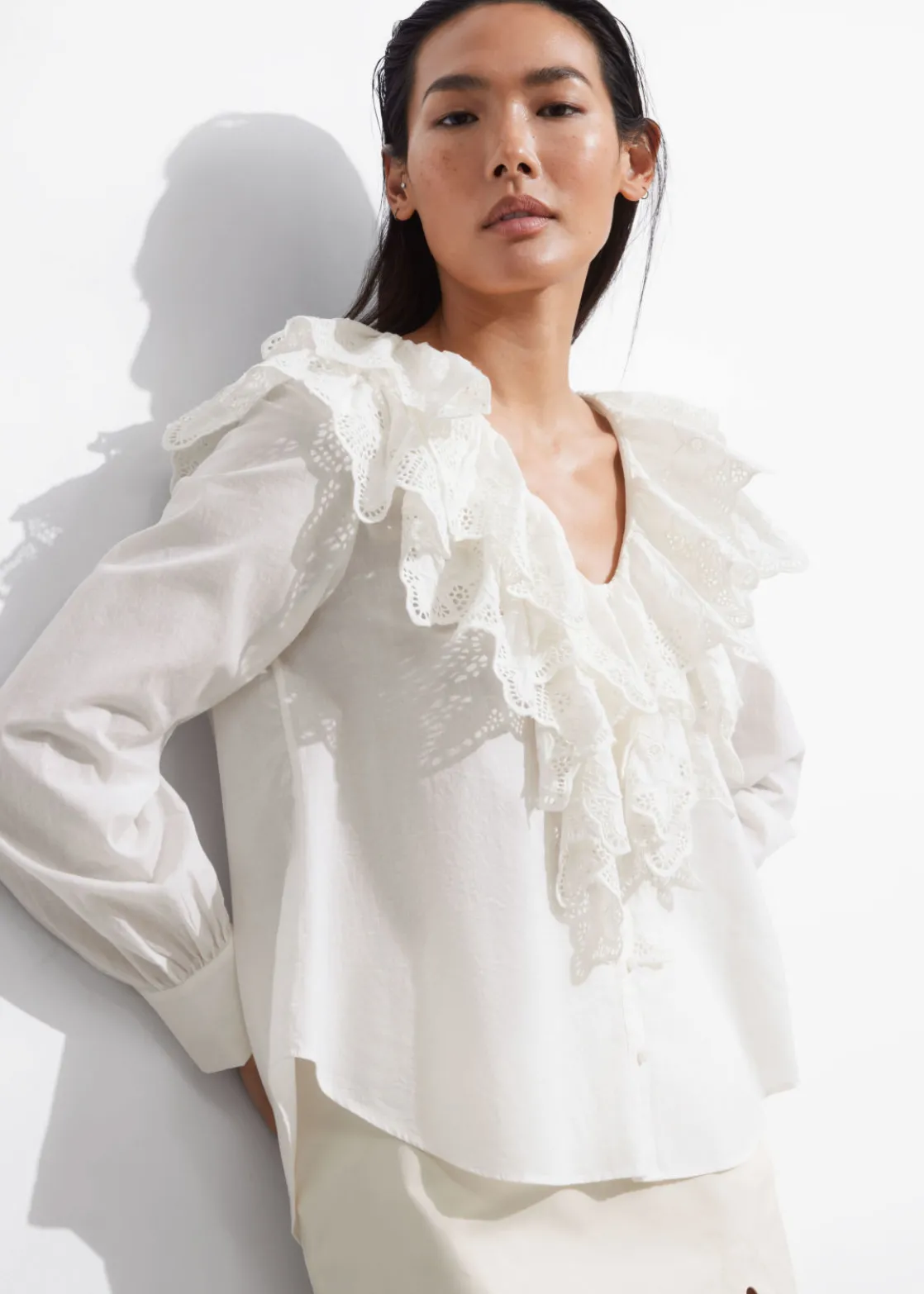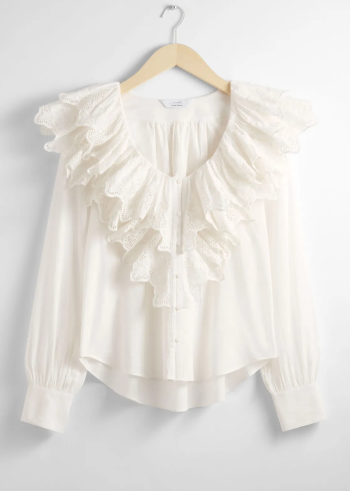Long-sleeve blouse featuring a v-cut neckline adorned with layered, embroidered ruffles.