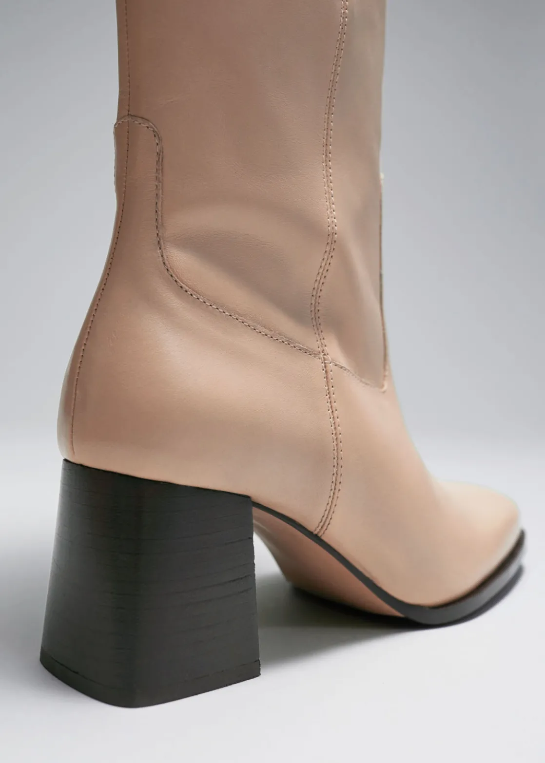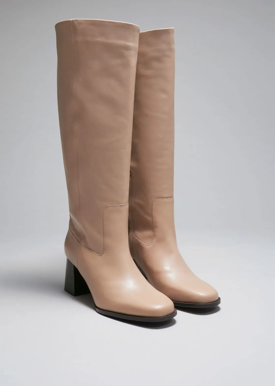 Classic knee boots in a polished smooth finish, featuring a mid-height comfortable block heel, elegant almond toe and a classic curved shaft. Finished with concealed side zippers.