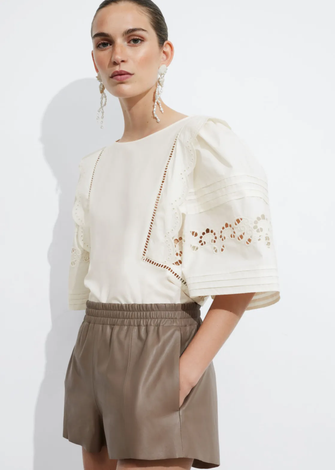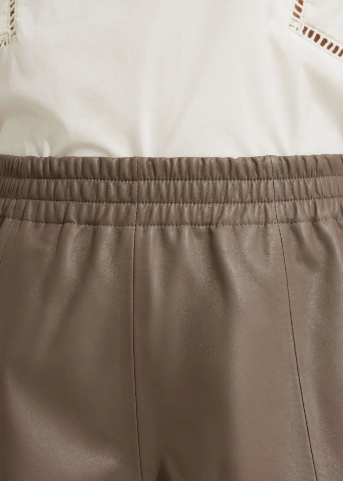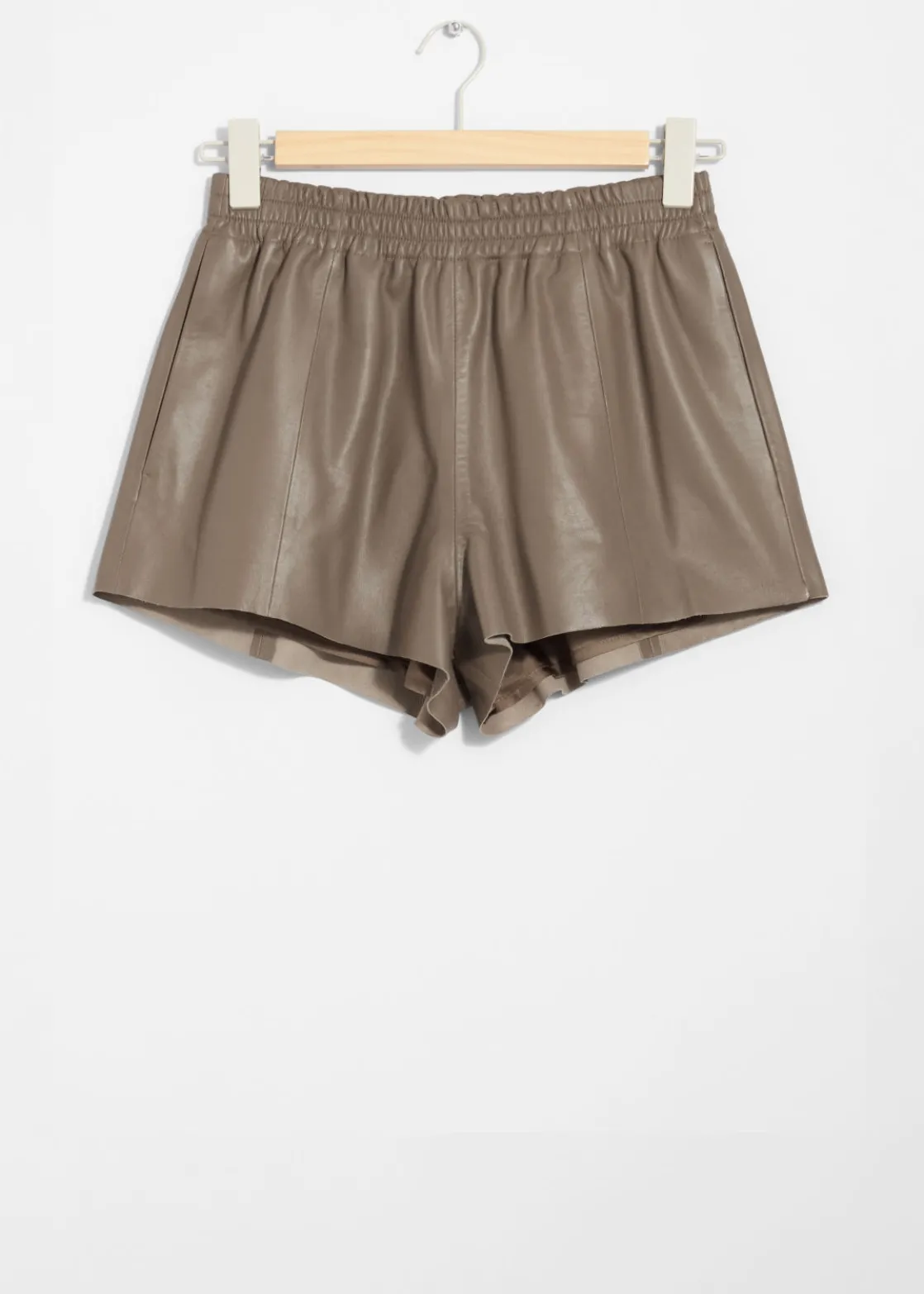 High-waist leather shorts featuring an elasticated waistline. Finished with duo side pockets and a raw-edge hemline.