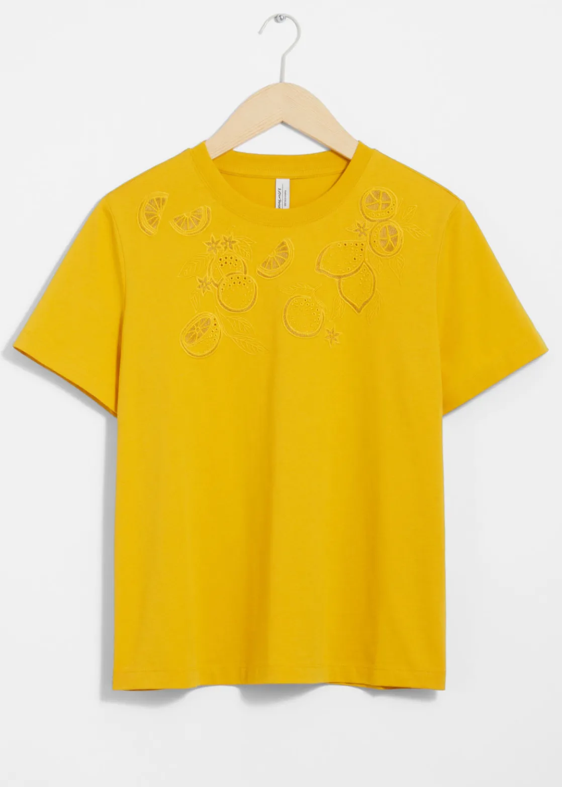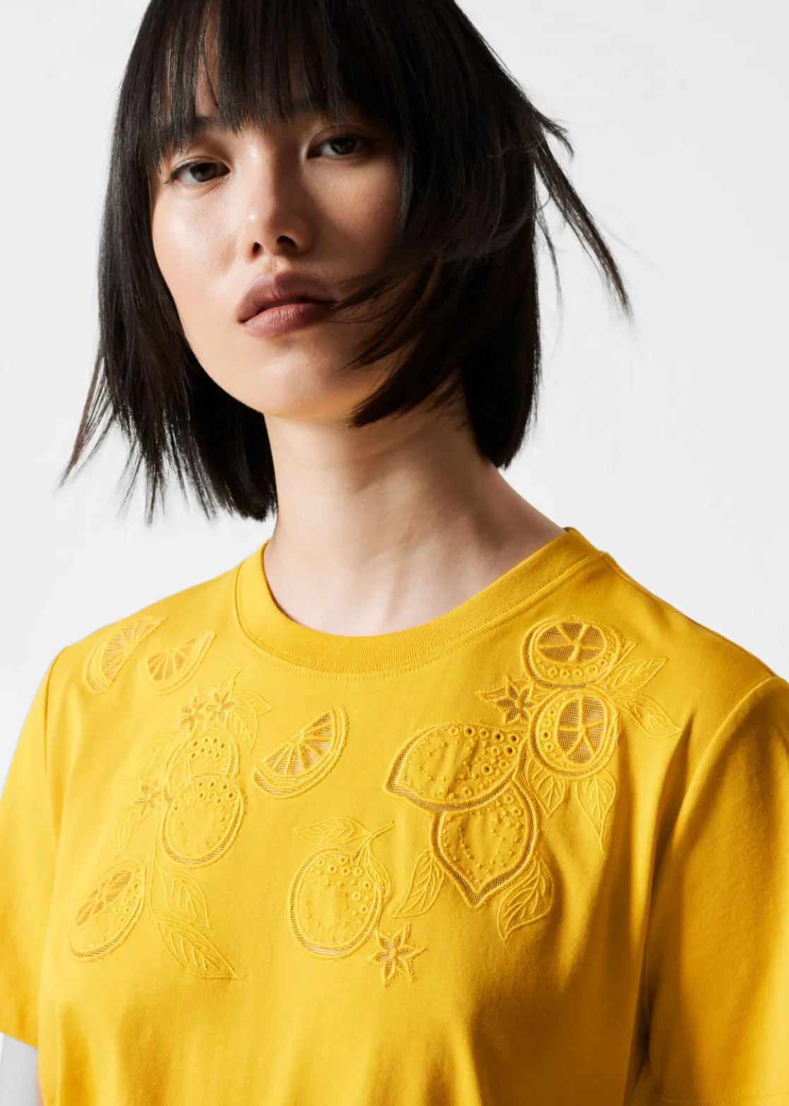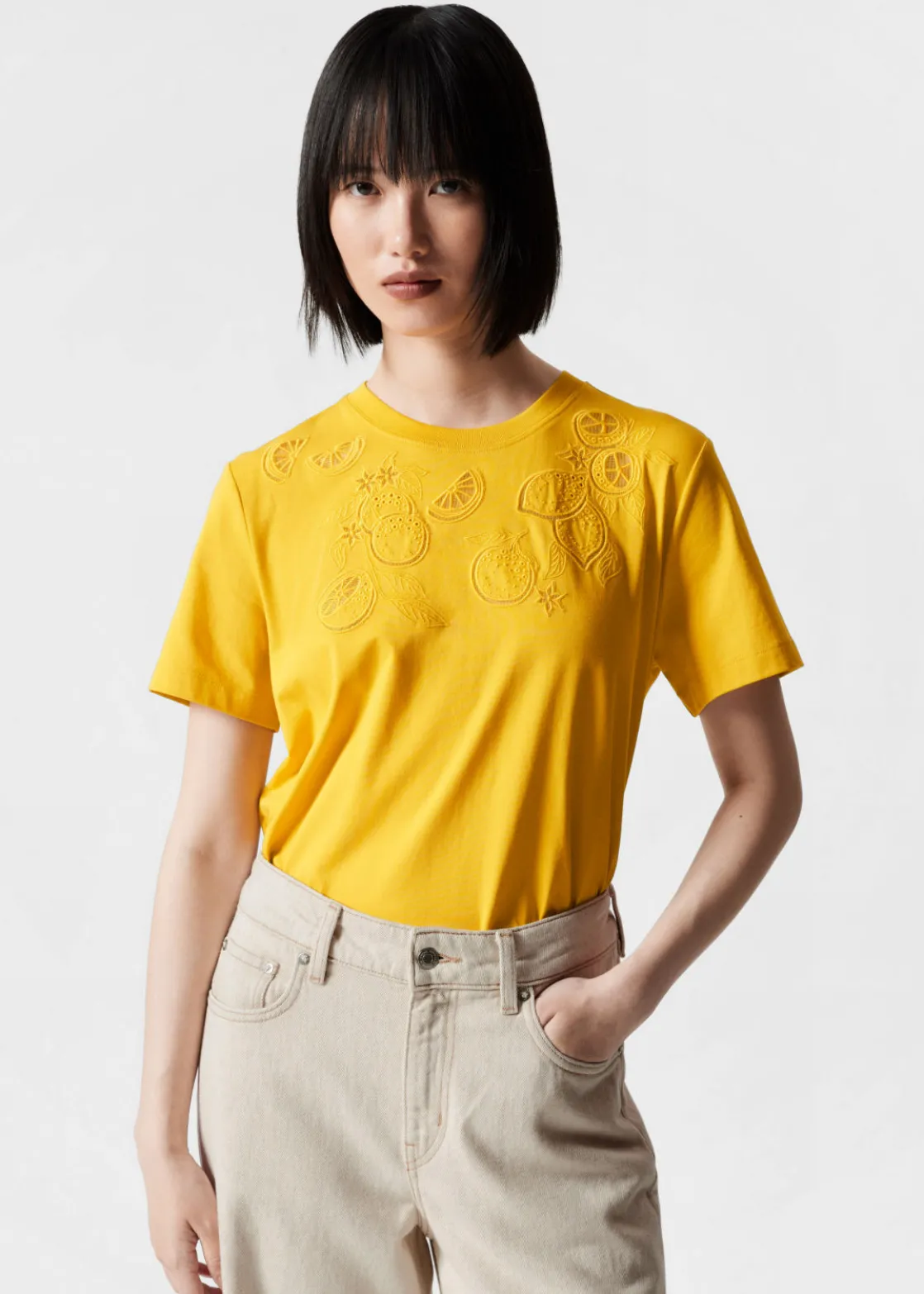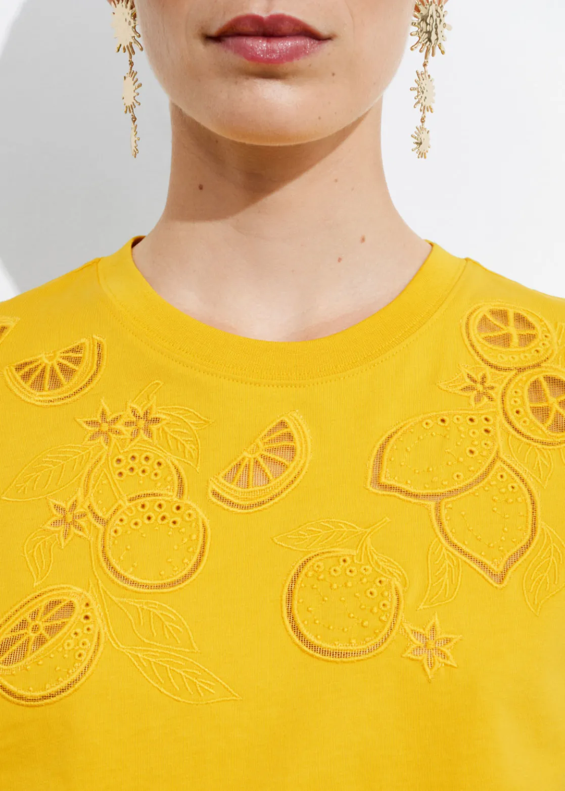 Crewneck t-shirt designed with lemon-inspired embroidery at the chest.
