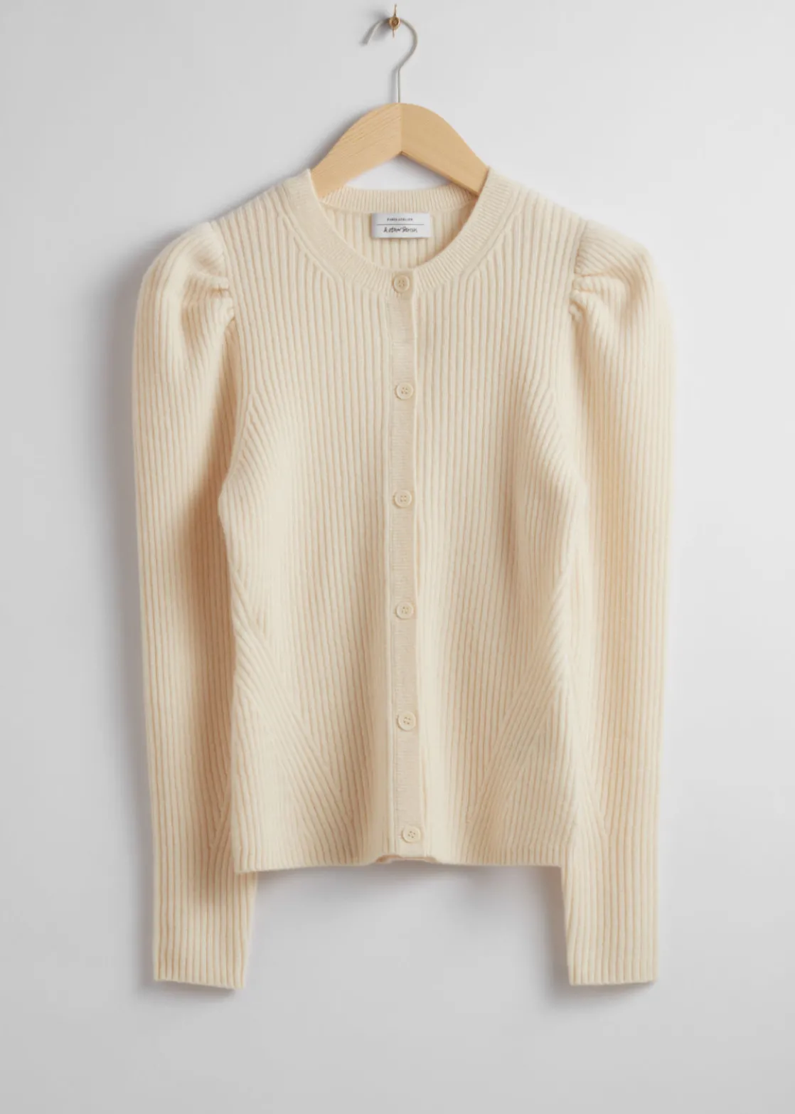 Ribbed puff sleeve cardigan knitted from merino wool. Traced with tonal button closures.