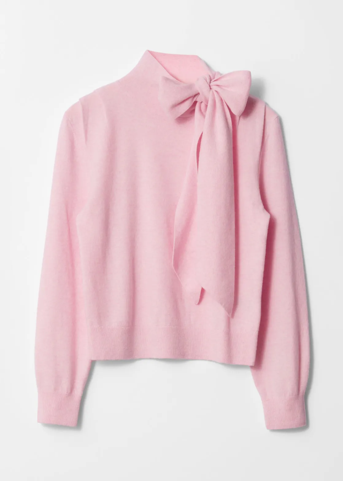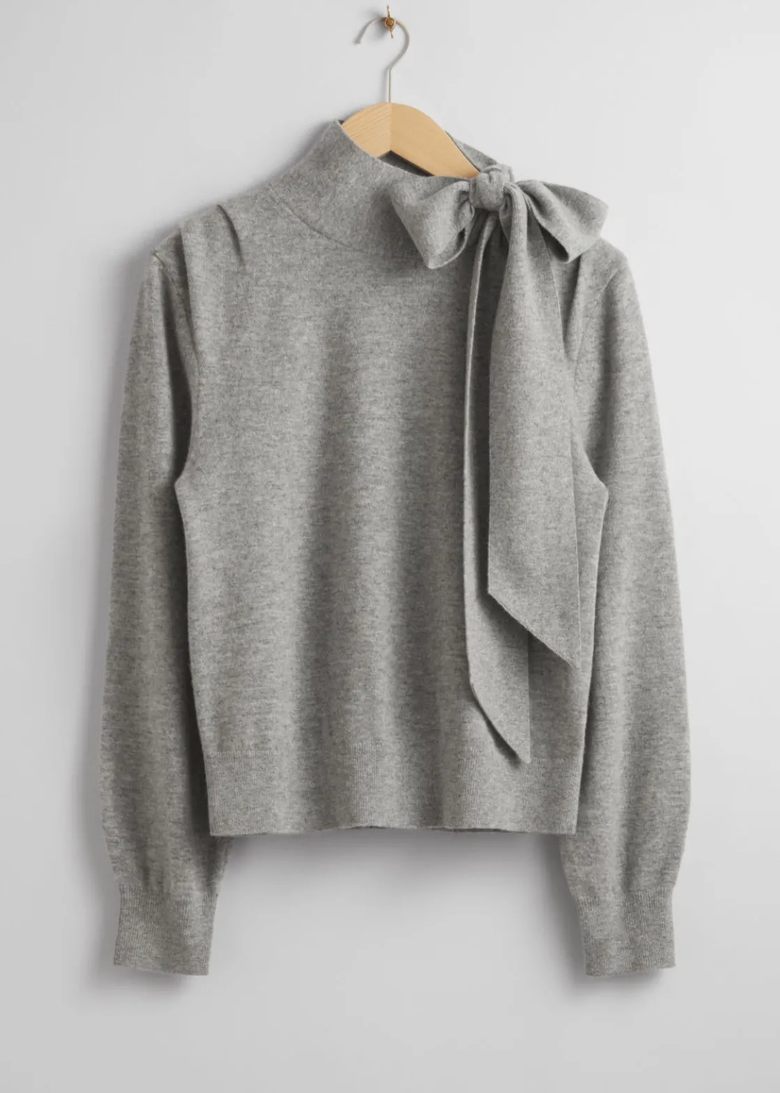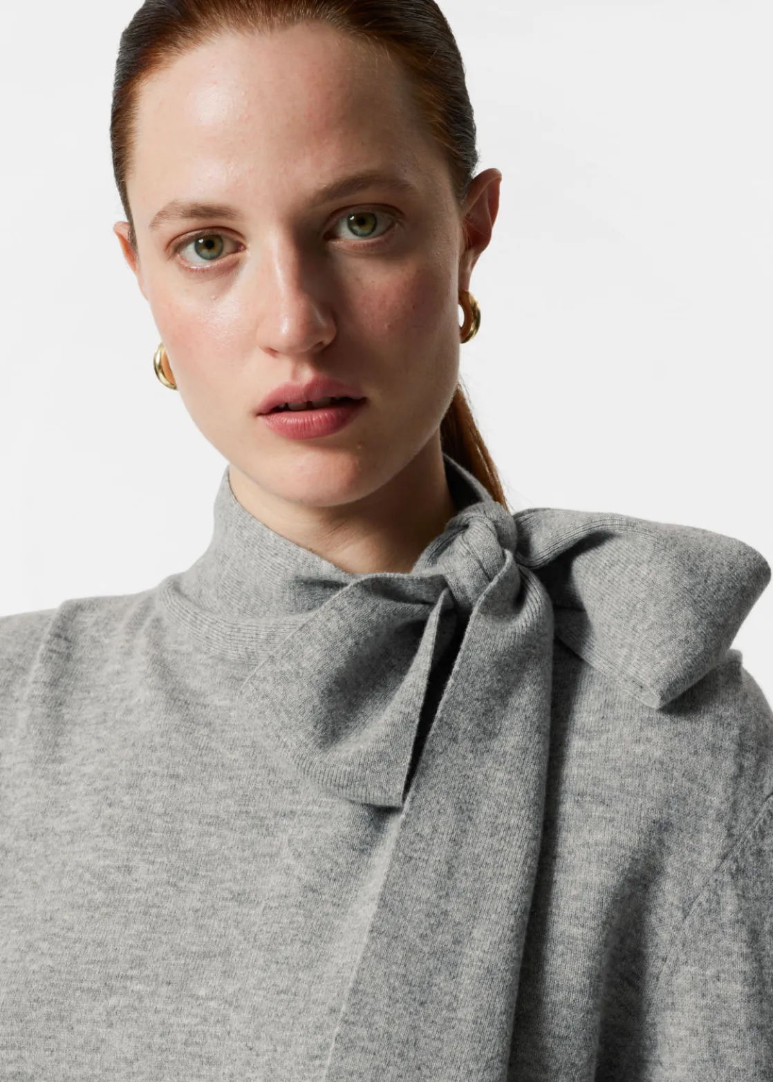 Mock neck sweater knitted from merino wool. Finished with a tonal bow-detail at the neck.