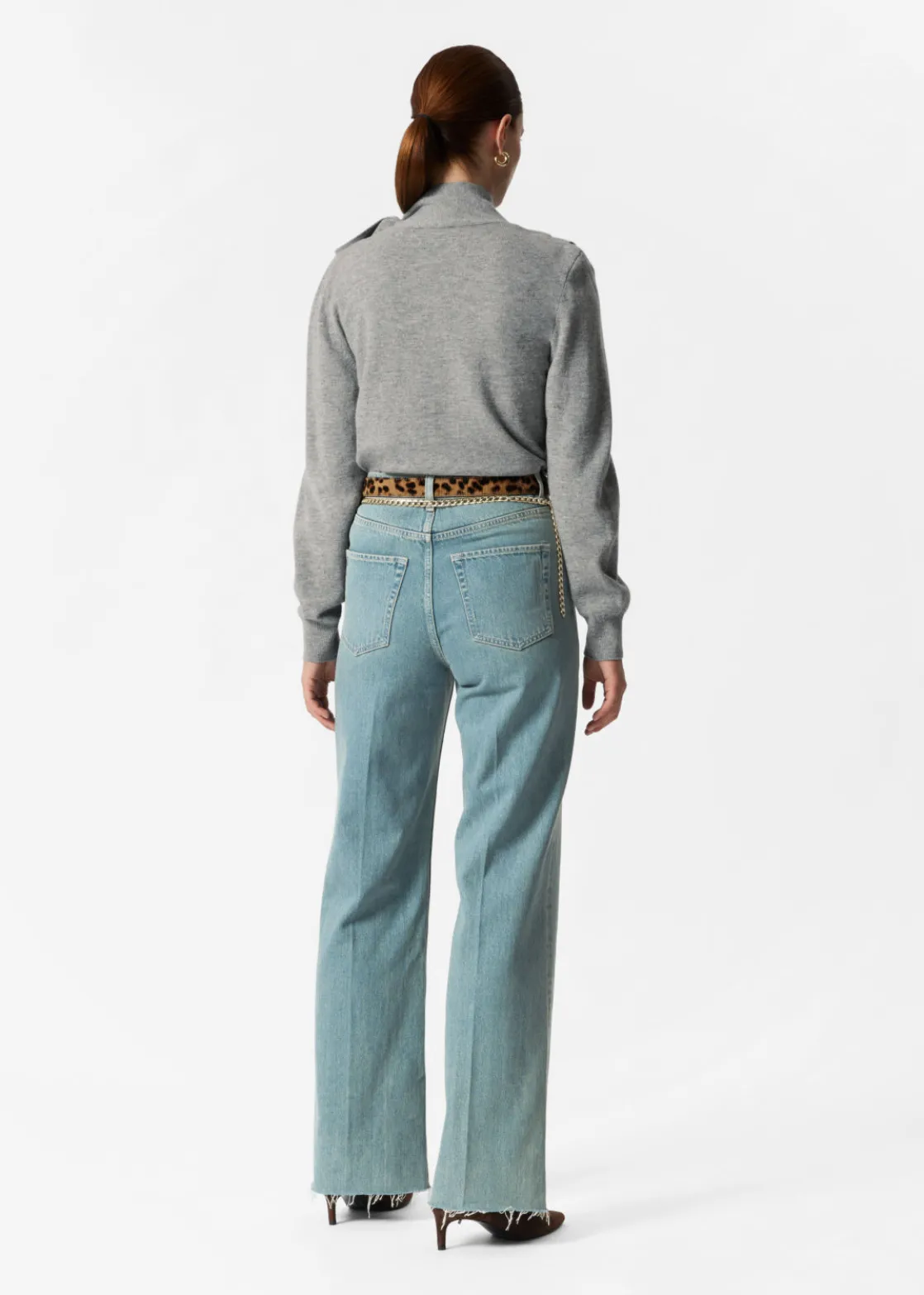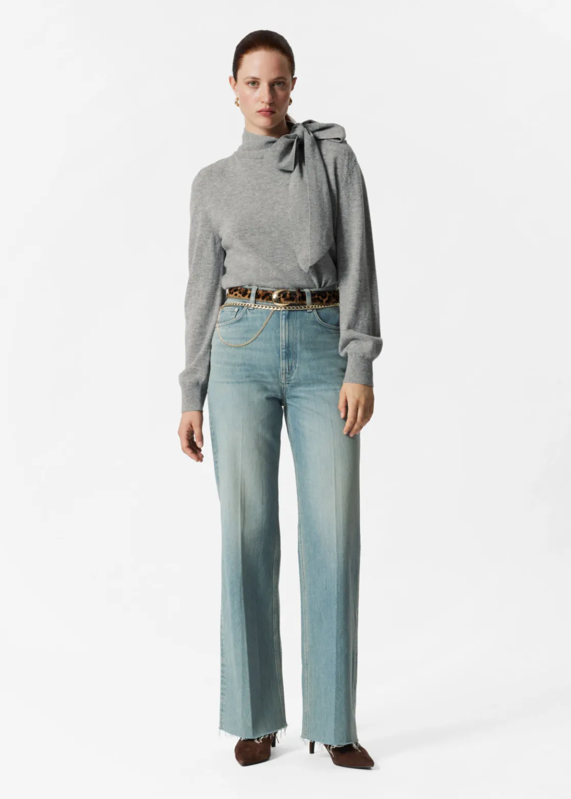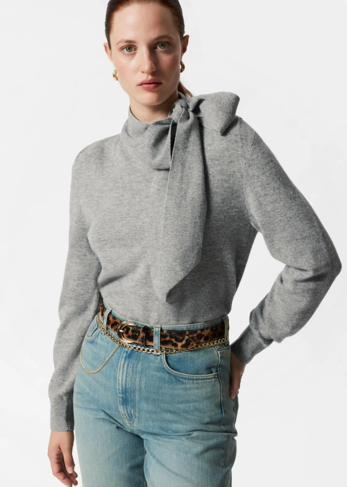 Mock neck sweater knitted from merino wool. Finished with a tonal bow-detail at the neck.