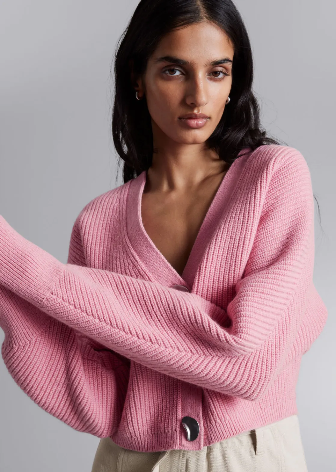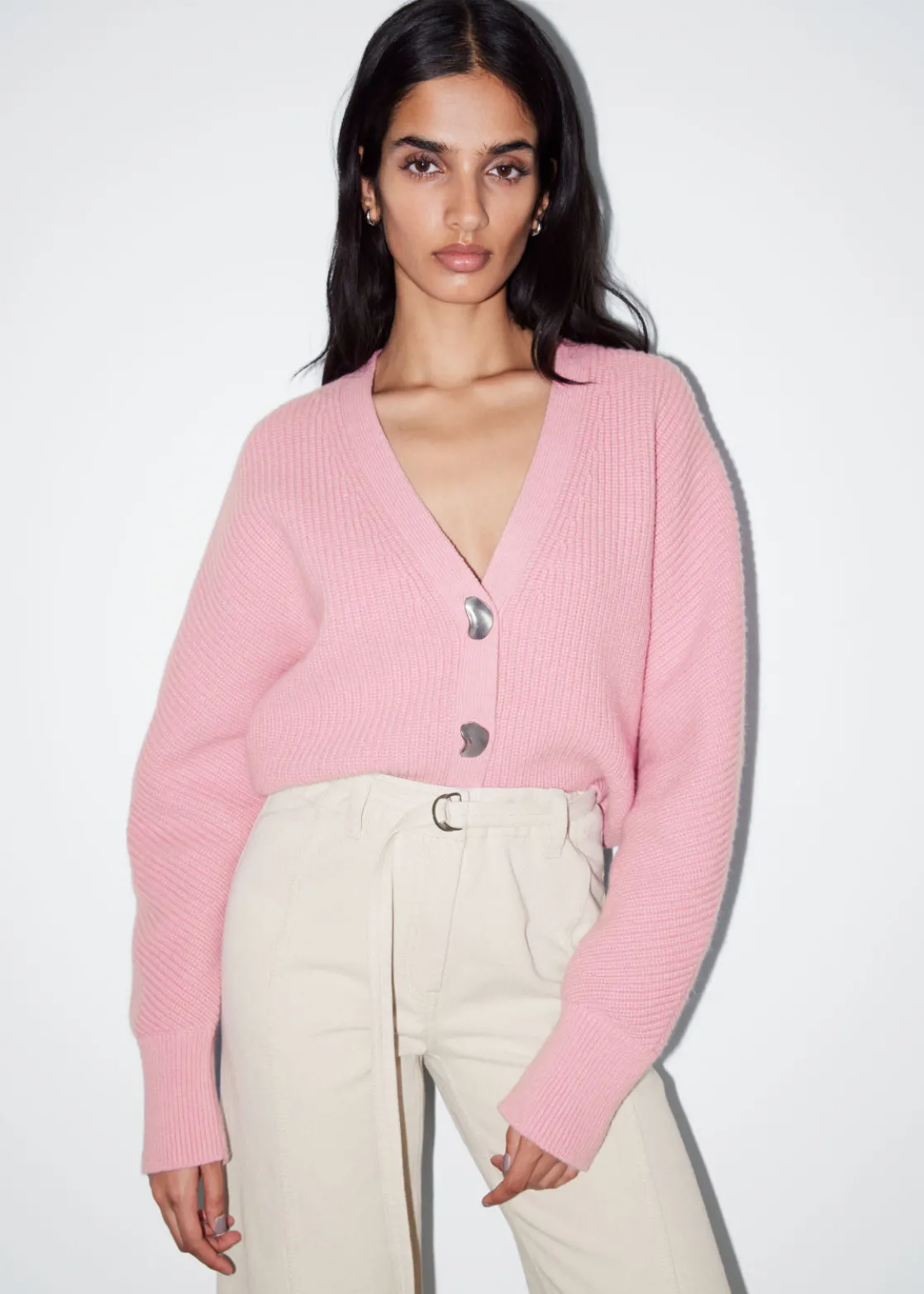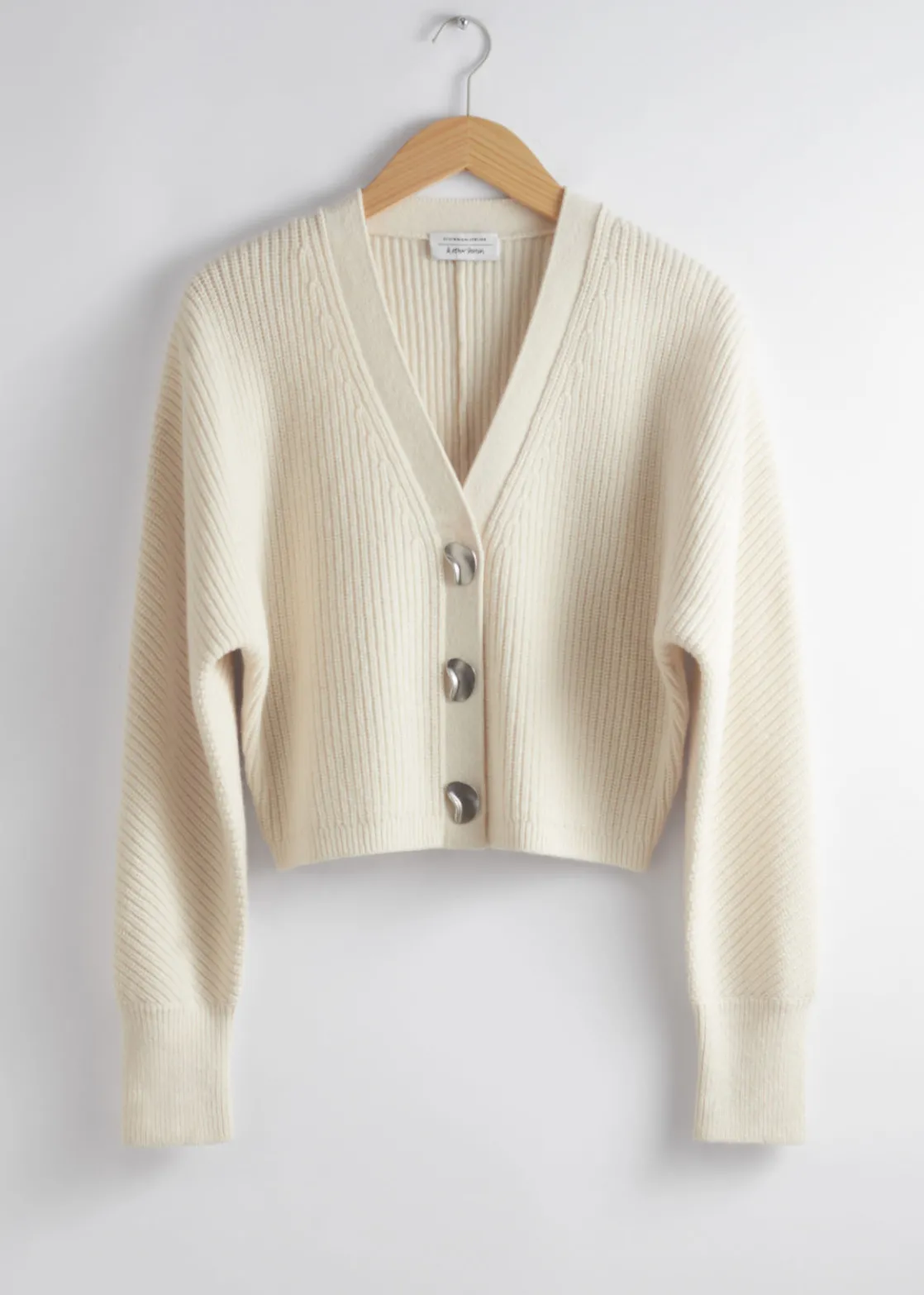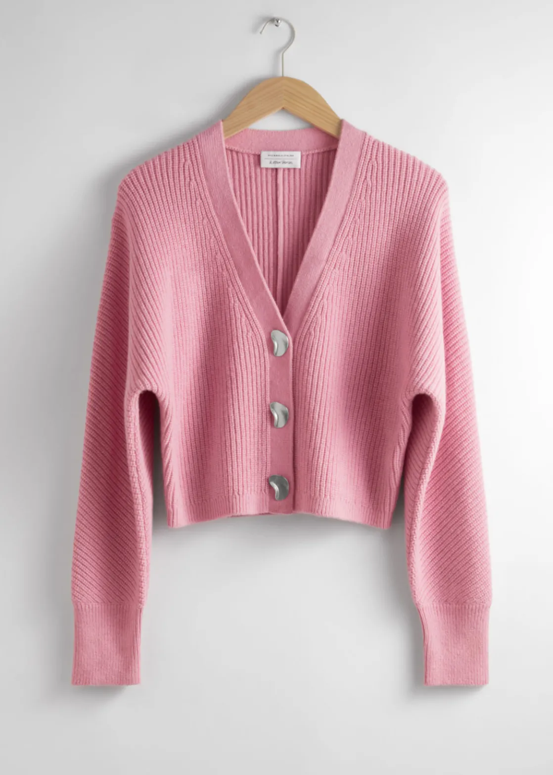Rib-knit cardigan traced with three metal buttons in organic shapes.