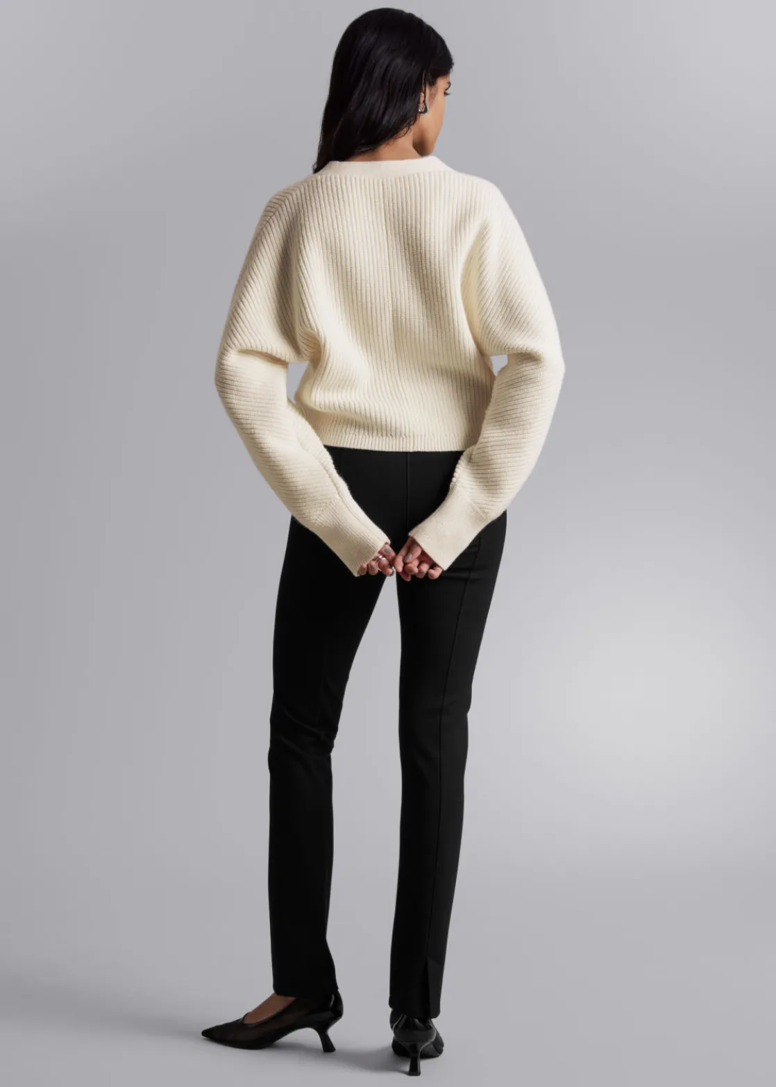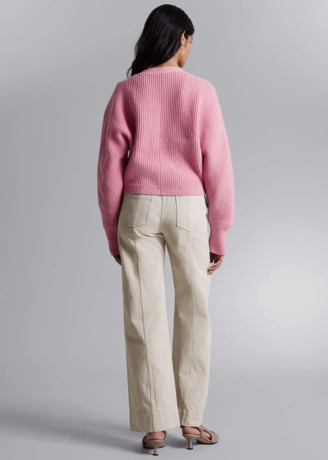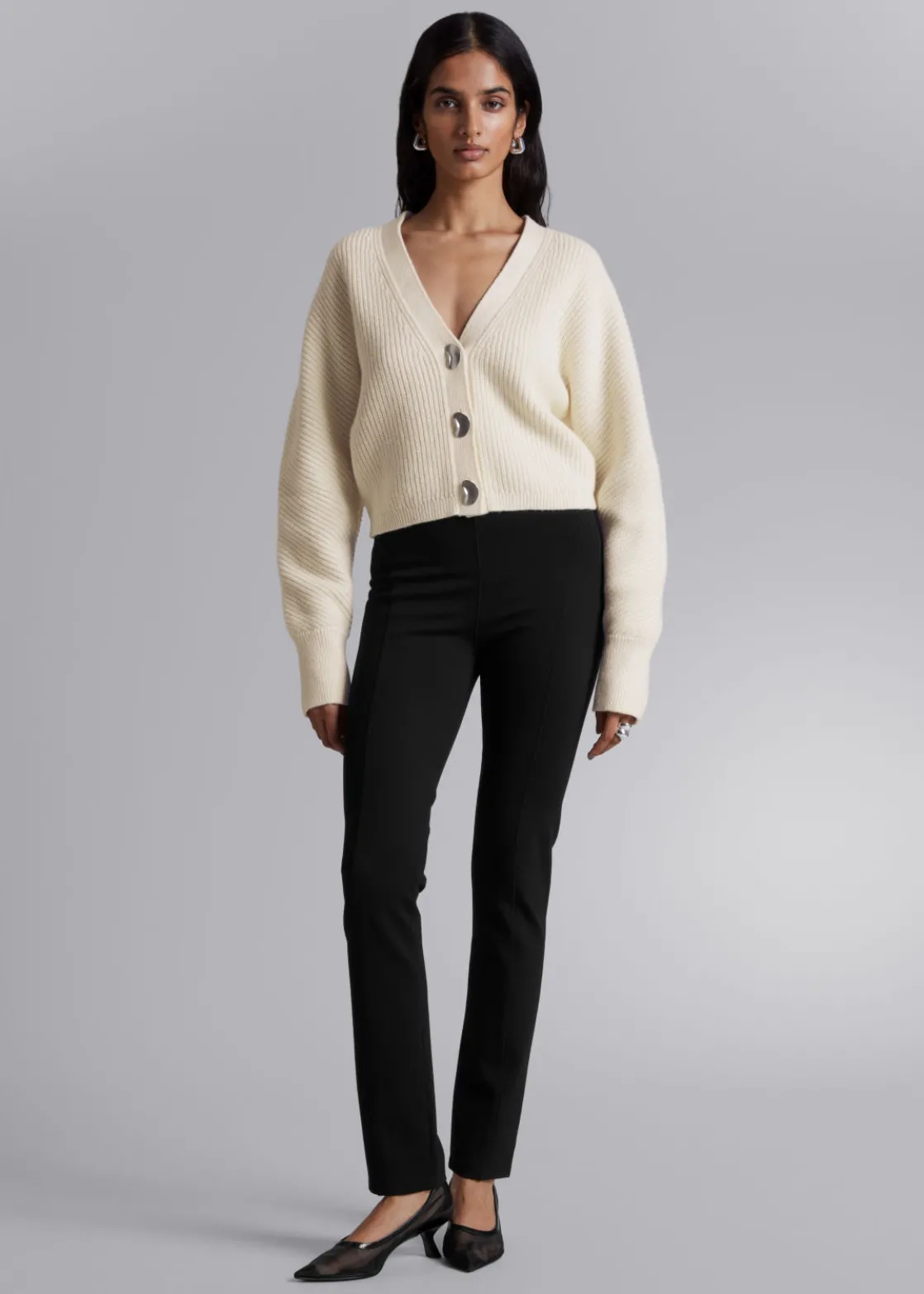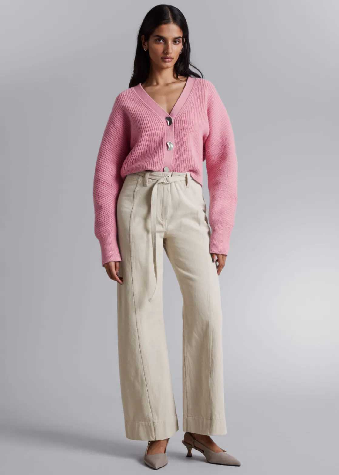 Rib-knit cardigan traced with three metal buttons in organic shapes.