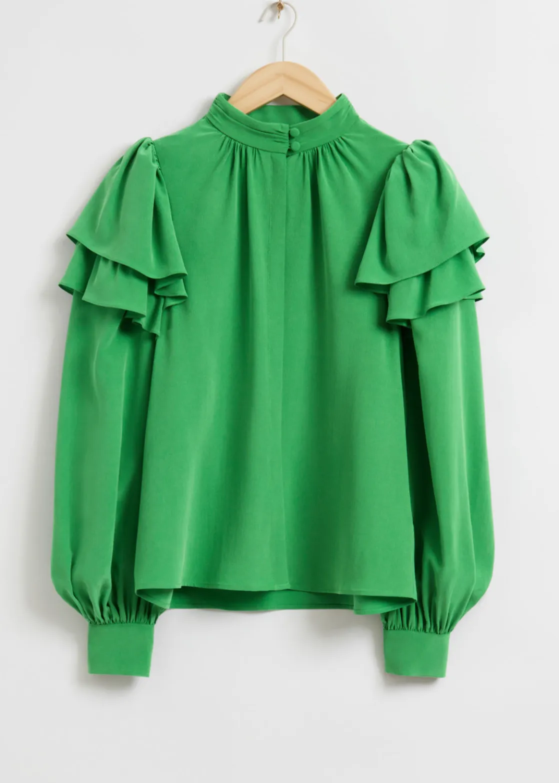 Voluminous mulberry silk shirt featuring layered frilled tiers and puff sleeves with buttoned gathered mock neck and concealed buttoned closure.